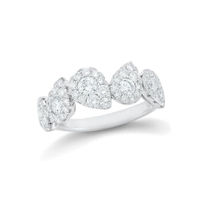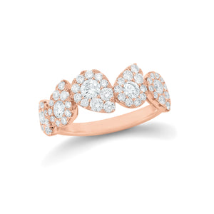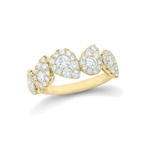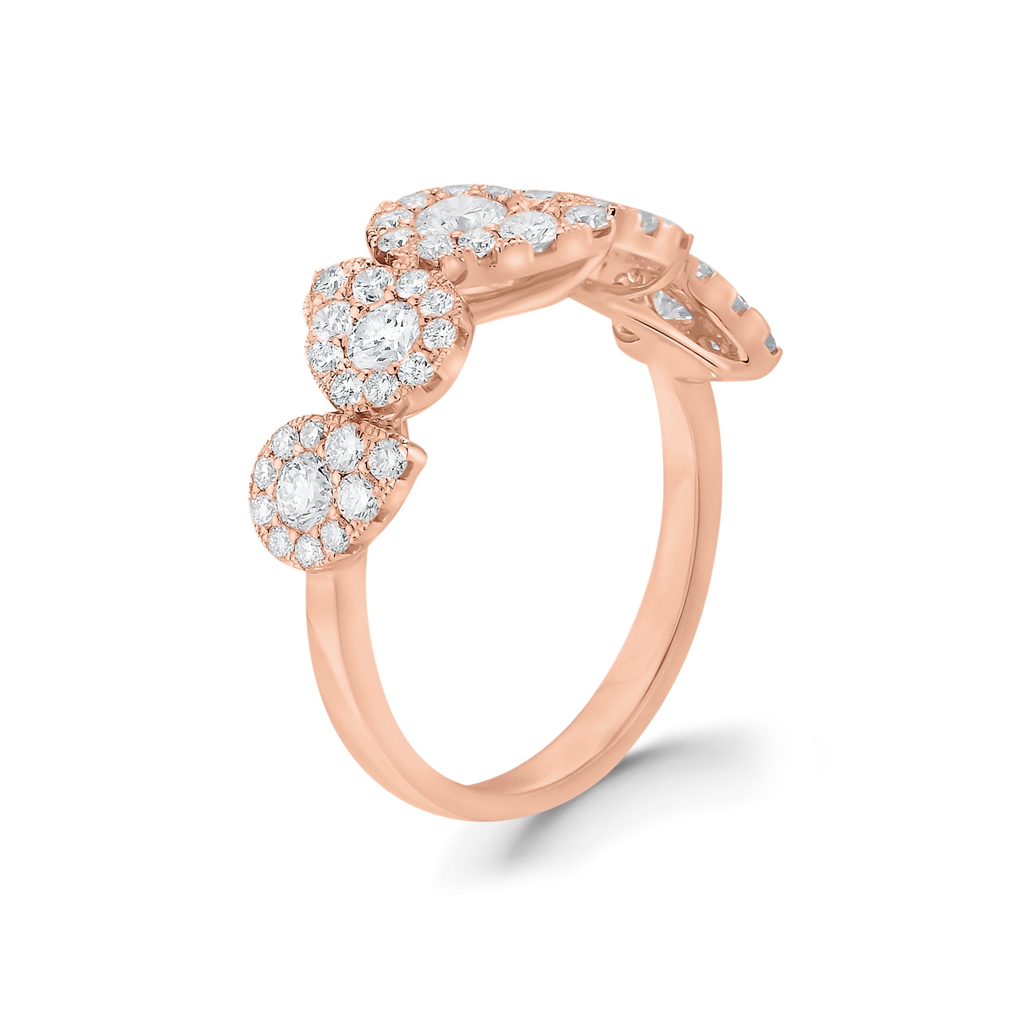 This stunning diamond ring is set in pear shaped halos to make for its' unique design. The diamonds are embedded into 18k gold of your choice.
