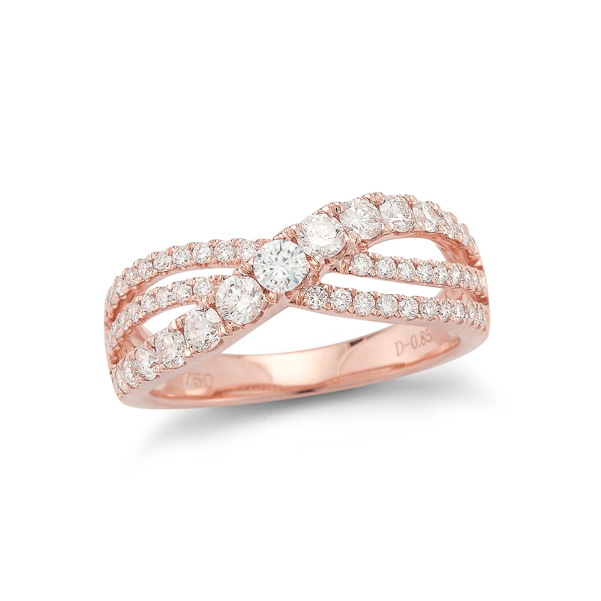 Rows of twisted prong set diamonds wrap your finger in an exquisite fashion, composed of 18k gold of your choice and round prong set diamonds.