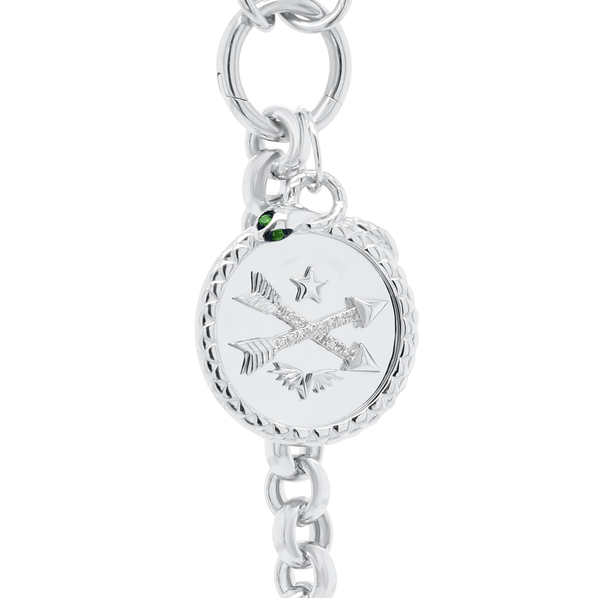 Edgy and chic, this intricately designed 14K gold pendant features crossed arrows embellished with diamonds. It is framed by a sleek serpent with vibrant emerald eyes.