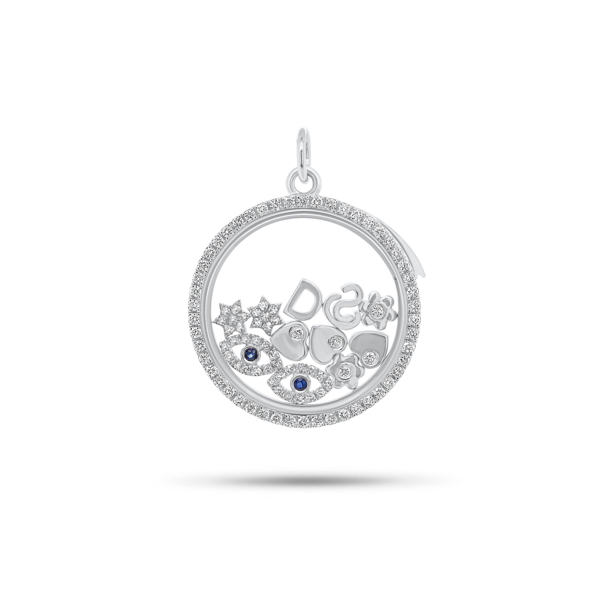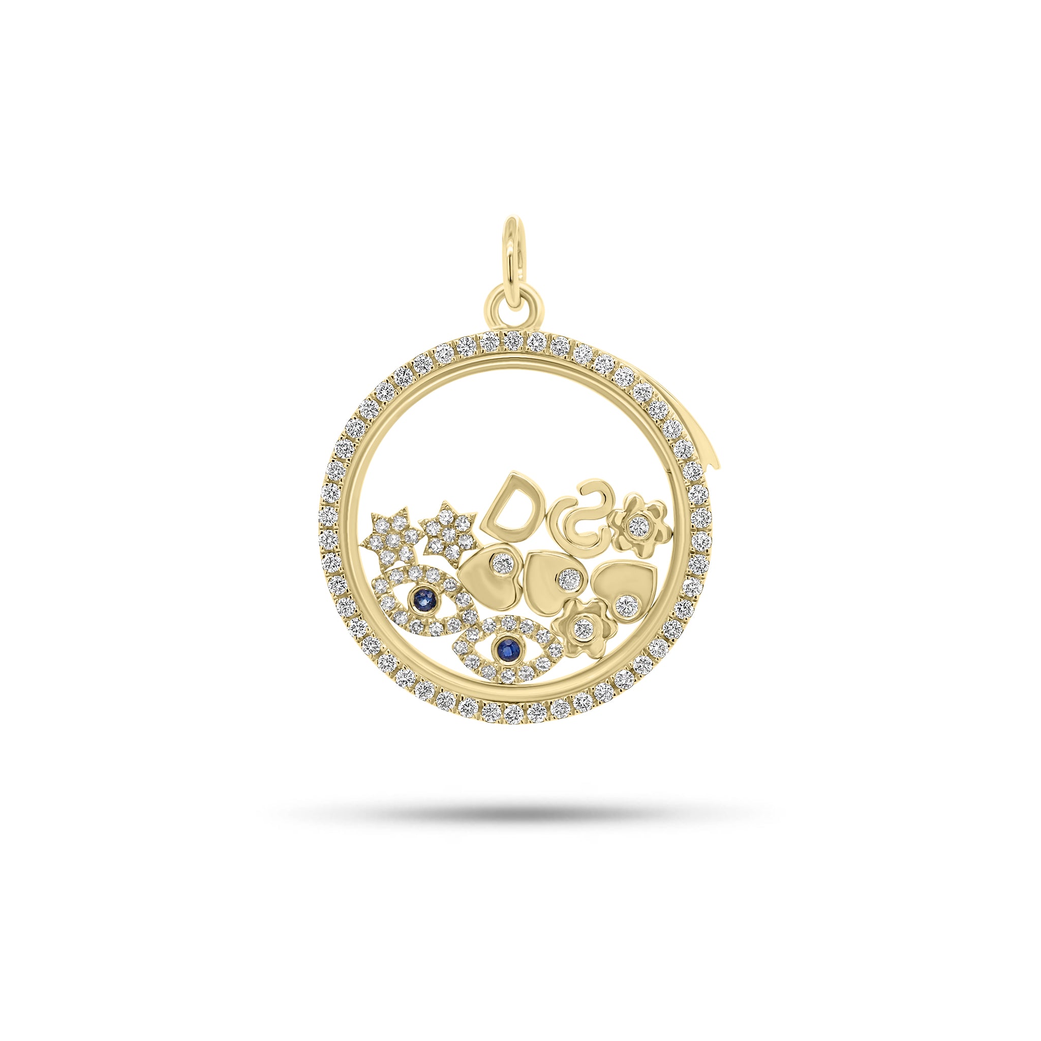 Shake up your everyday styles with this whimsical pendant. Featuring a variety of gold, diamond, and gemstone charms encased in sapphire crystal, this fun and dynamic piece is sure to catch the eye.