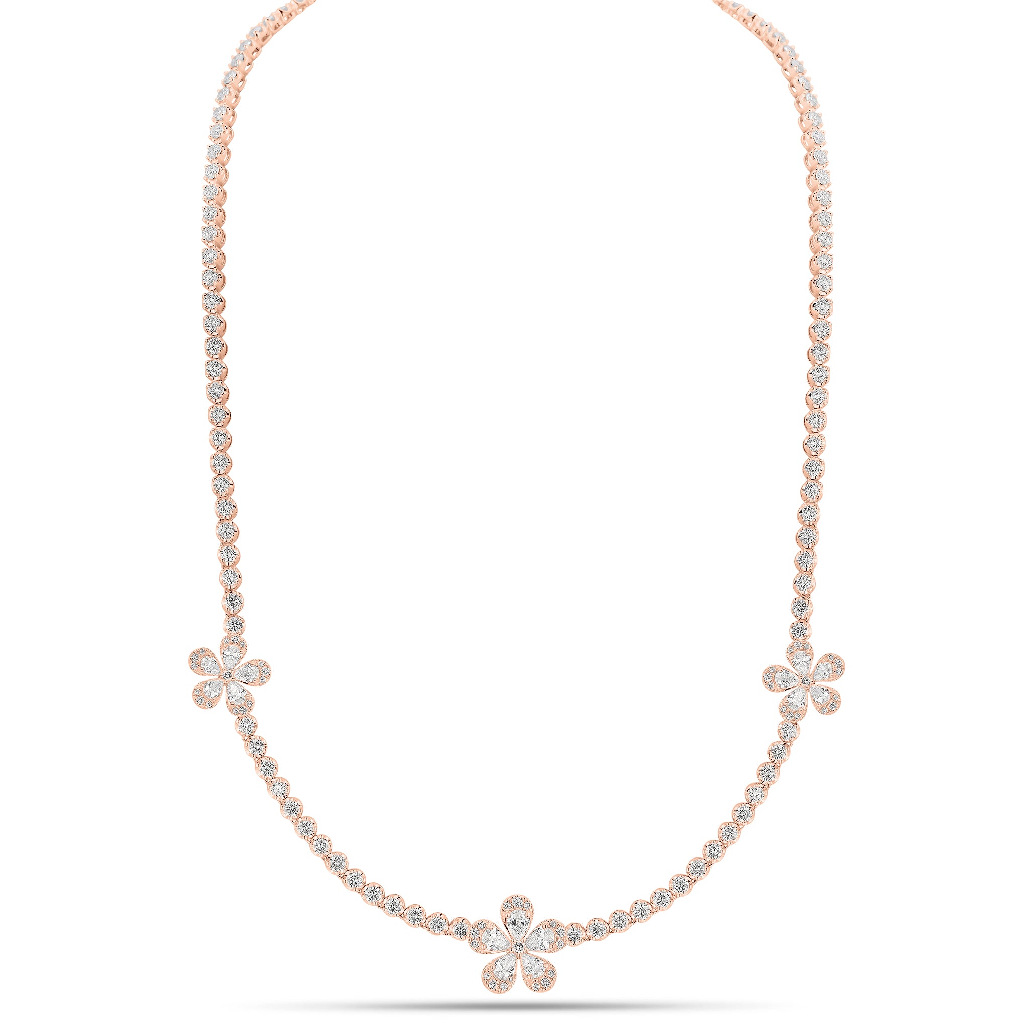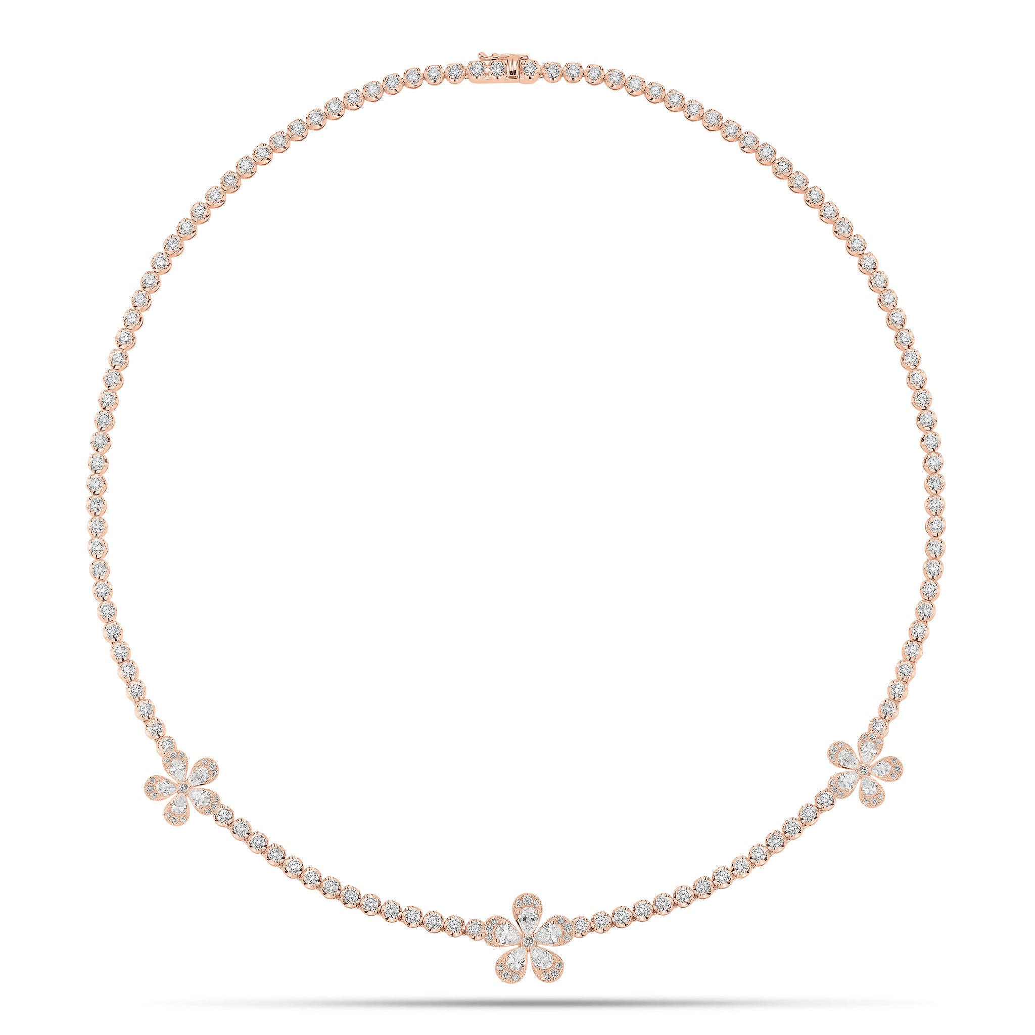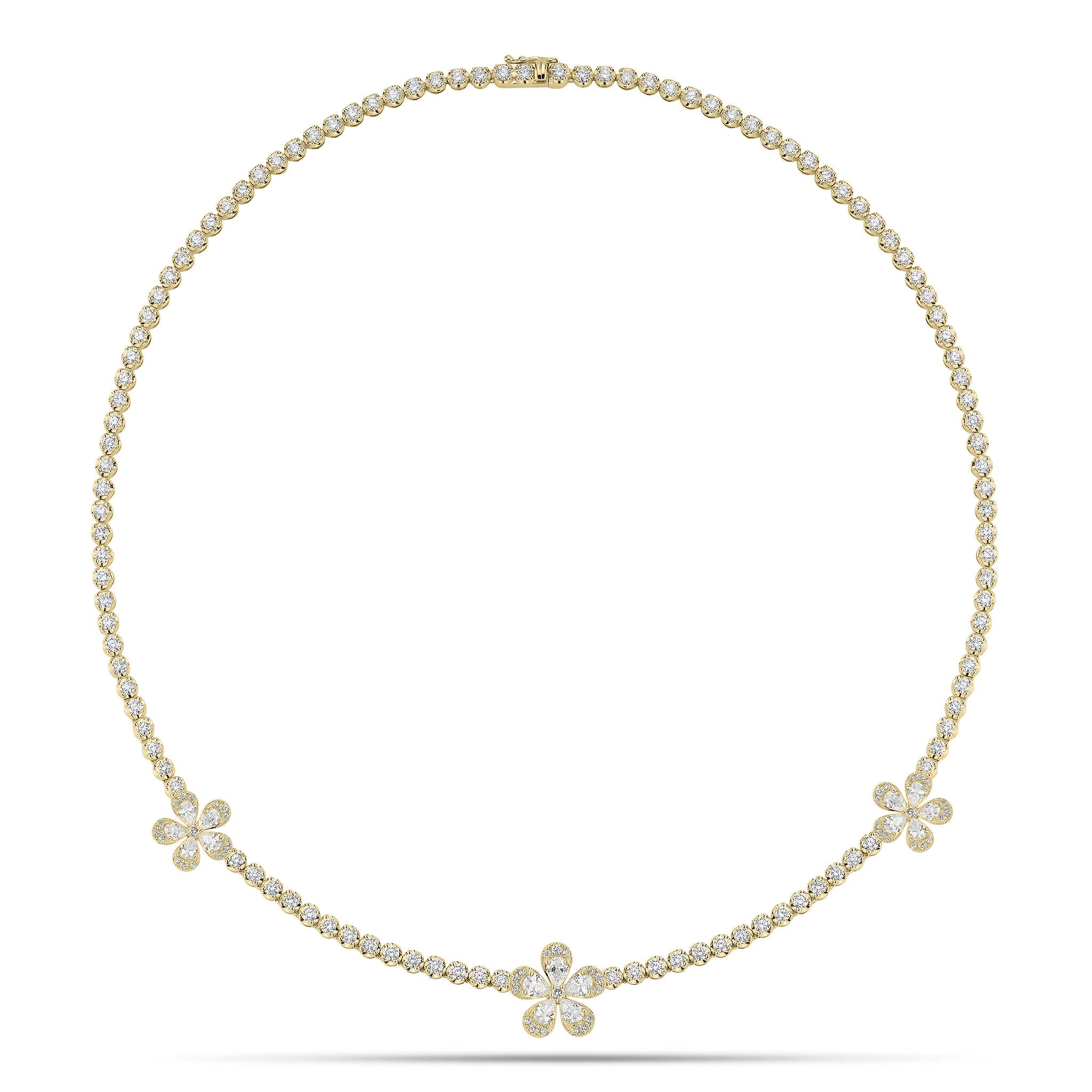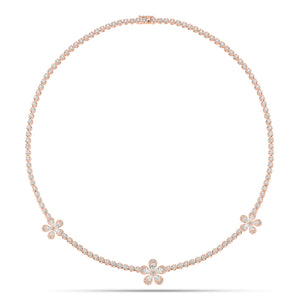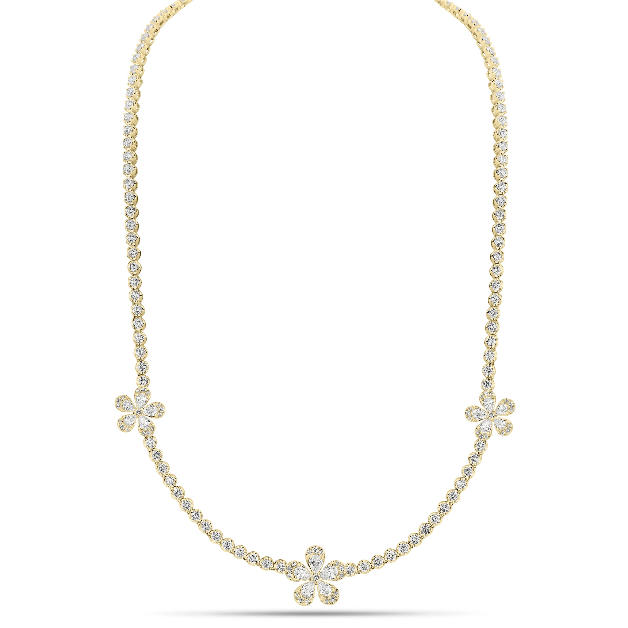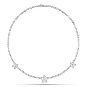 This classic round diamond tennis necklace features a whimsical addition of pear-shaped diamond flowers. This chic and feminine piece will instantly bring the bright energy of springtime to all your looks, regardless of the season.