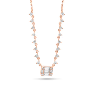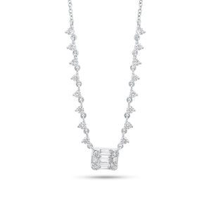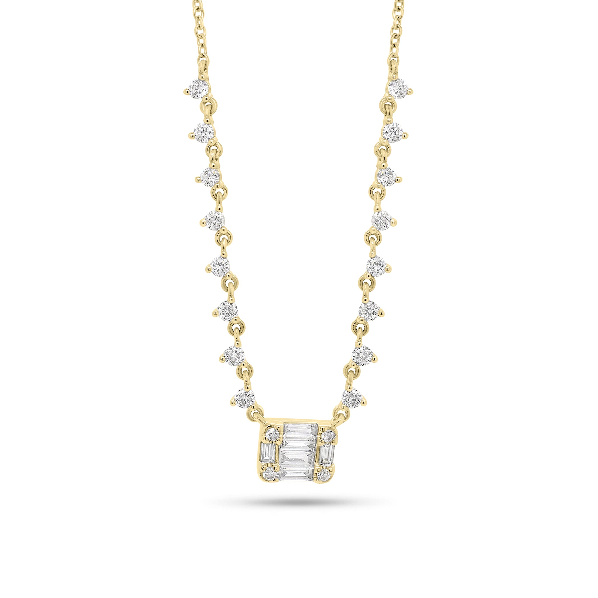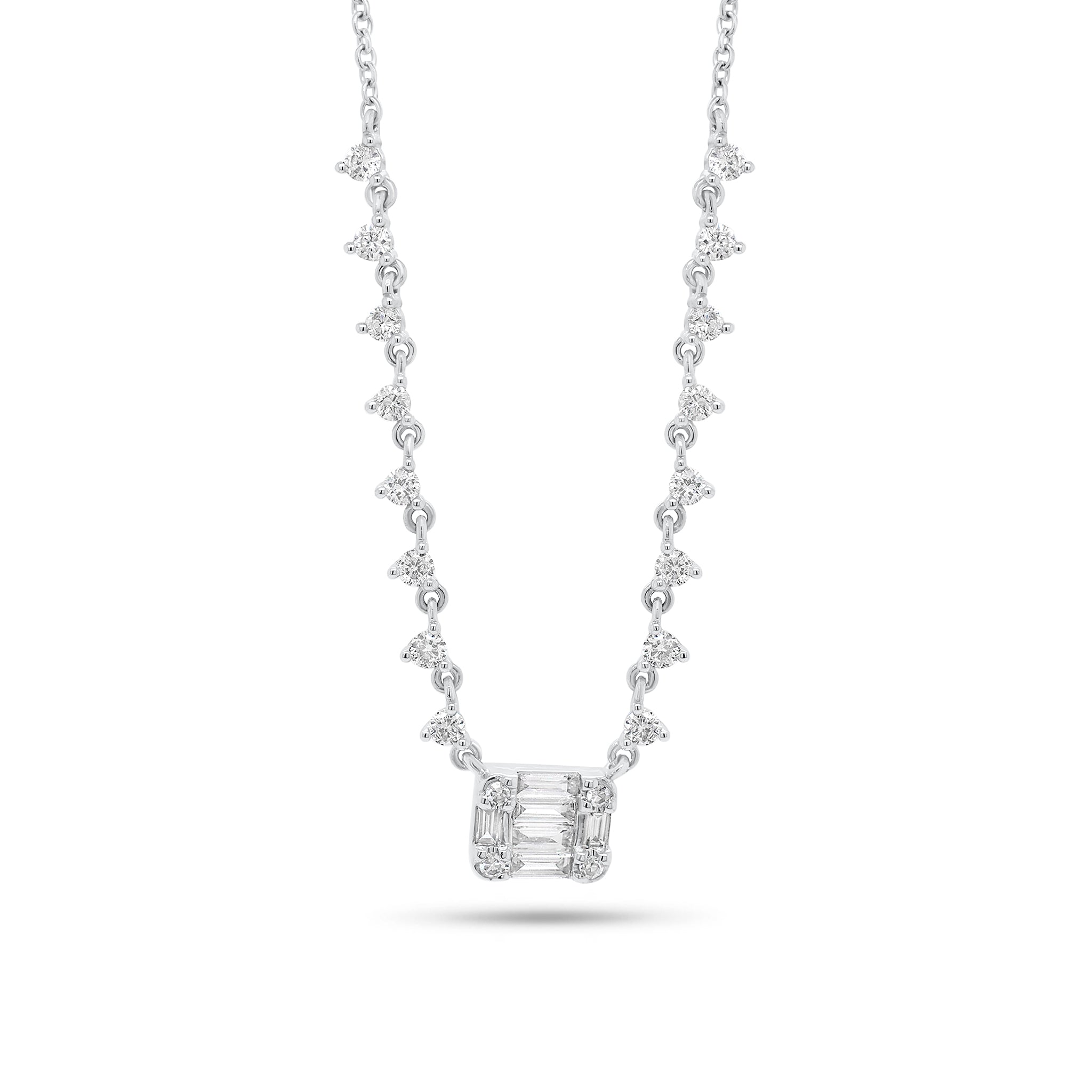 Looking for a wearable diamond pendant with an elegant yet unique vibe? This necklace has all of those traits. Along with a diamond-accented cable chain, it features a pendant of round diamonds and straight baguettes forming the illusion of a single emerald-cut stone.