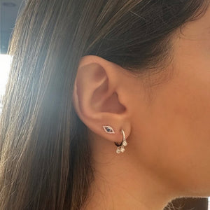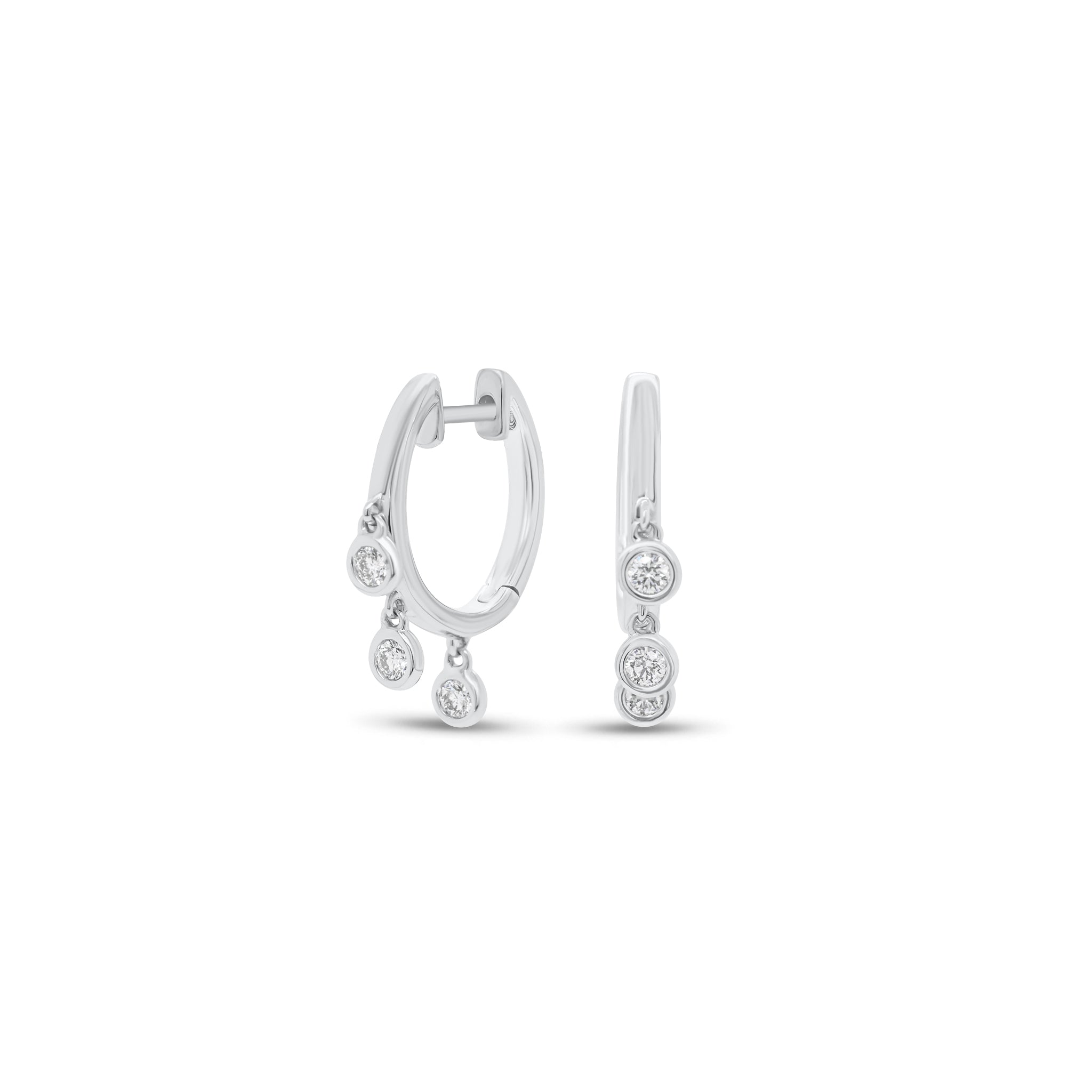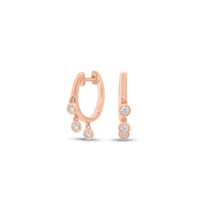 Add this pair to your ensemble for a chic touch of sparkle. Designed in 18K gold, these petite huggies each feature three bezel-set diamond dangles.