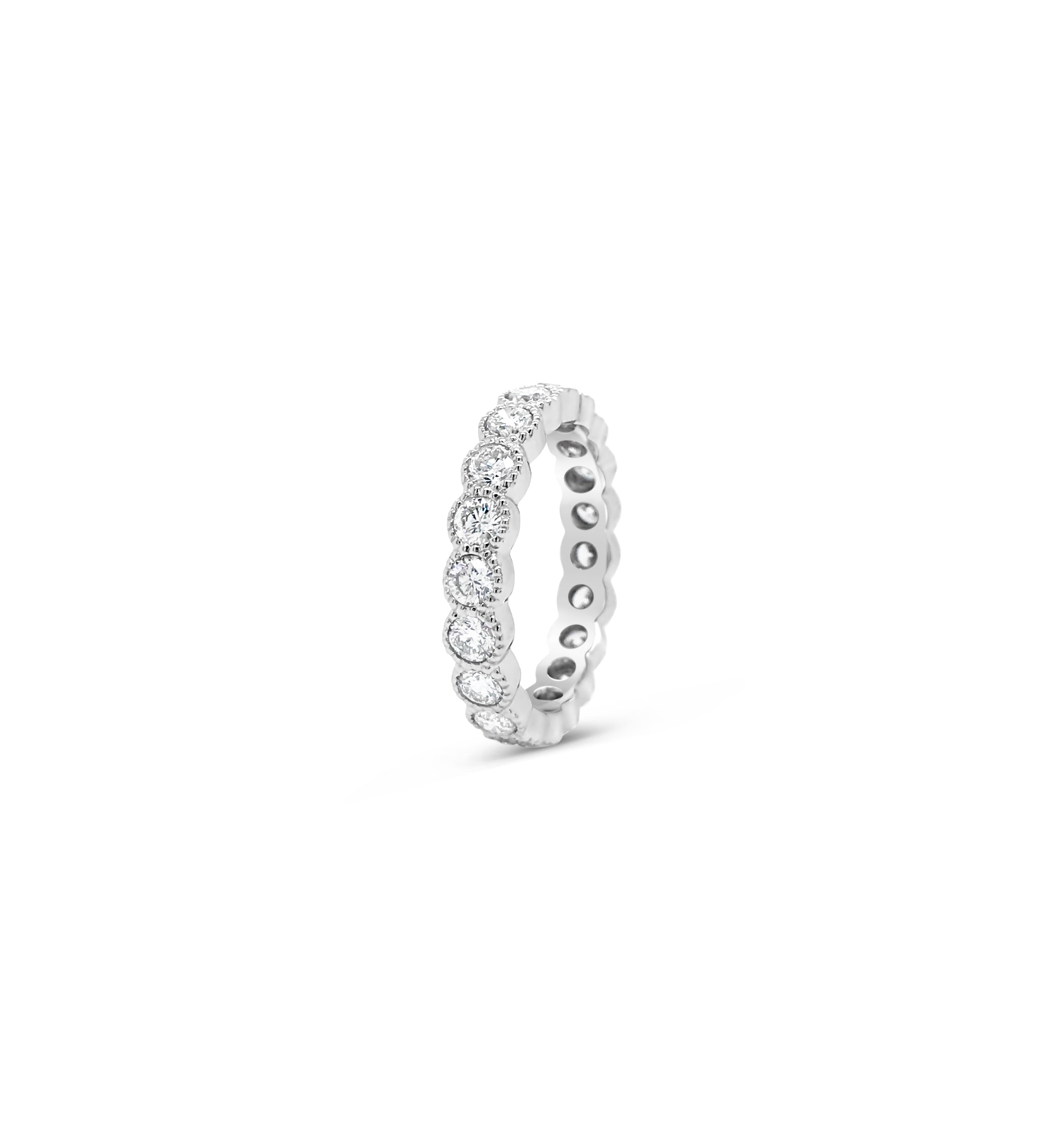 Brighten your finger with this antique designed wedding band, composed of milgrain bezel-set diamonds in a 14k gold eternity band.