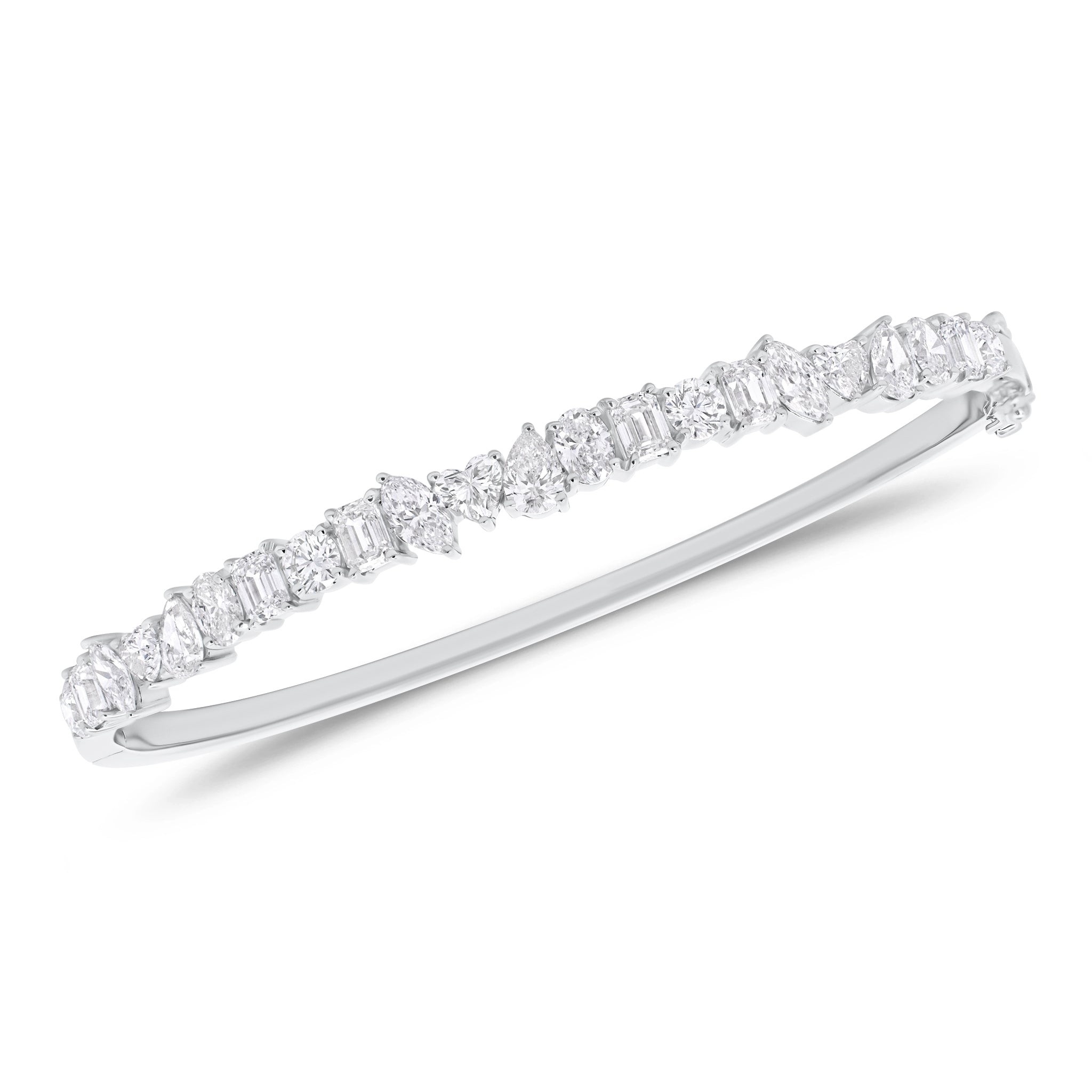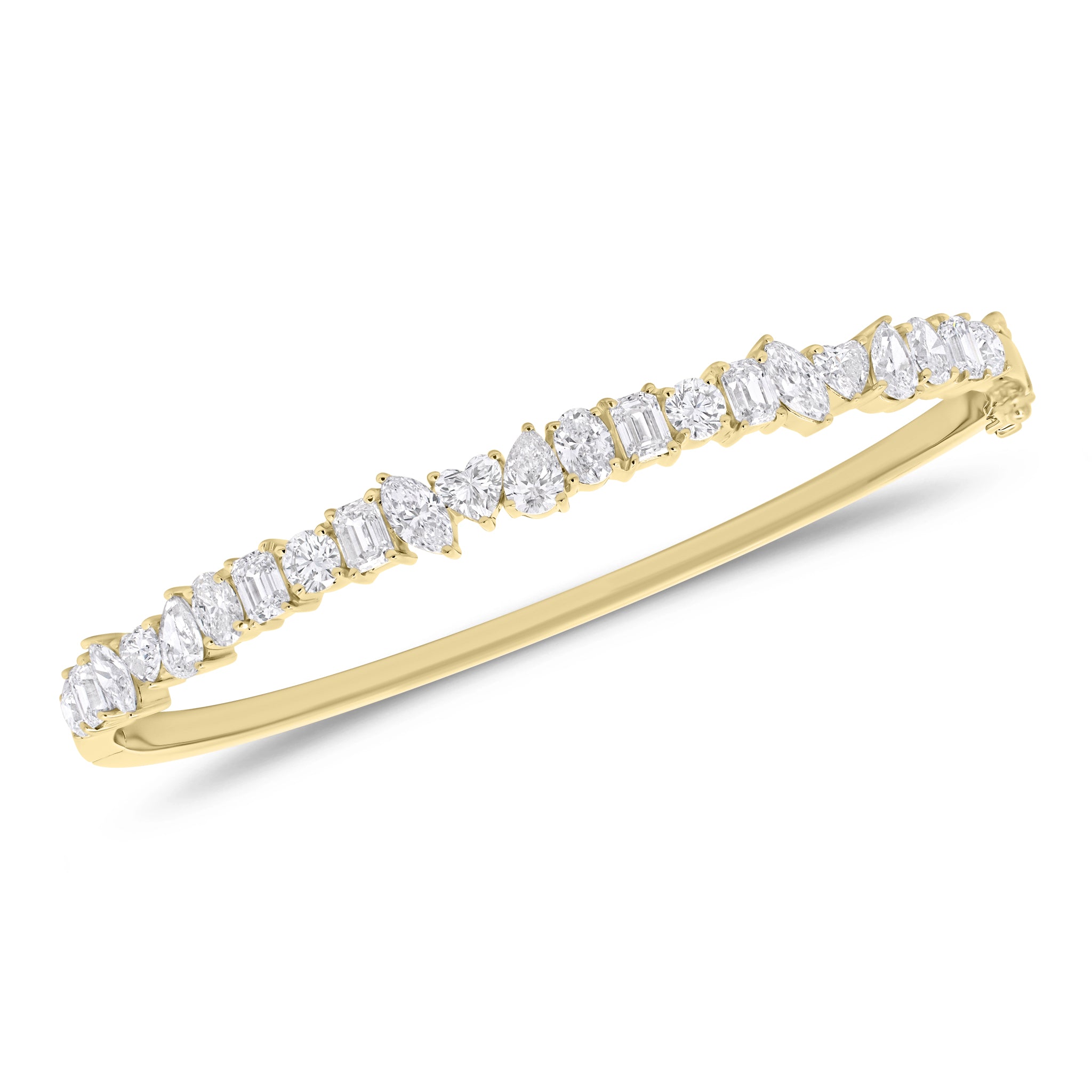 Add dimension to your styles with this fabulous multi-shaped diamond bangle. Featuring emerald-cut, pear, marquise, heart, oval, and round diamonds, it presents a beautiful display of light, sparkle, and brilliance.