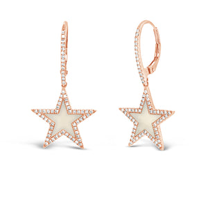 These adorable star lever-back earrings are sure to twinkle on your ear with lustrous mother of pearl inlays and pave-set diamonds embedded in 14K gold of your choice.
