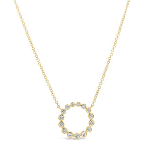 A unique take on the classic open circle pendant, this chic style features a ring of 15 bezel-set diamonds. Wrapped in lustrous 14K gold, the gems in this piece totally shimmer.
