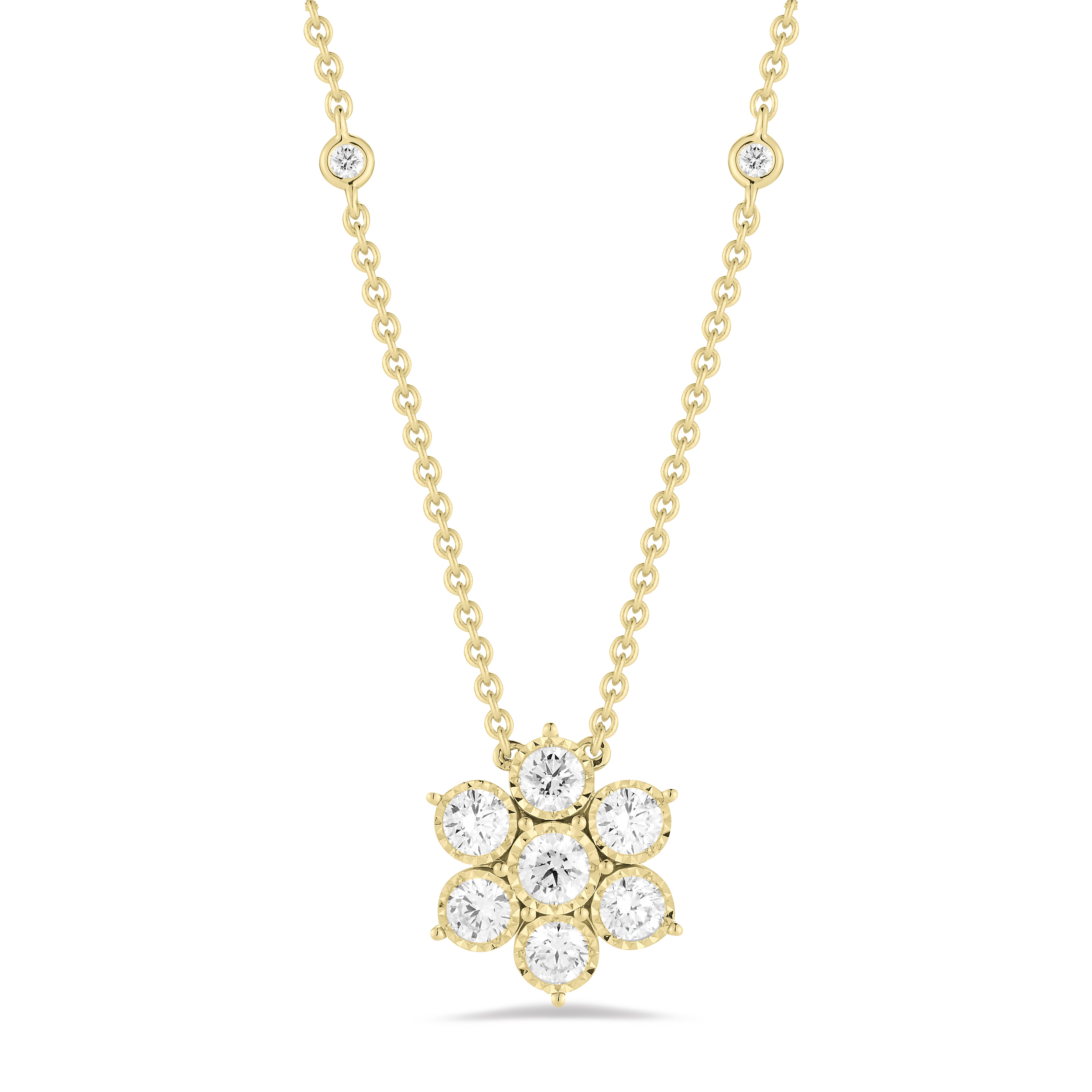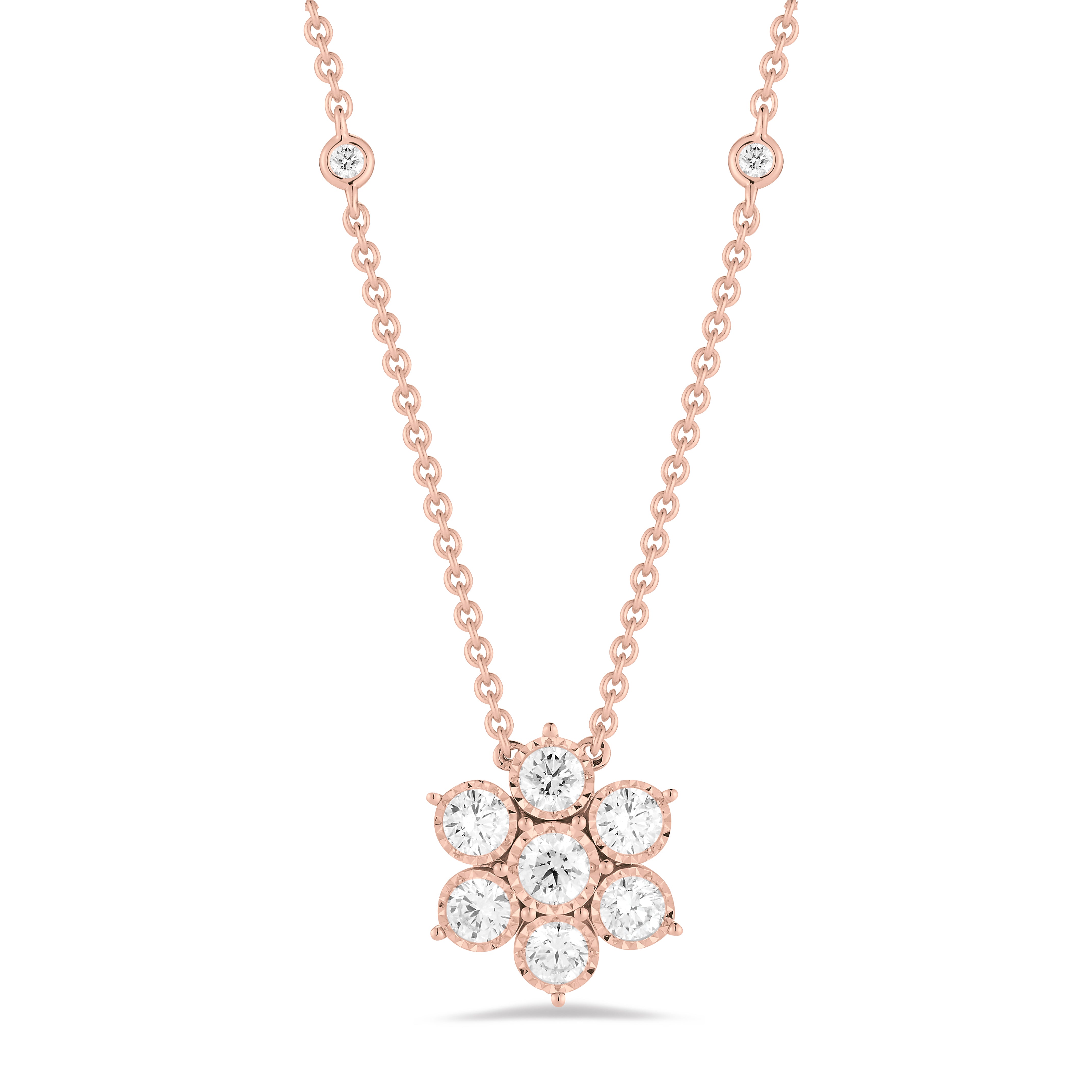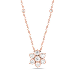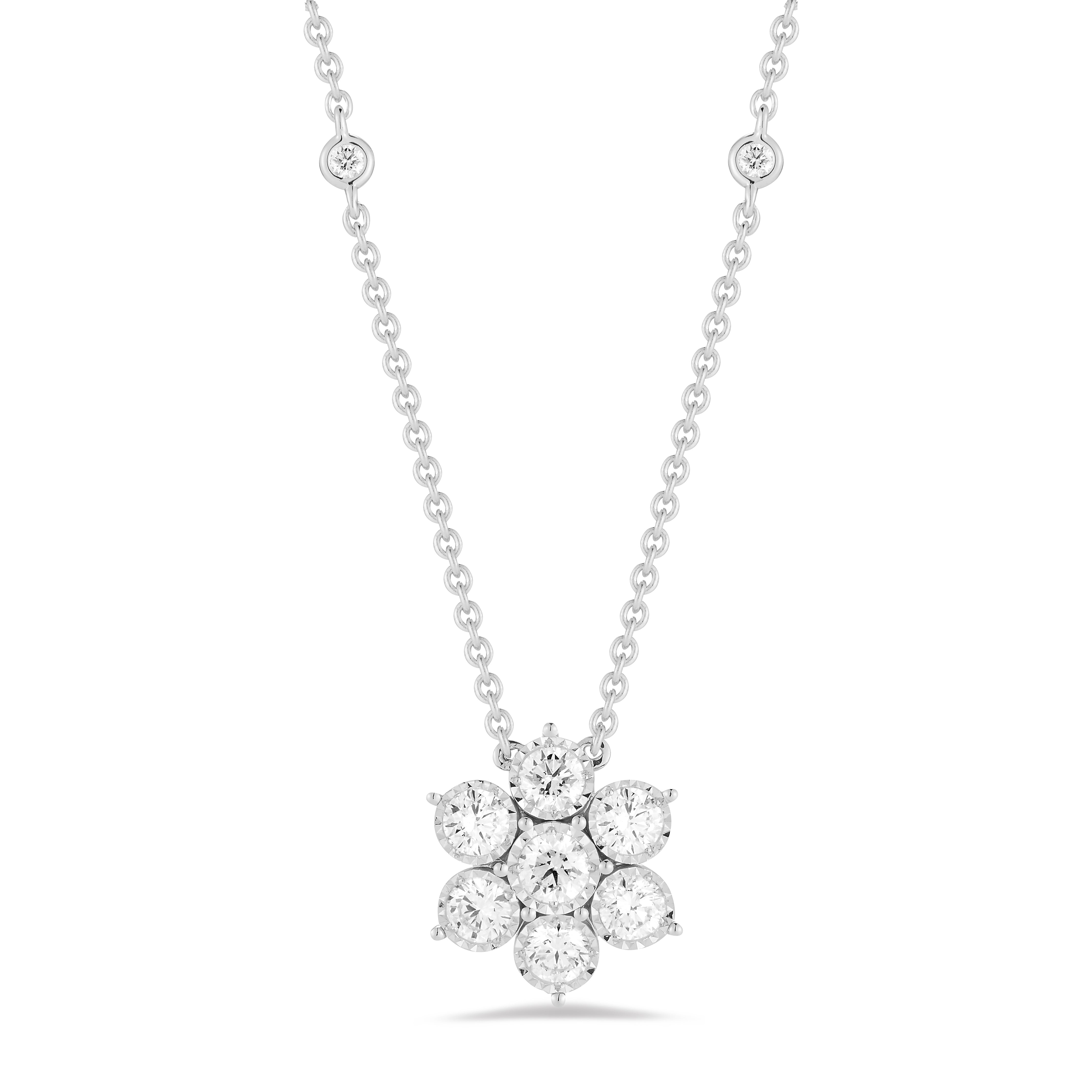 This gorgeous diamond flower necklace features bezel-set diamonds accenting its chain.