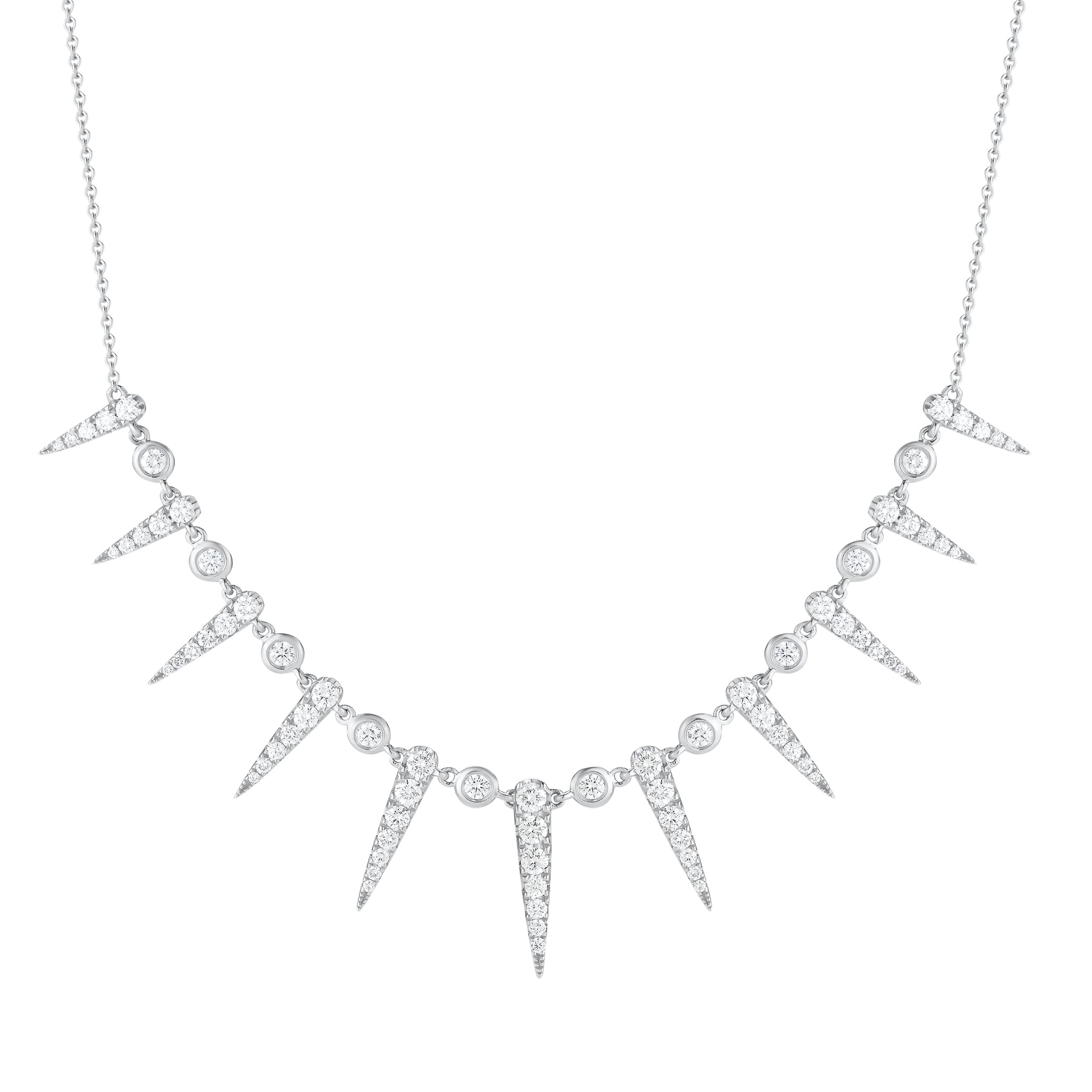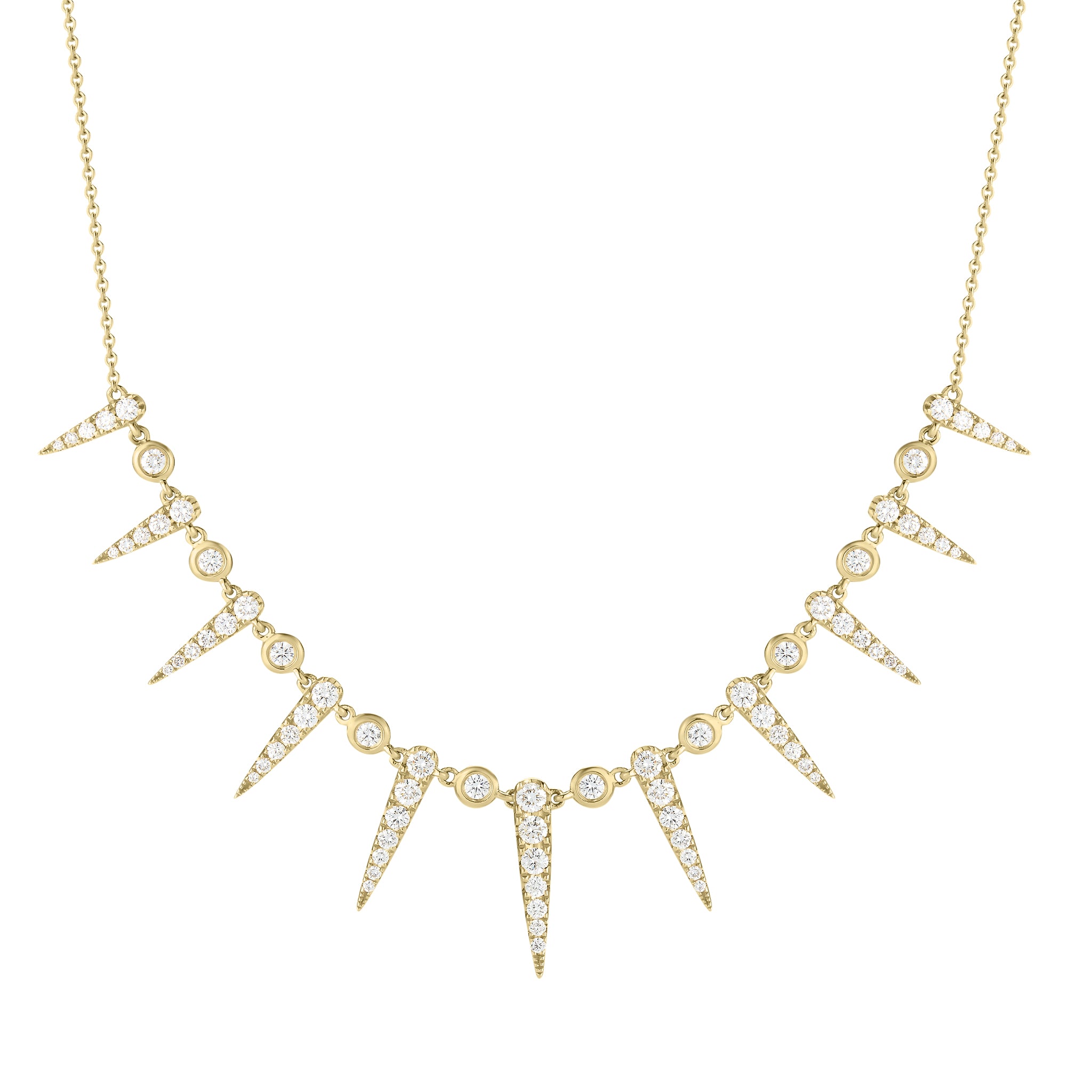 Stylish spike necklace glistening with 75 round diamonds, a mixture of pave set & bezel set, in 18K gold of your choice. You'll make a statement with this necklace, whether you wear it on its own or layer it with other necklaces.