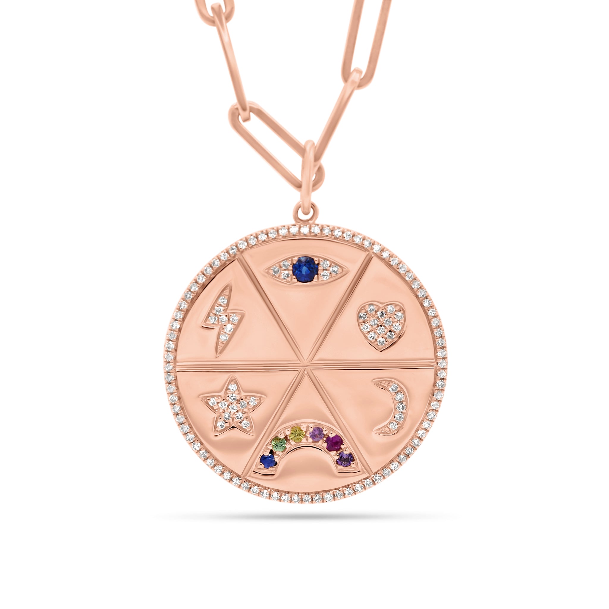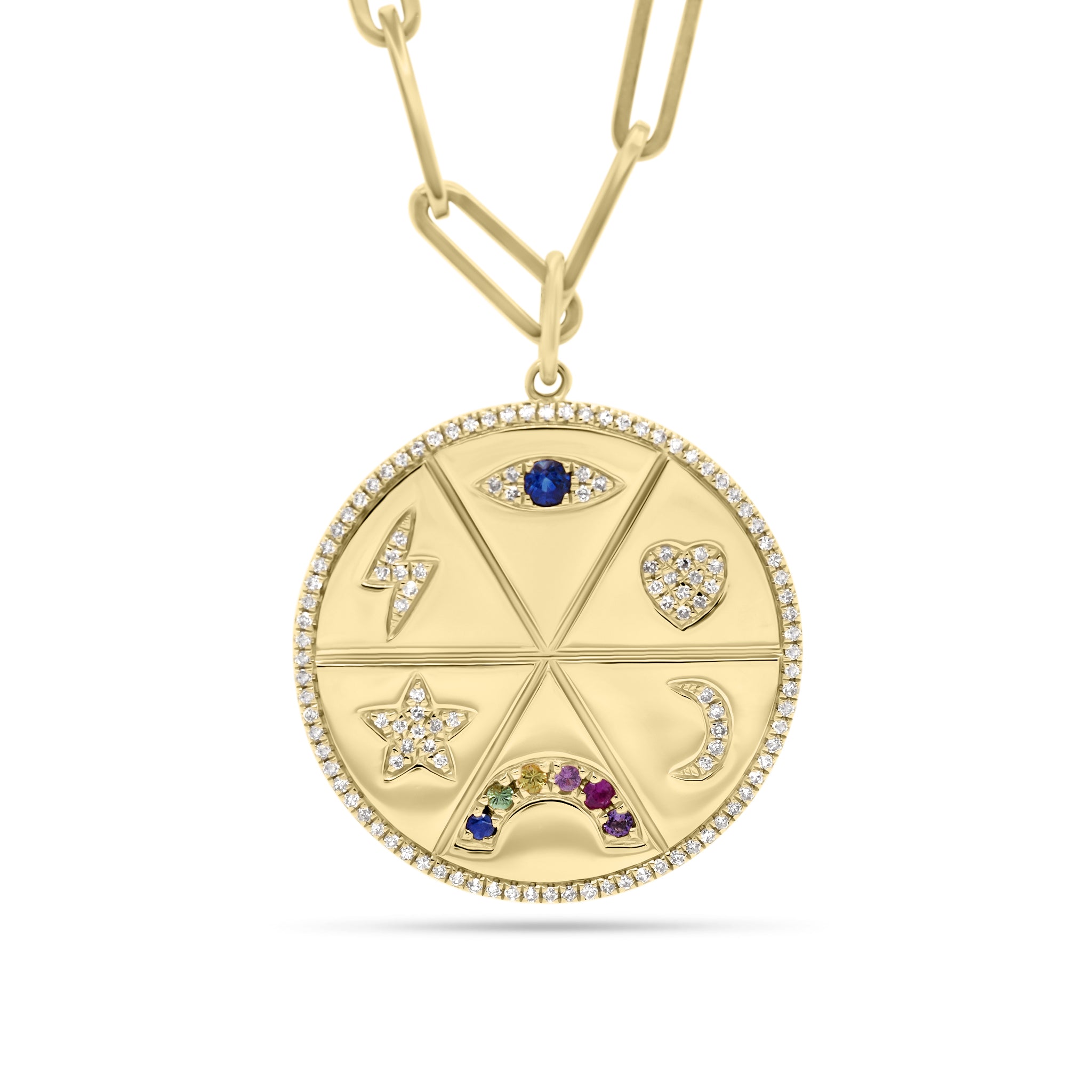 Diamonds in the Diamond & Multicolor Gemstone Lucky Symbols Large Disc Pendant are all natural Earth mined.