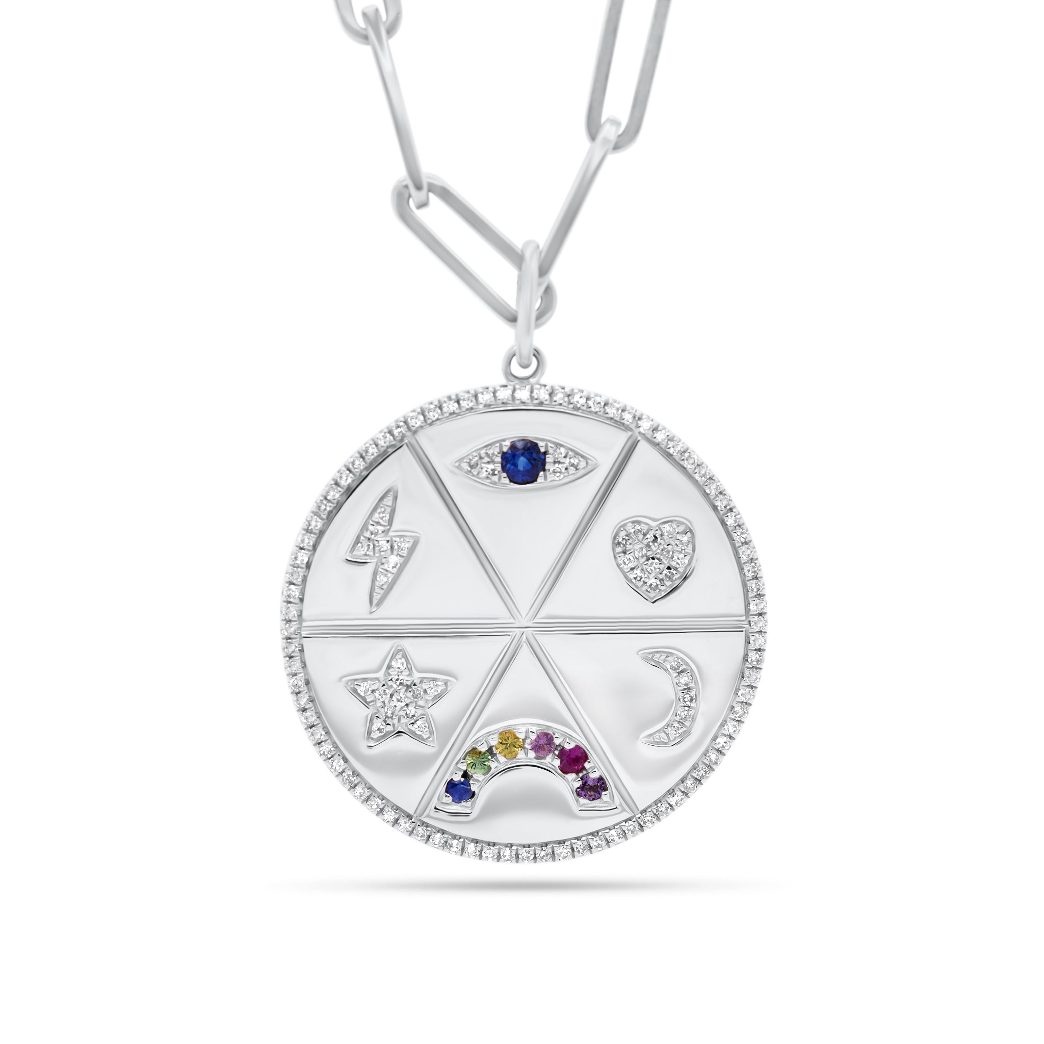 Bring meaning to your everyday looks with this vibrant necklace. Featuring a diamond lightning bolt, heart, star, and crescent moon, and gemstone evil eye and rainbow, this eye-catching pendant will elevate your style and your vibe.