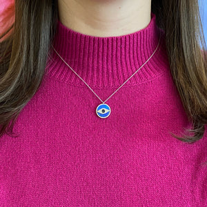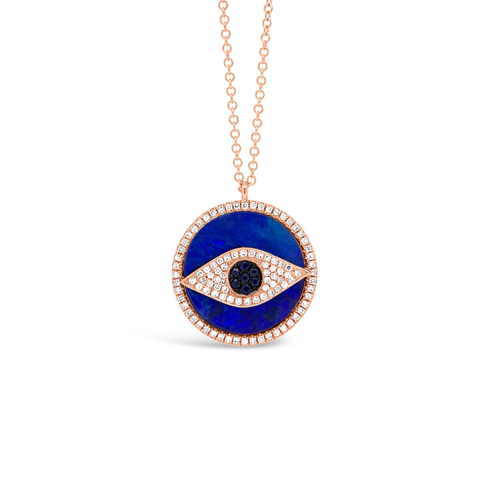 This stunning necklace features a diamond and sapphire evil eye surrounded by a gorgeous opal. Diamonds framing the pendant make it all the more special.