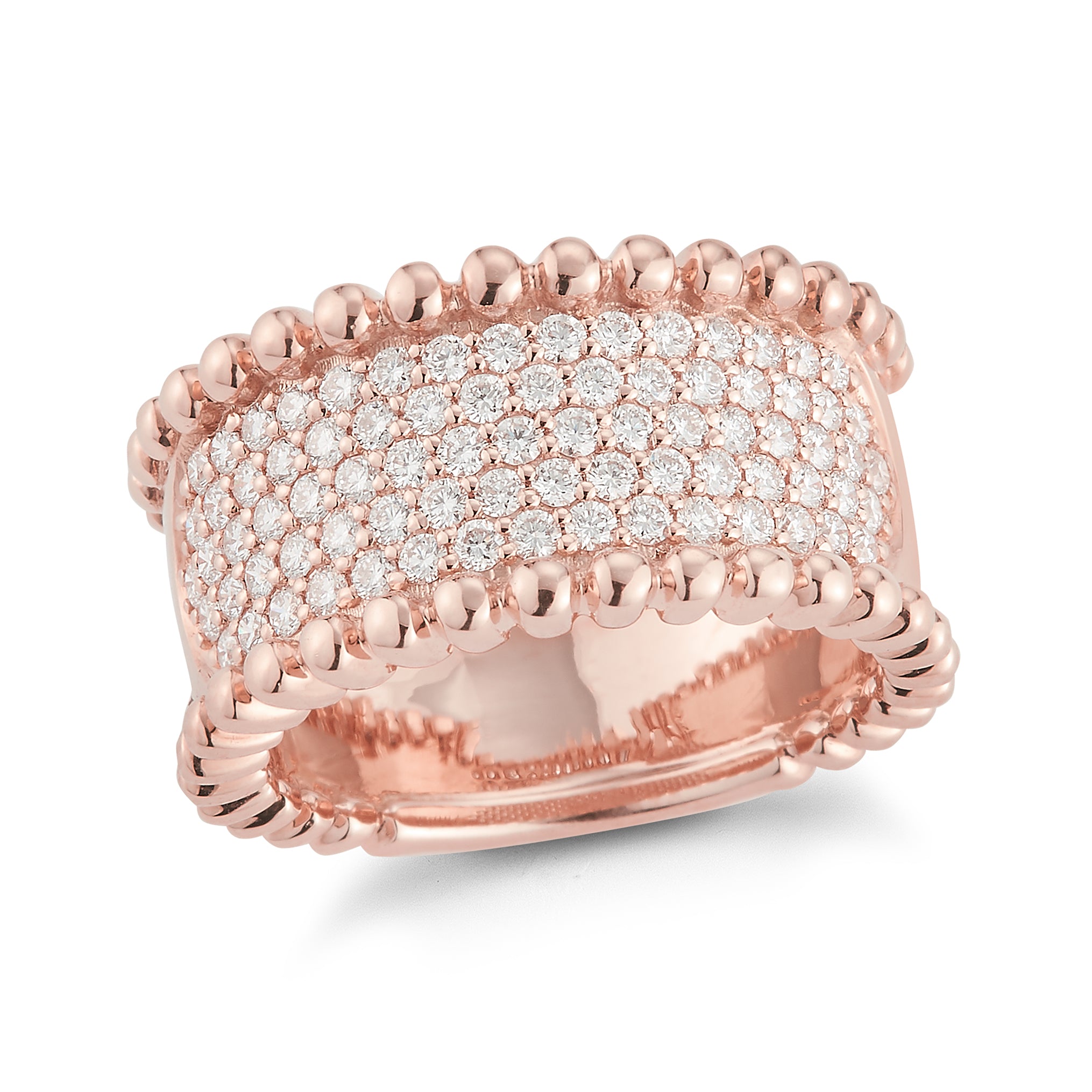 These shared-prong set diamonds accented with beaded 18k gold creates a show-stopping ring perfect for any hand.