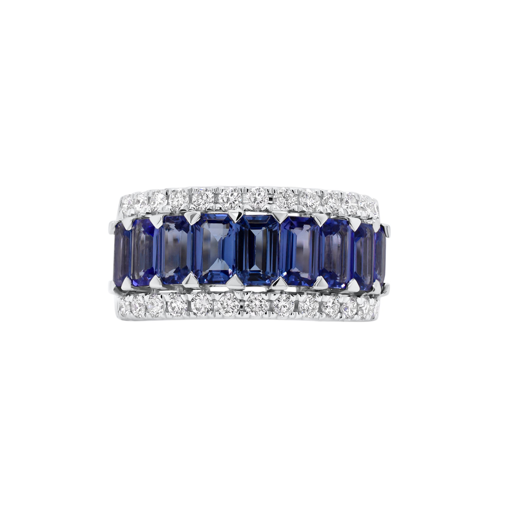 This striking gemstone ring is far from ordinary. Featuring emerald-cut tanzanite and glittering round diamonds, this eye-catching piece will surely make a statement.