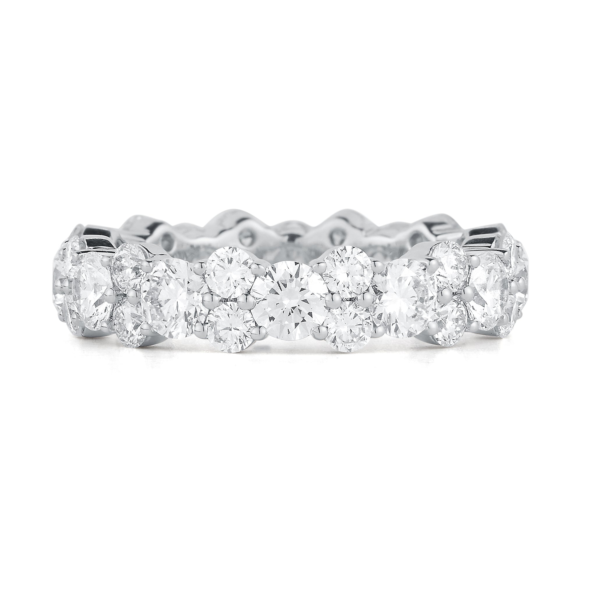 Exquisite eternity band featuring round brilliant diamonds prong set infinitely around the finger, making for the perfect diamond band.
