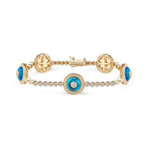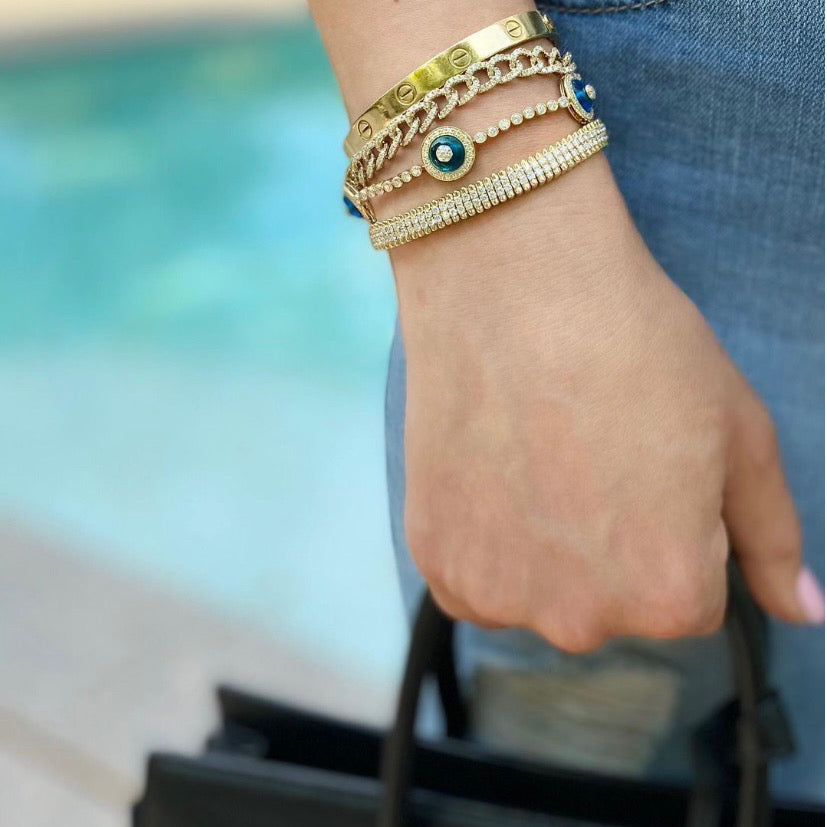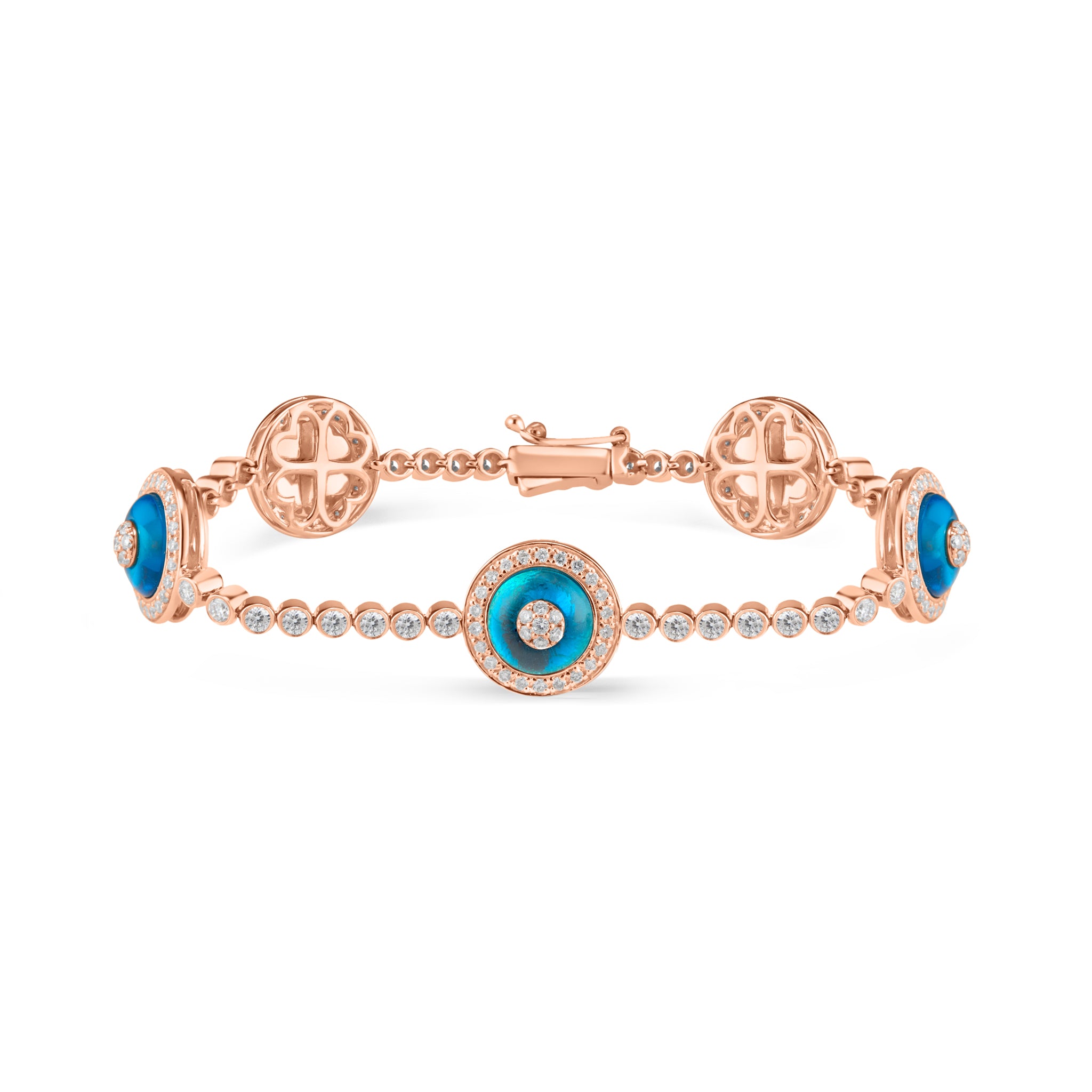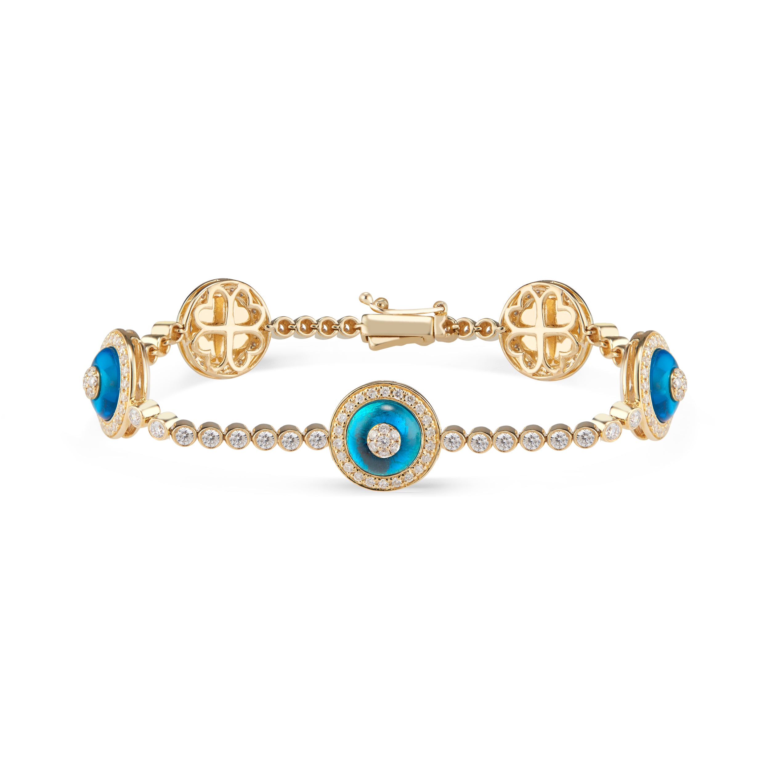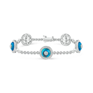 This vibrant bracelet features a chain of bezel-set diamonds and iridescent evil eyes accented by sparkling diamonds. It’s a beautiful, stylish piece that also serves as a symbol of protection.