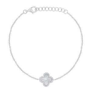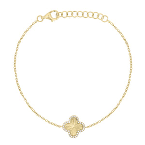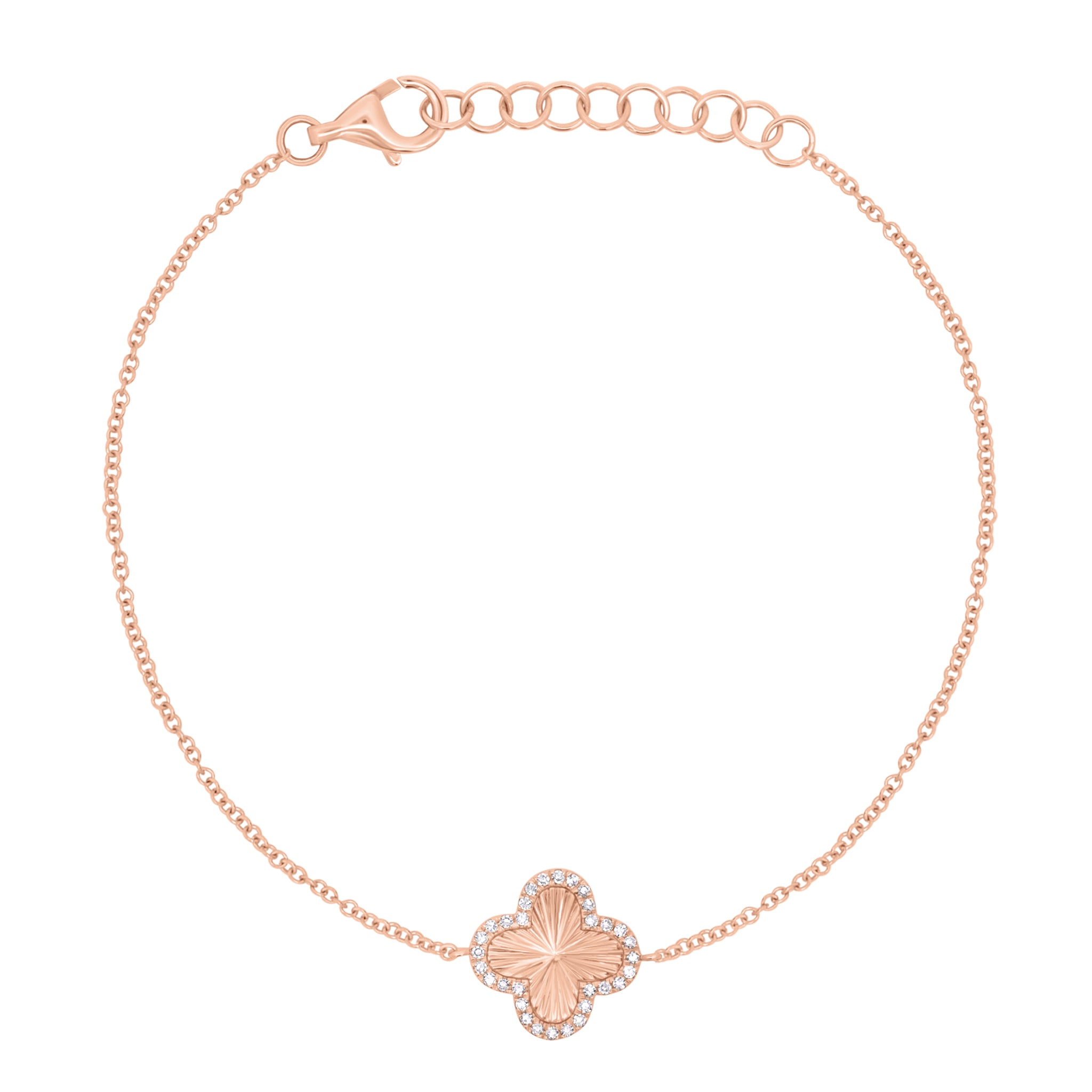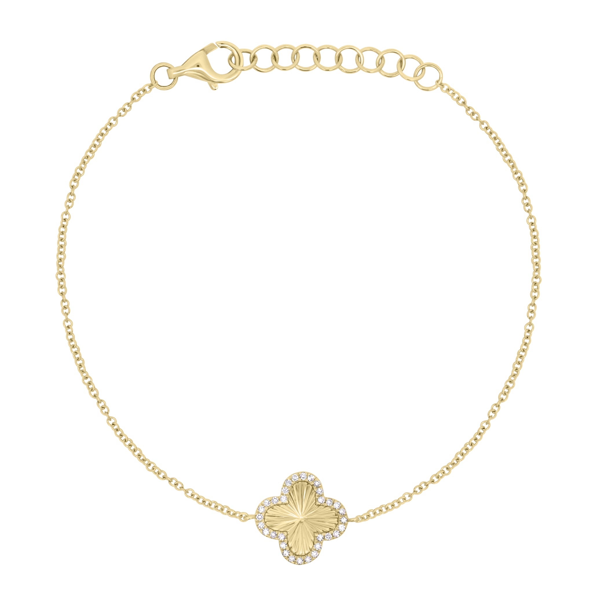 Simplicity is elegance. This classic and dainty cable chain bracelet features a single clover charm, designed with a diamond frame and ridged gold detail.