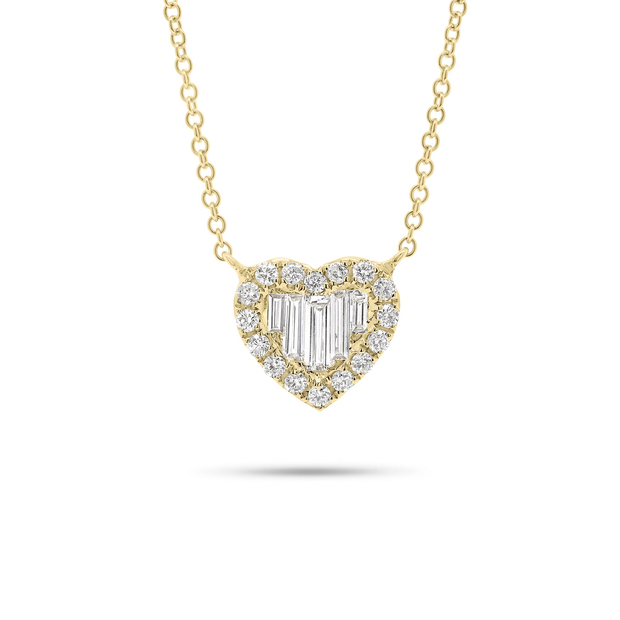 Fall in love with this stunning heart pendant. Featuring a unique setting of shimmering baguette diamonds and sparkling rounds, this timeless necklace will look great with everything from casual styles to dressy ensembles.