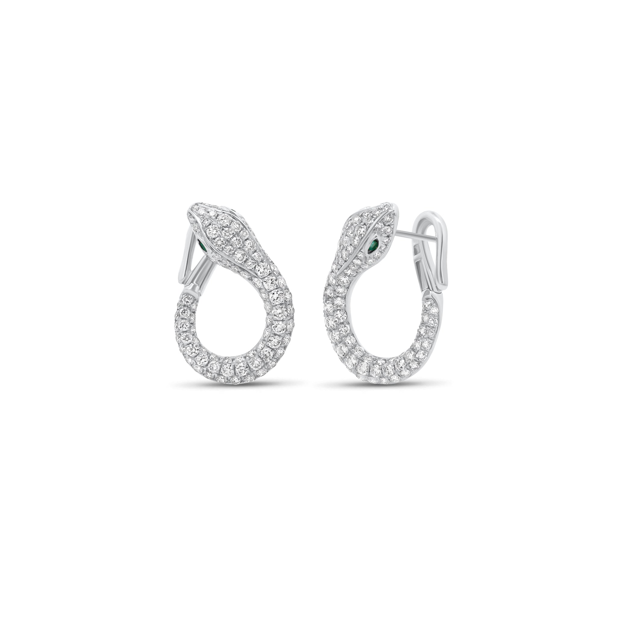 Striking and sophisticated, these unique hoops feature a serpentine design encrusted with sparkling diamonds. The snakes’ eyes are set with vibrant emeralds, adding a hint of color and intrigue to the sleek hoops. A bold accessory with a touch of mystique, these earrings make a captivating statement for any occasion.