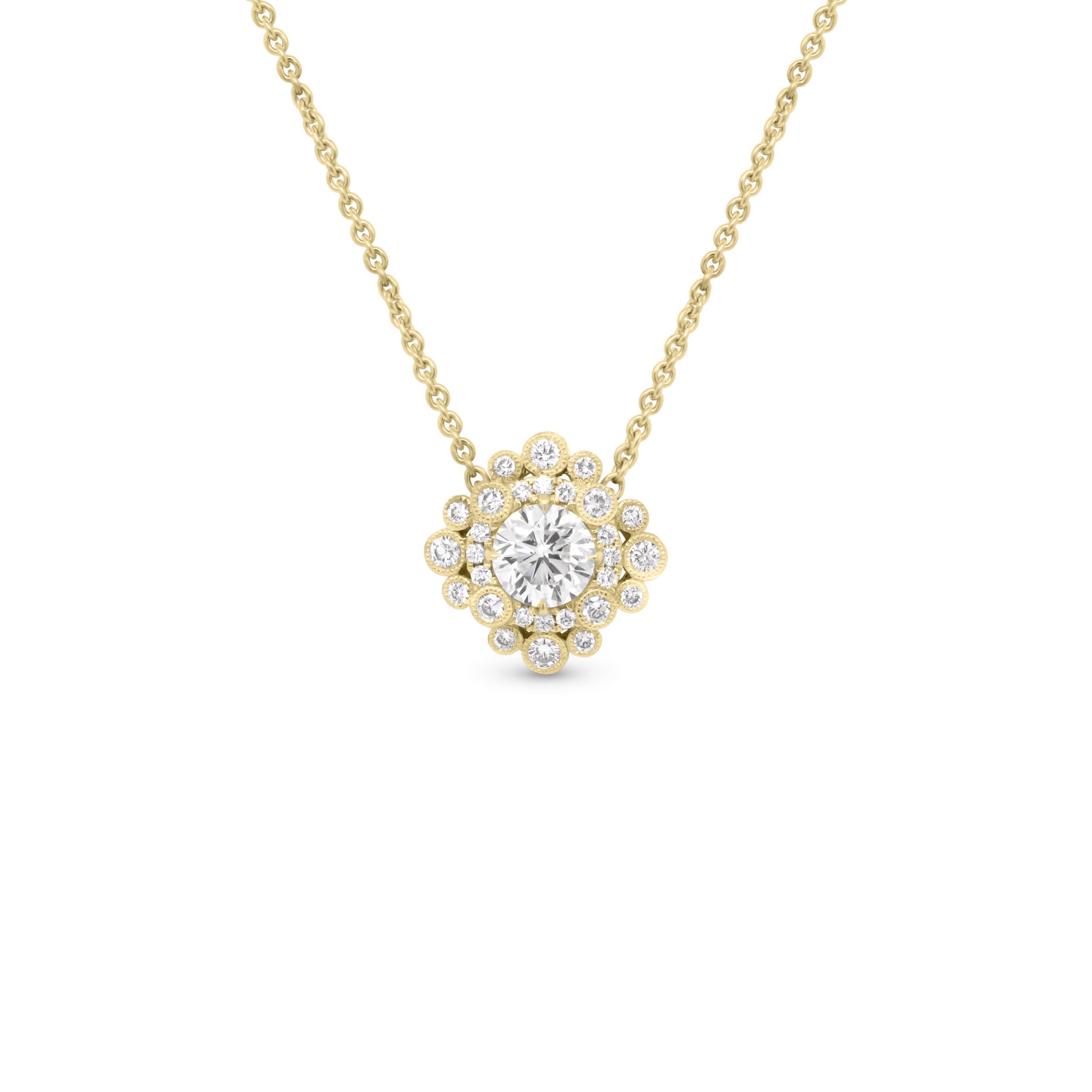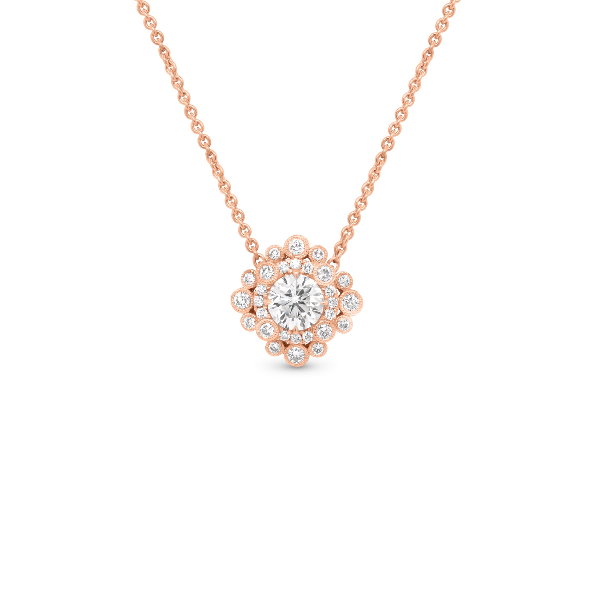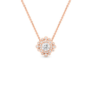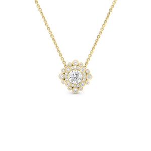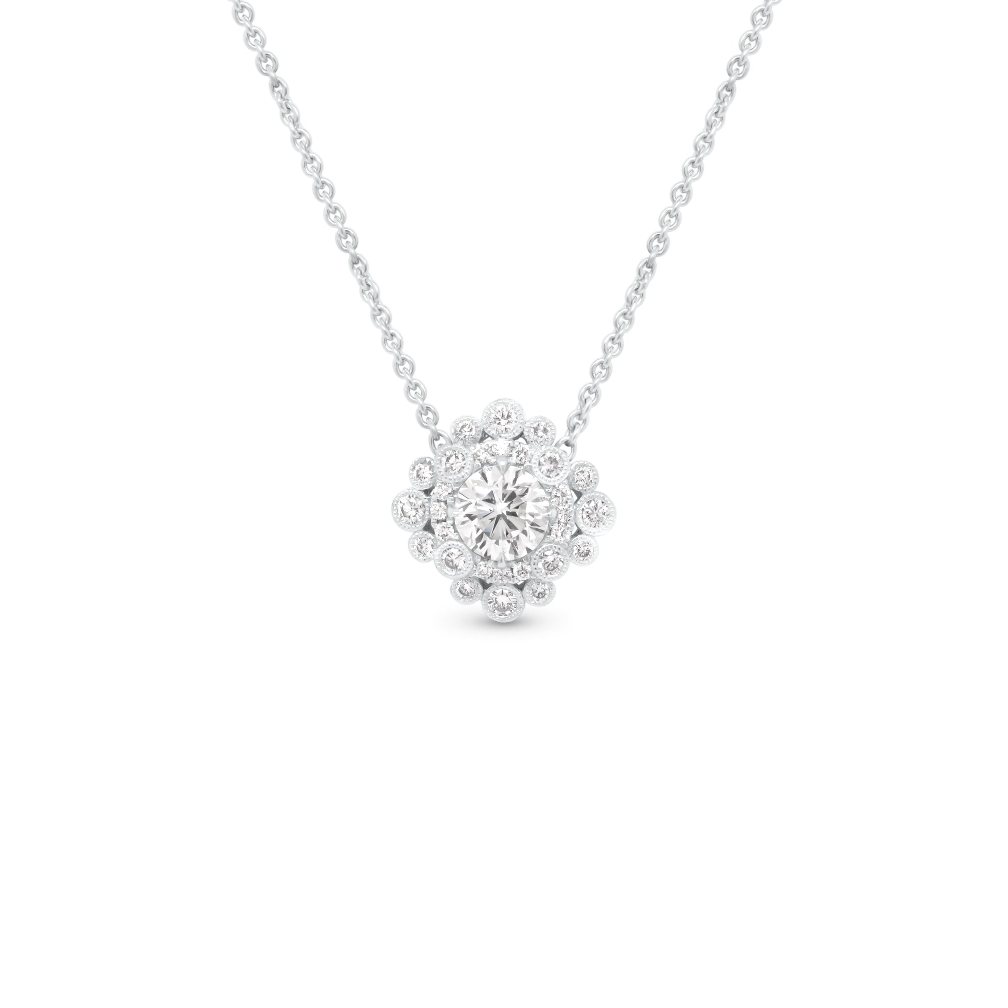 This beautiful pendant is full of special details. Set in its center is a 1 ct round brilliant-cut diamond. Along with a diamond halo, numerous diamonds in beaded edge settings surround the center stone and enhance its sparkle.