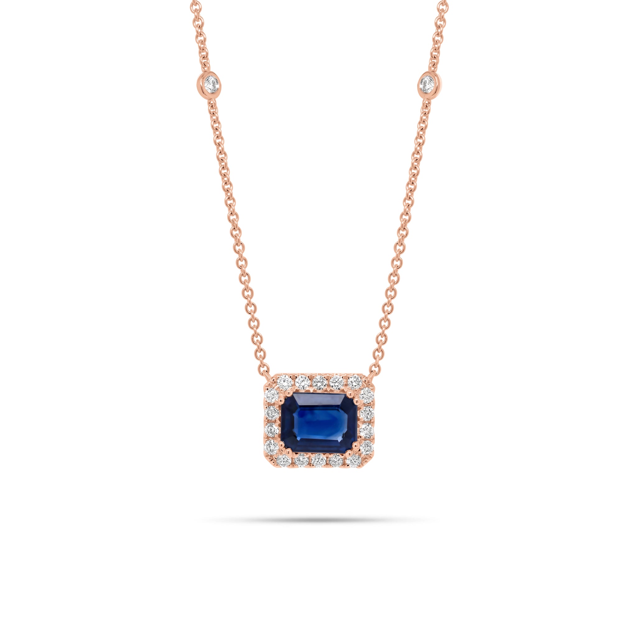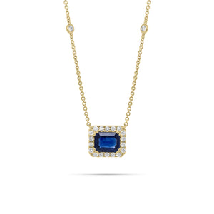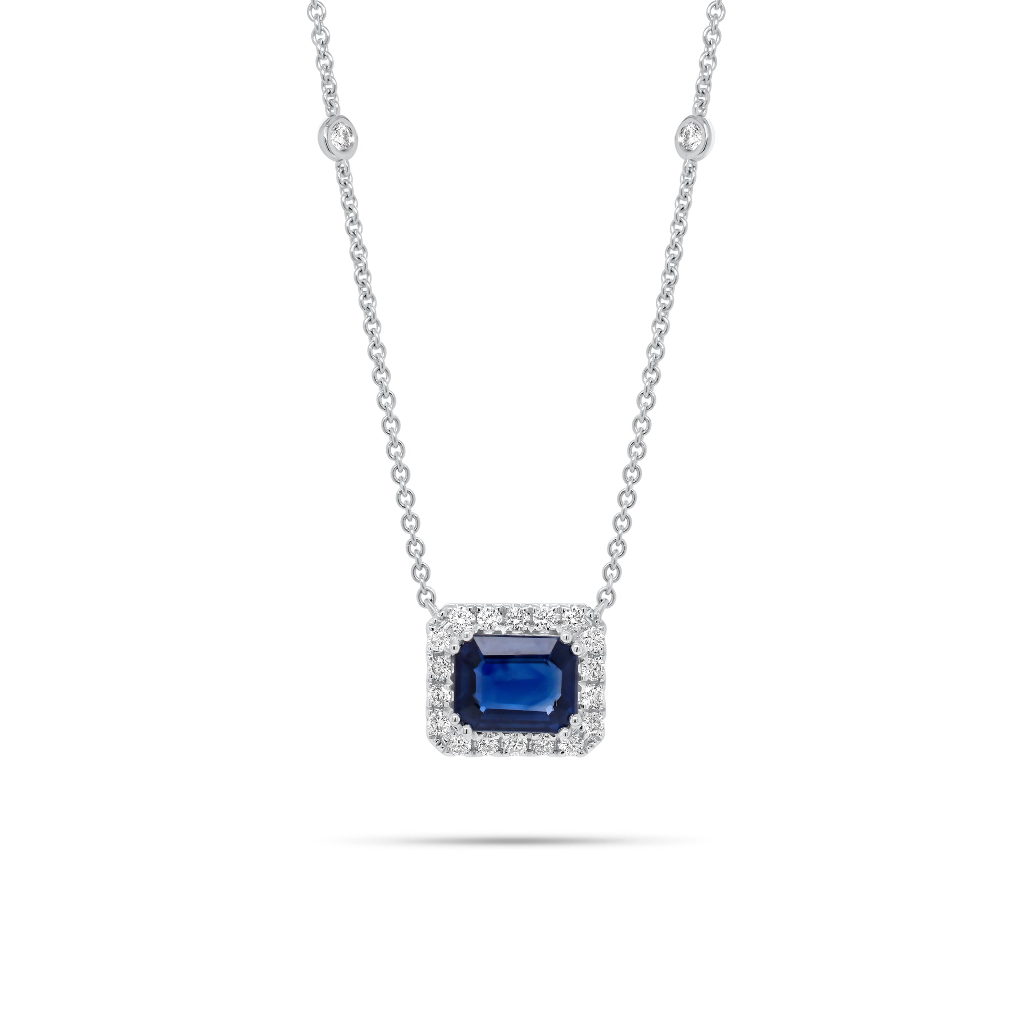 Why not brighten your days with a pop of color? This gorgeous necklace features an emerald-cut sapphire pendant, framed by a glittering diamond halo. Bezel-set diamonds set along its delicate cable chain add a tasteful touch of sparkle.