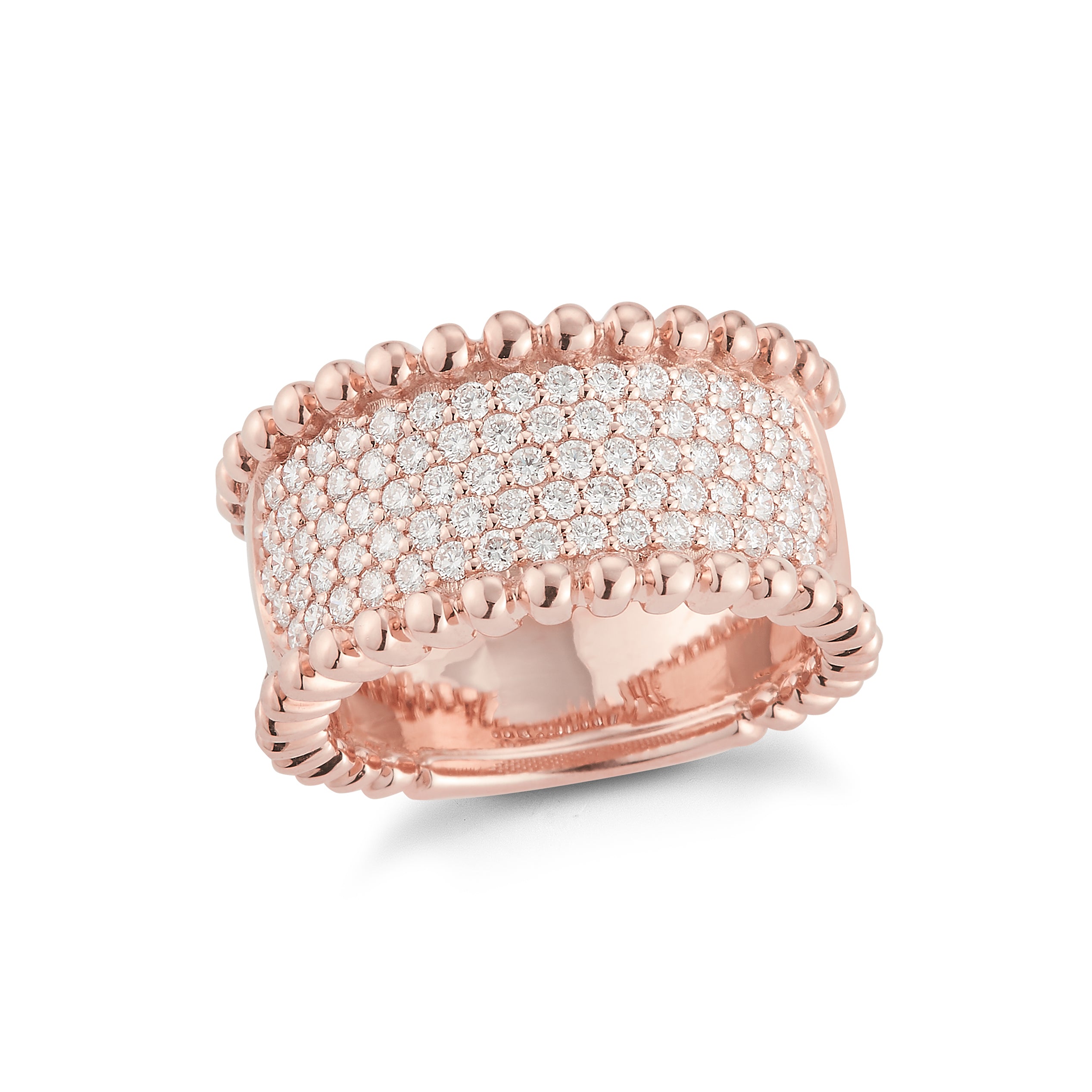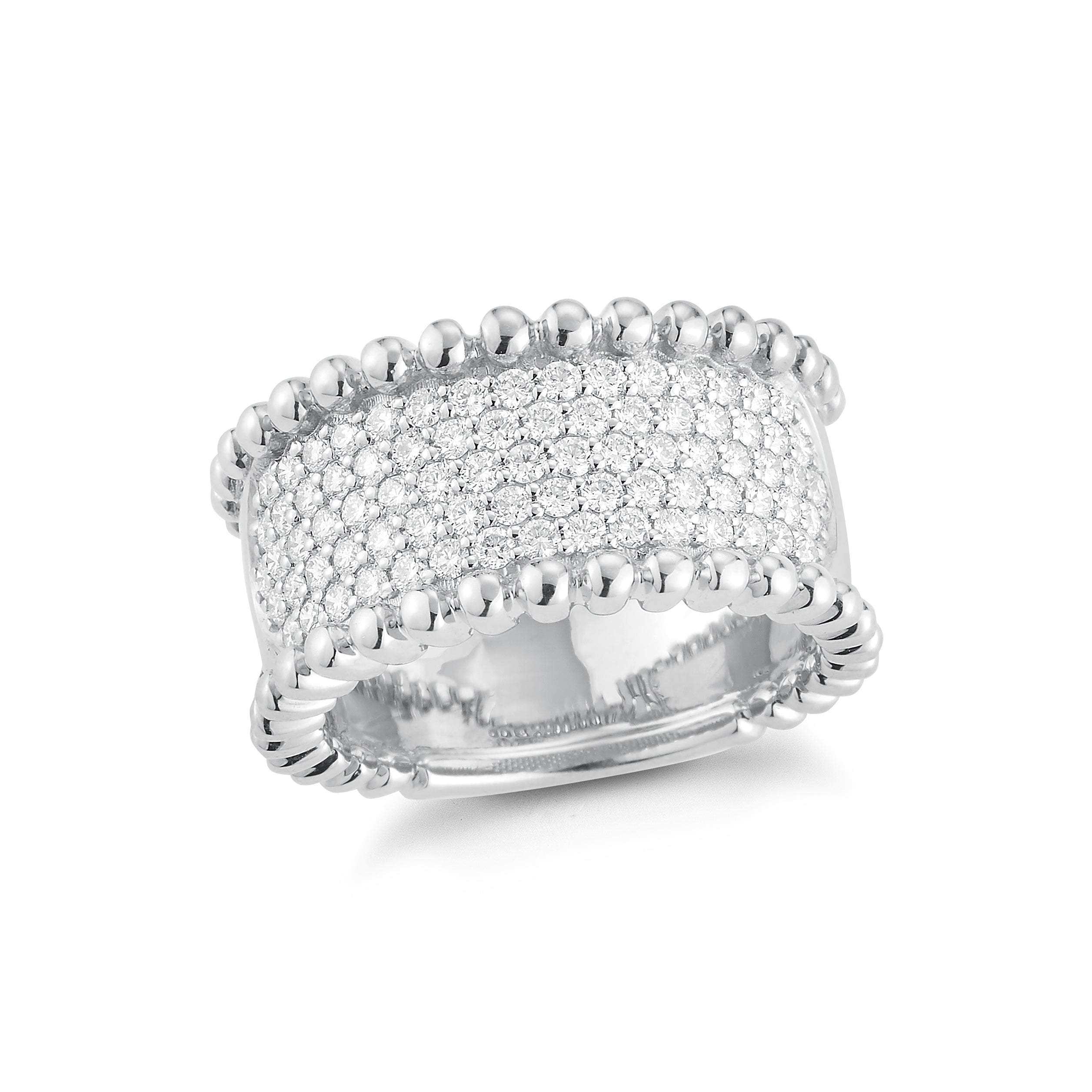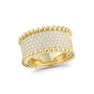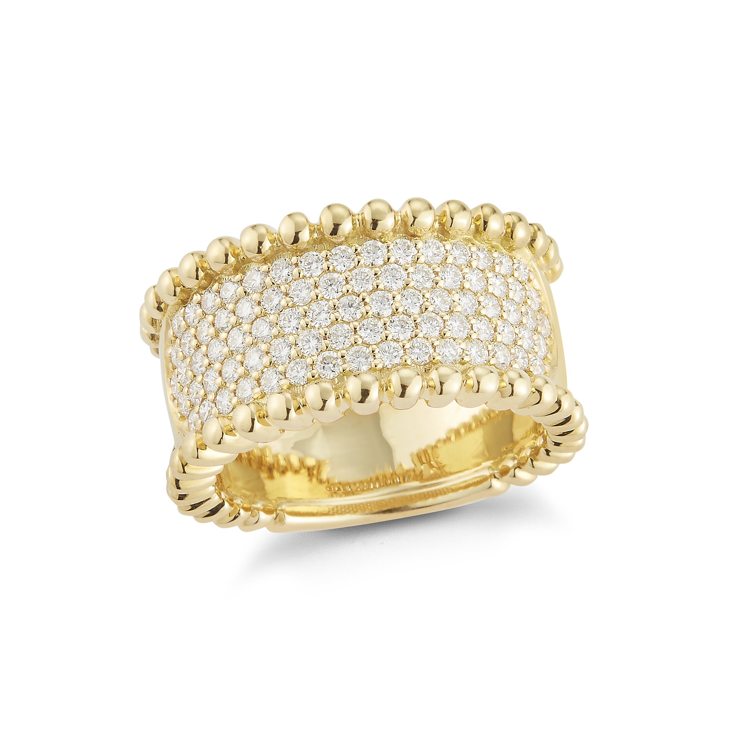 These shared-prong set diamonds accented with beaded 18k gold creates a show-stopping ring perfect for any hand.