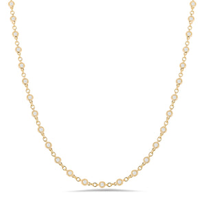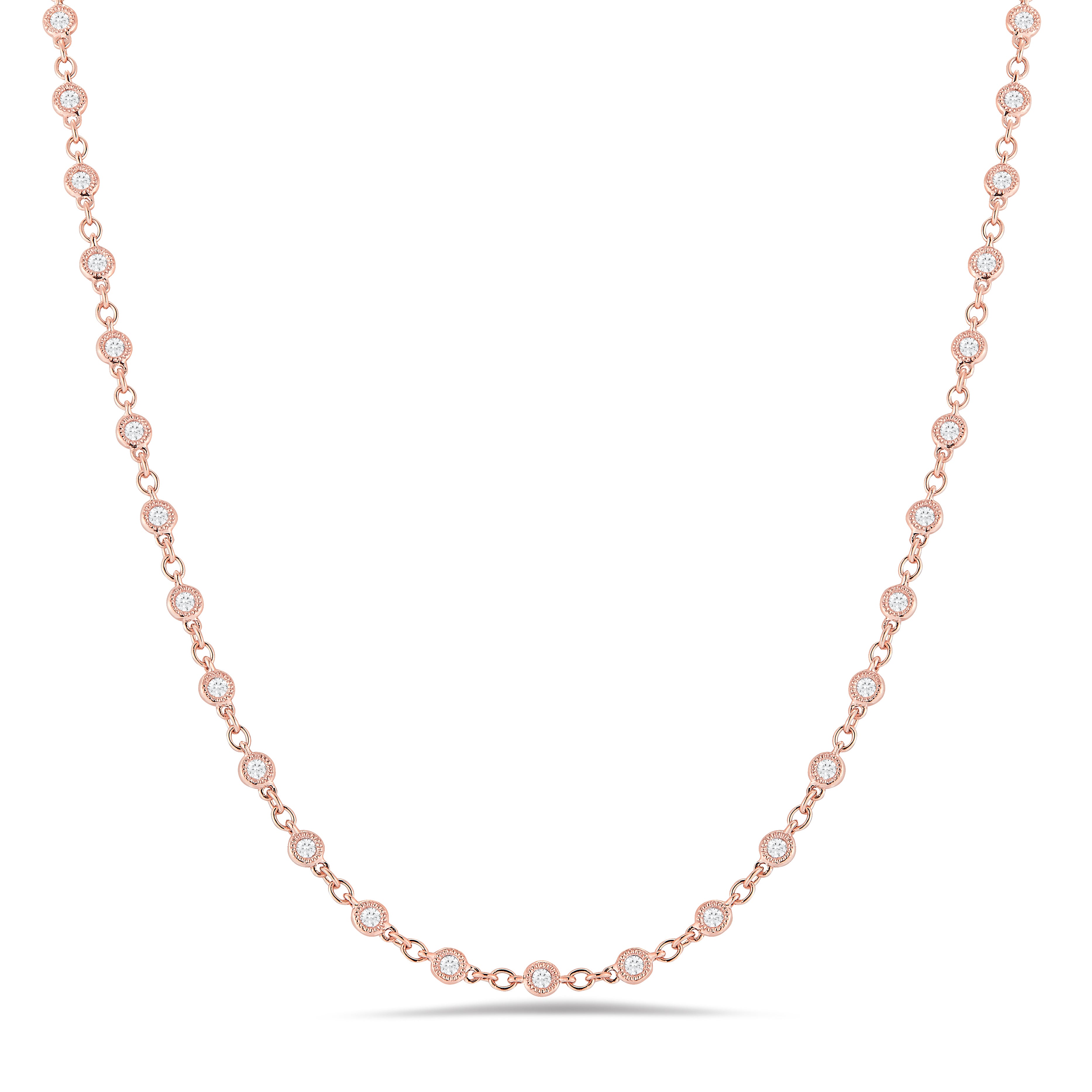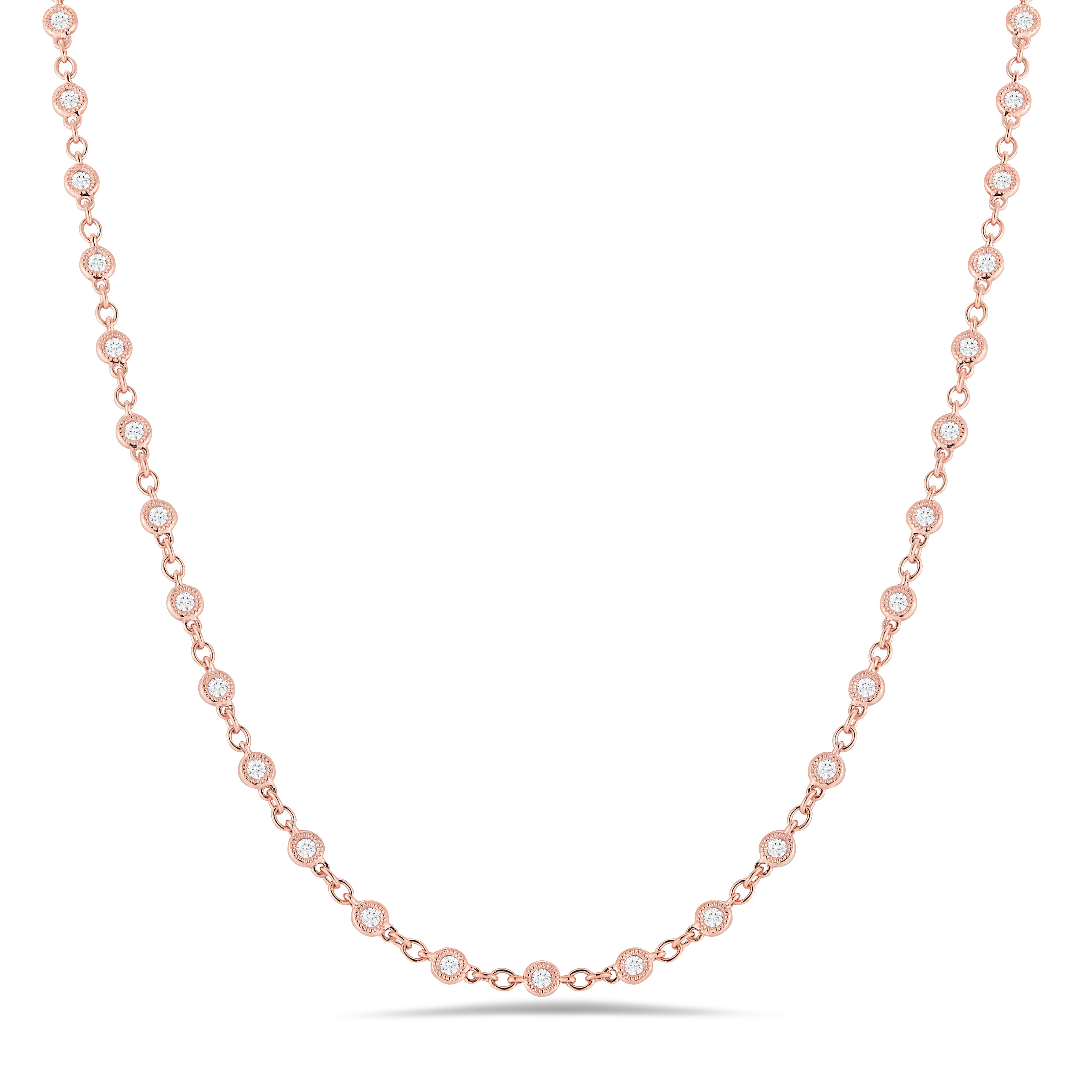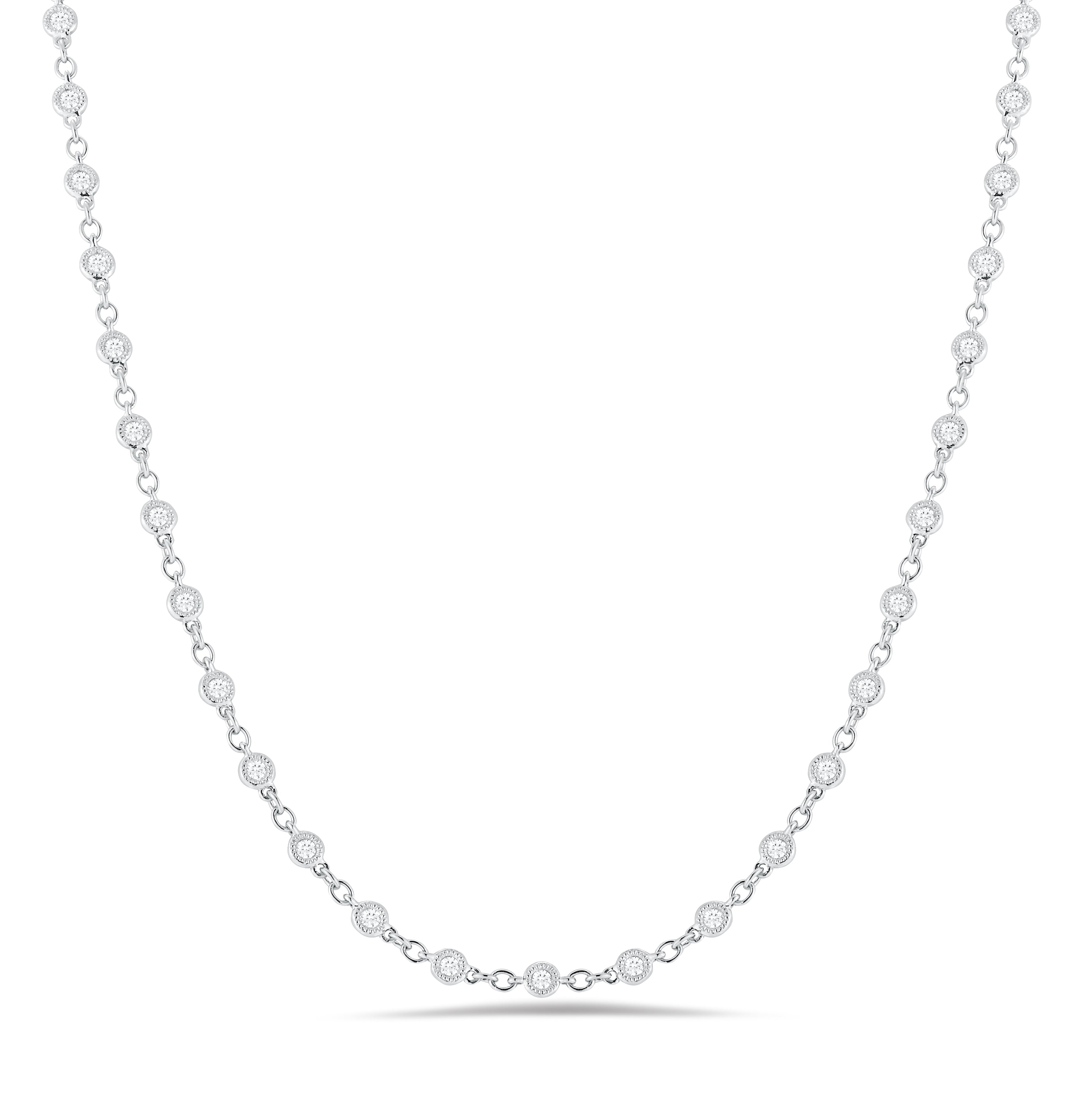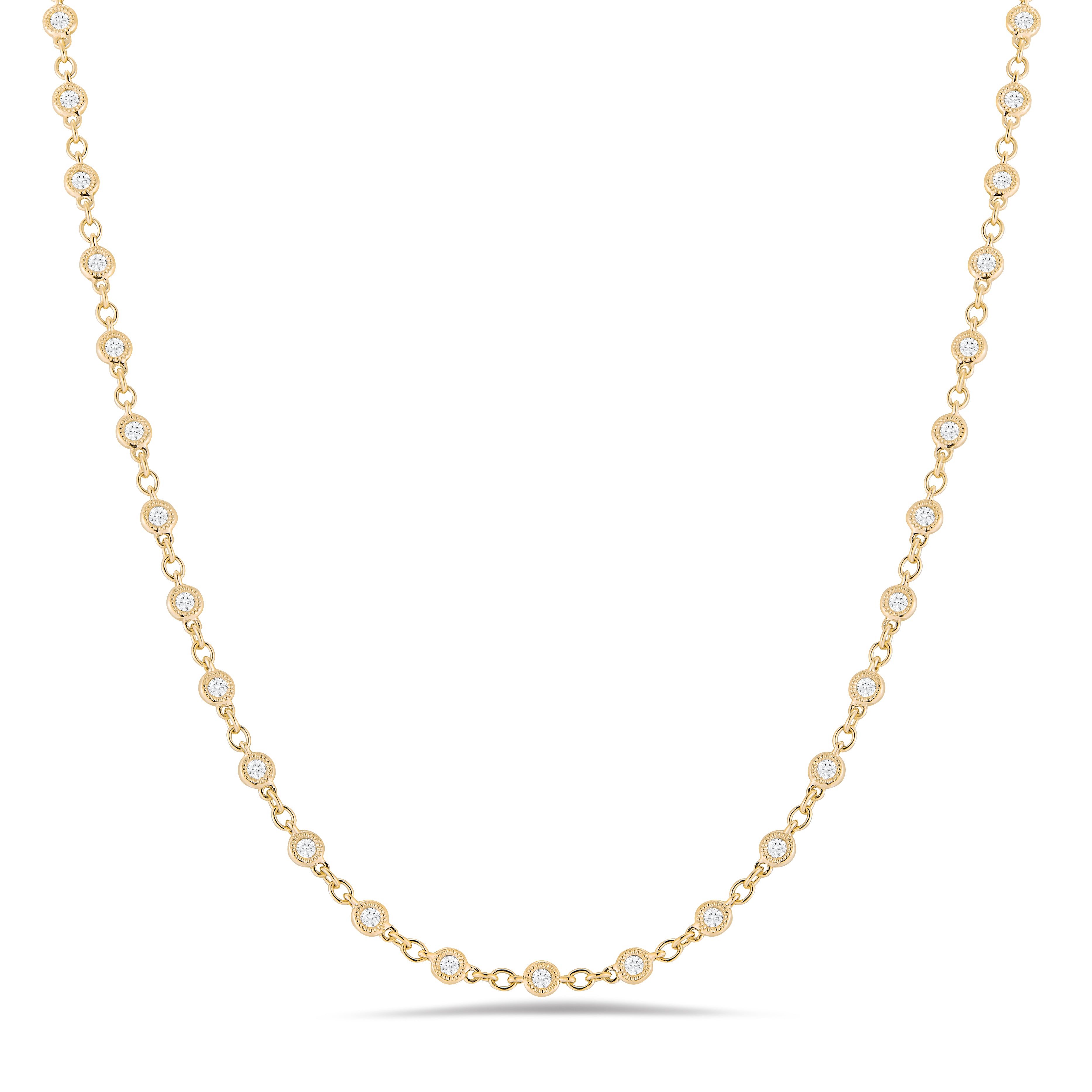 This necklace is the perfect mix of modern and vintage design, crafted to accent the beauty of the round brilliant diamond with a milgrain bezel setting in 18k gold.