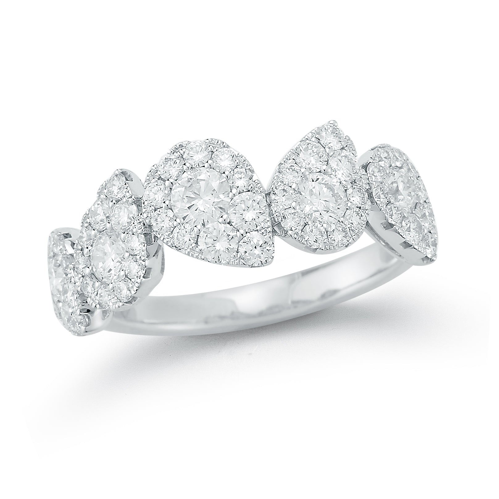 This stunning diamond ring is set in pear shaped halos to make for its' unique design. The diamonds are embedded into 18k gold of your choice.