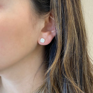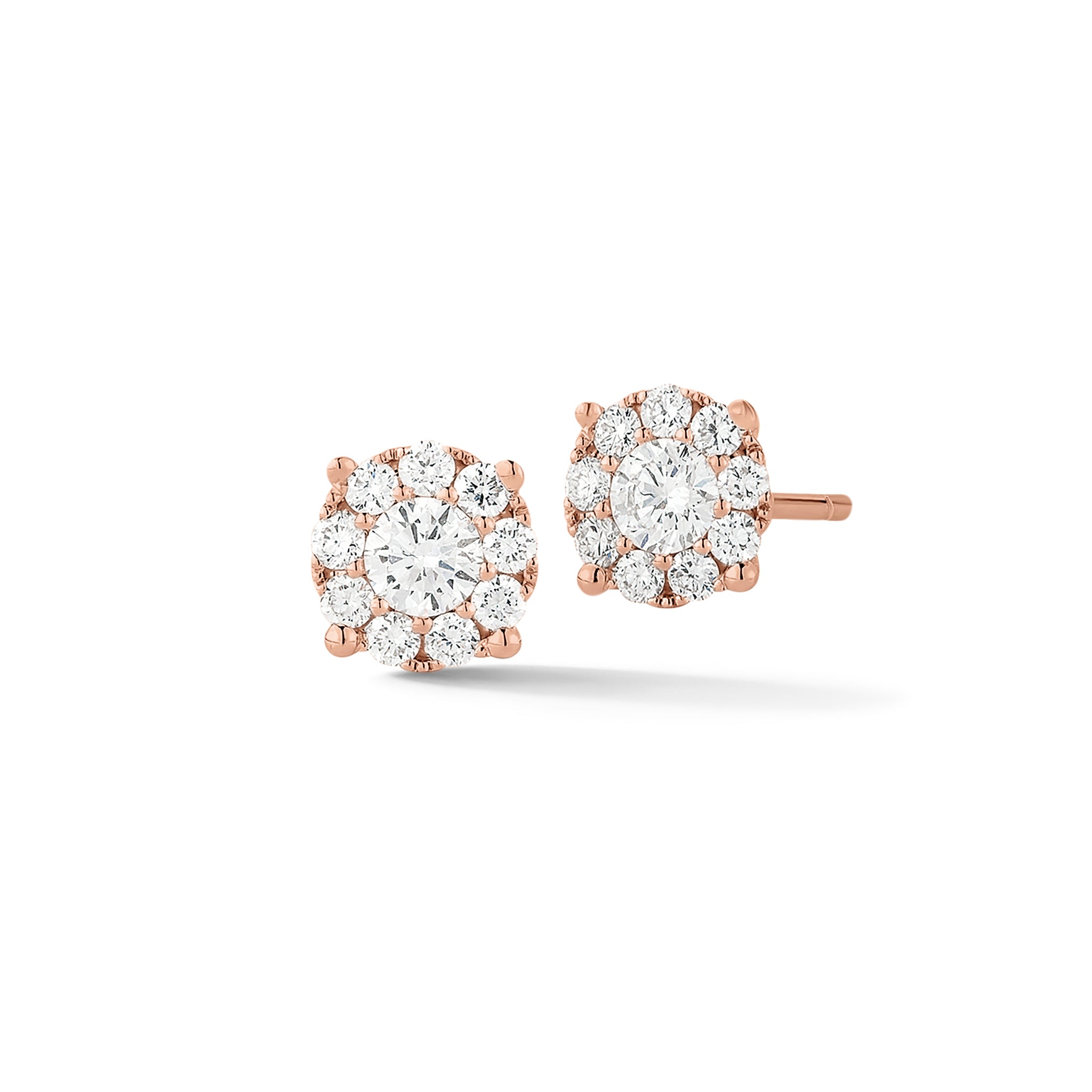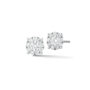 These classic diamond stud earrings feature a brilliant round-cut diamond surrounded by a halo of smaller diamonds set in 18k white gold.