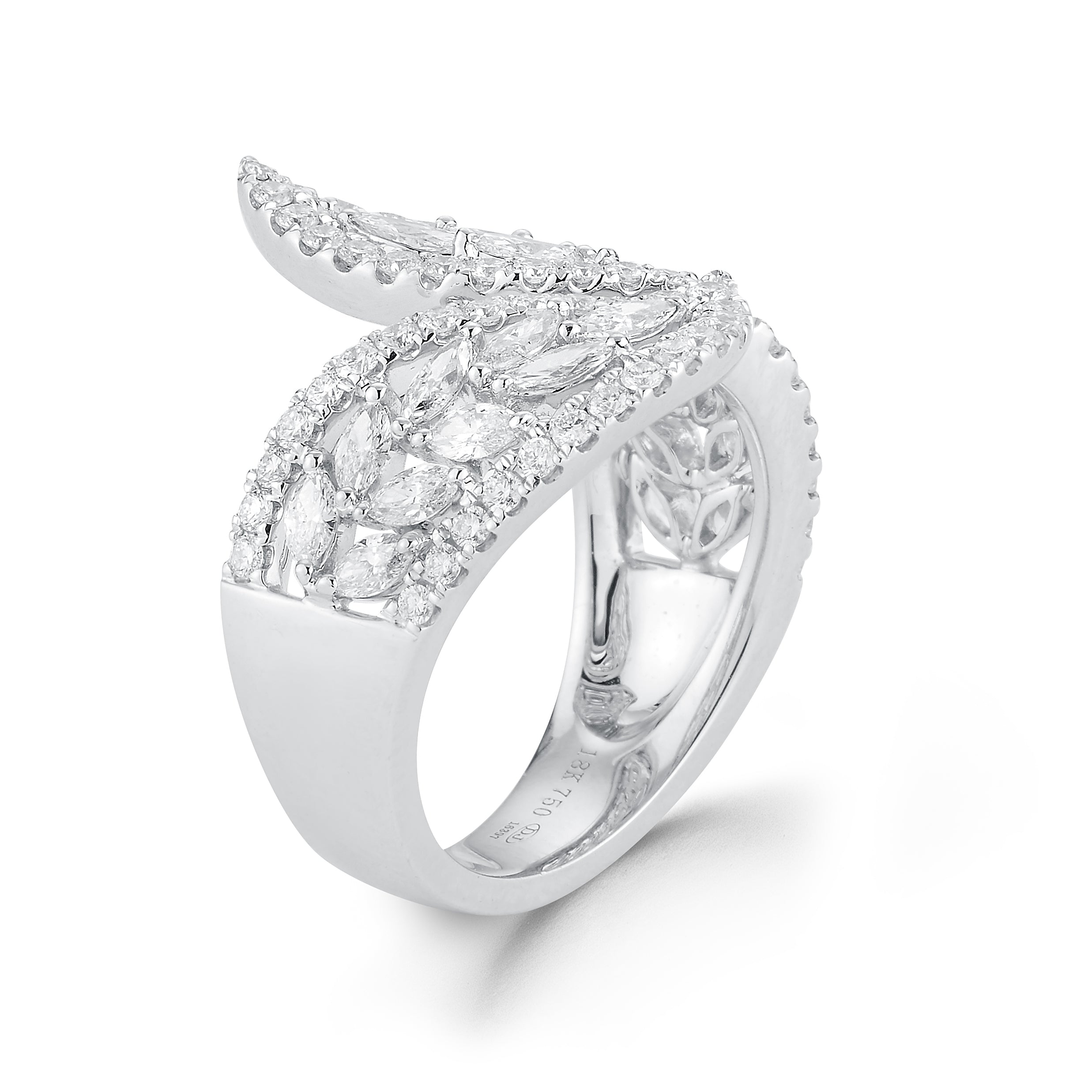 Two leaves made up of marquise and round diamonds entwine to create this exquisite statement ring.