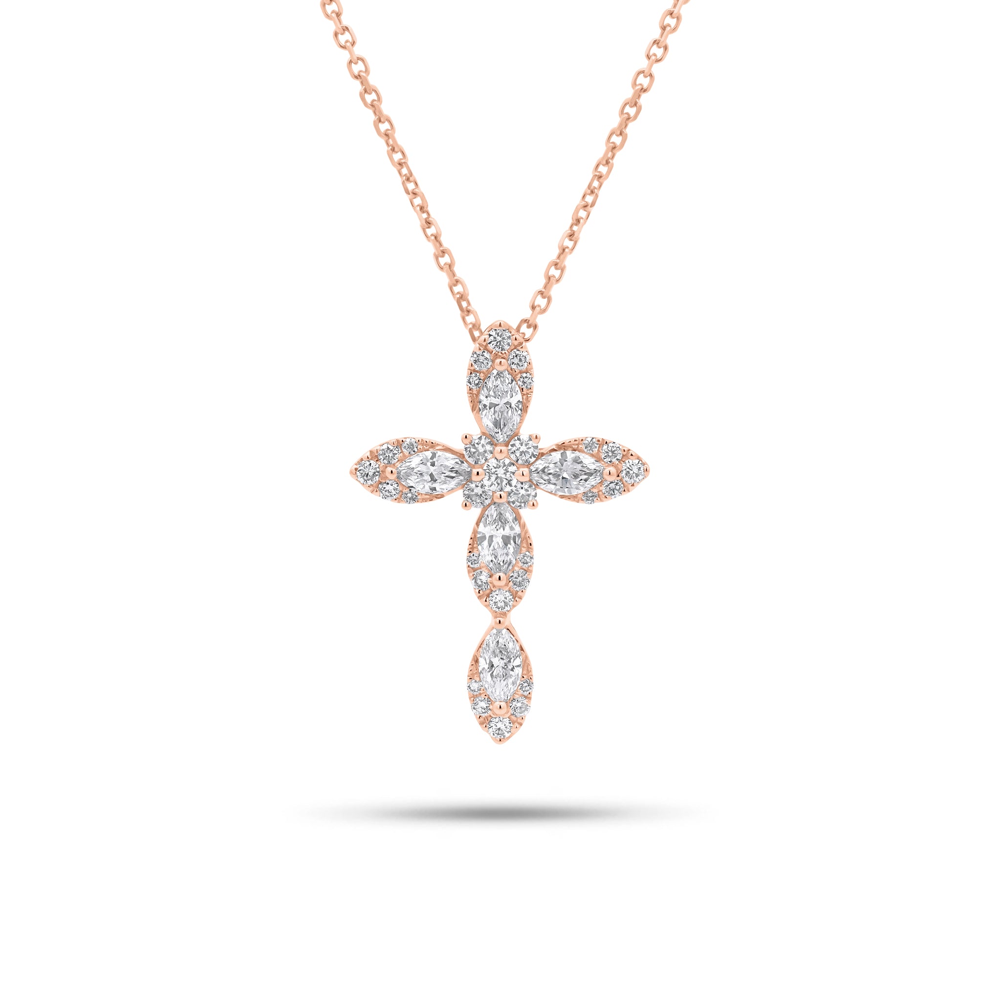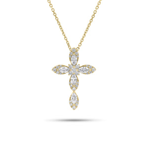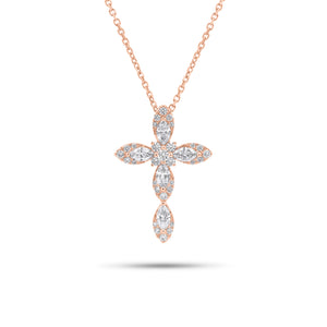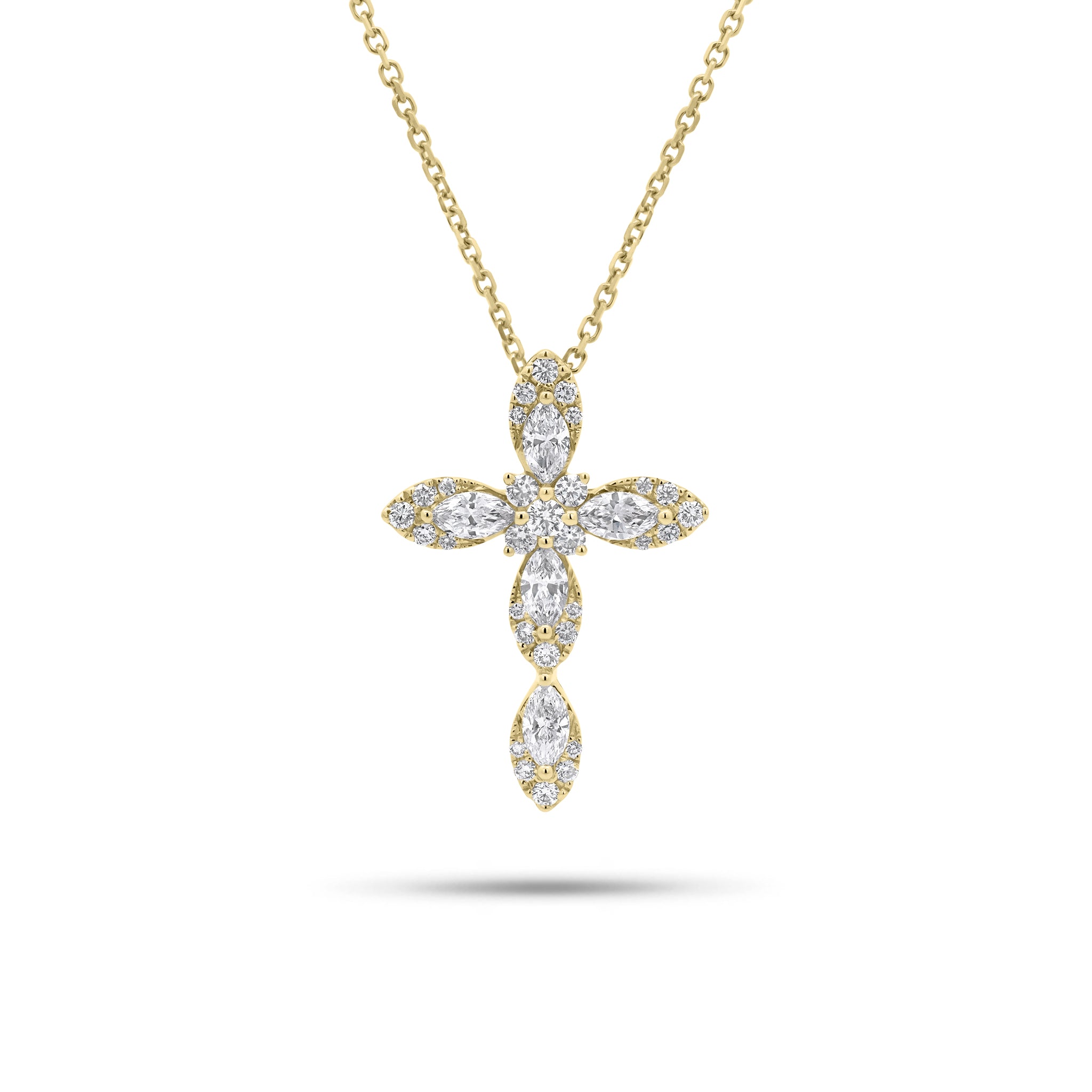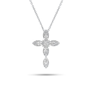 This elaborate cross pendant showcases a brilliant display of round and marquise-shaped diamonds. A beautiful way to honor one’s faith, it will make for a meaningful gift or a cherished personal keepsake.