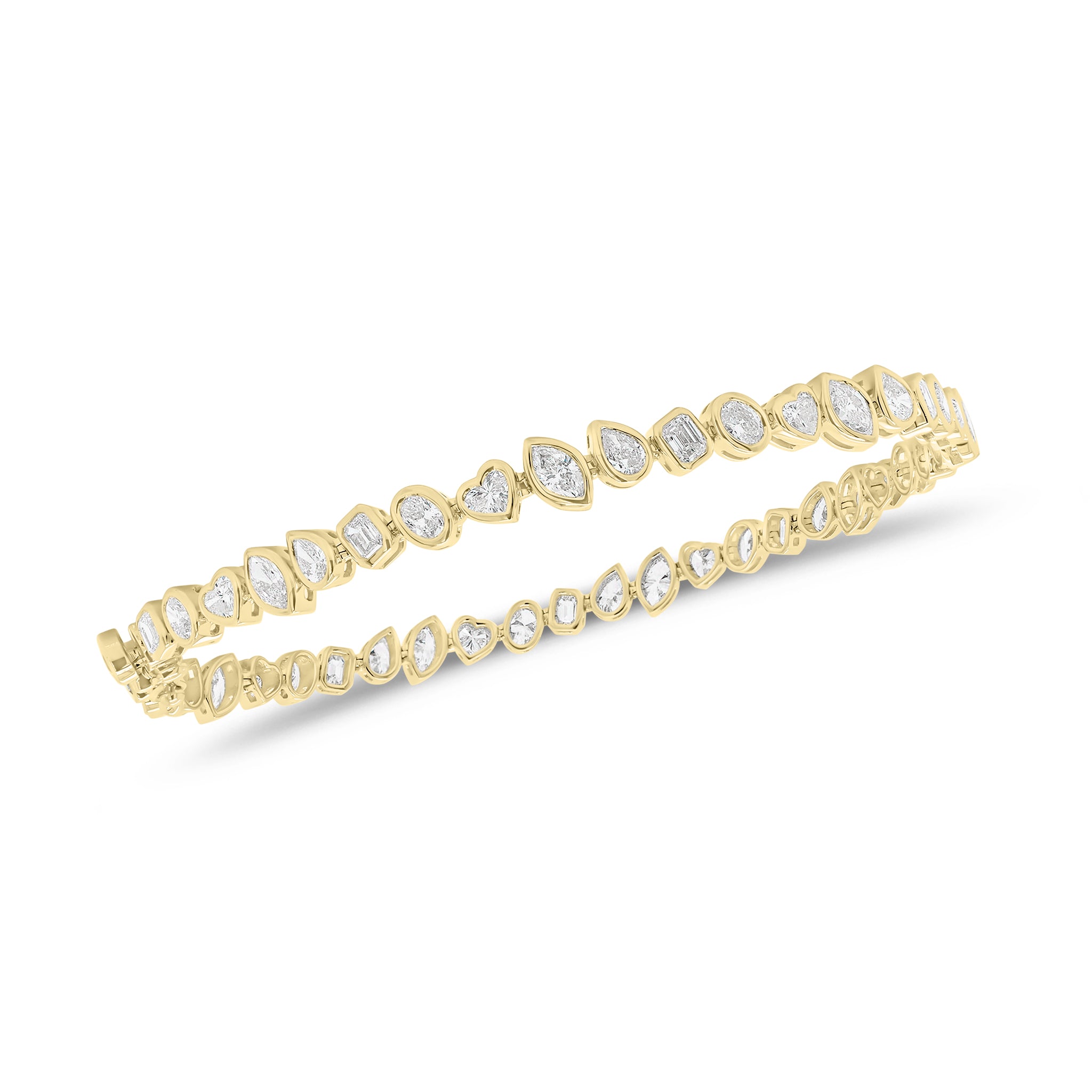 Add some fun and whimsy to your looks with this elaborate bracelet. Featuring emerald-cut and pear, oval, heart, and marquise-shaped diamonds bezel set in 14K gold, this piece offers no shortage of sparkling details.