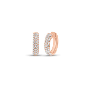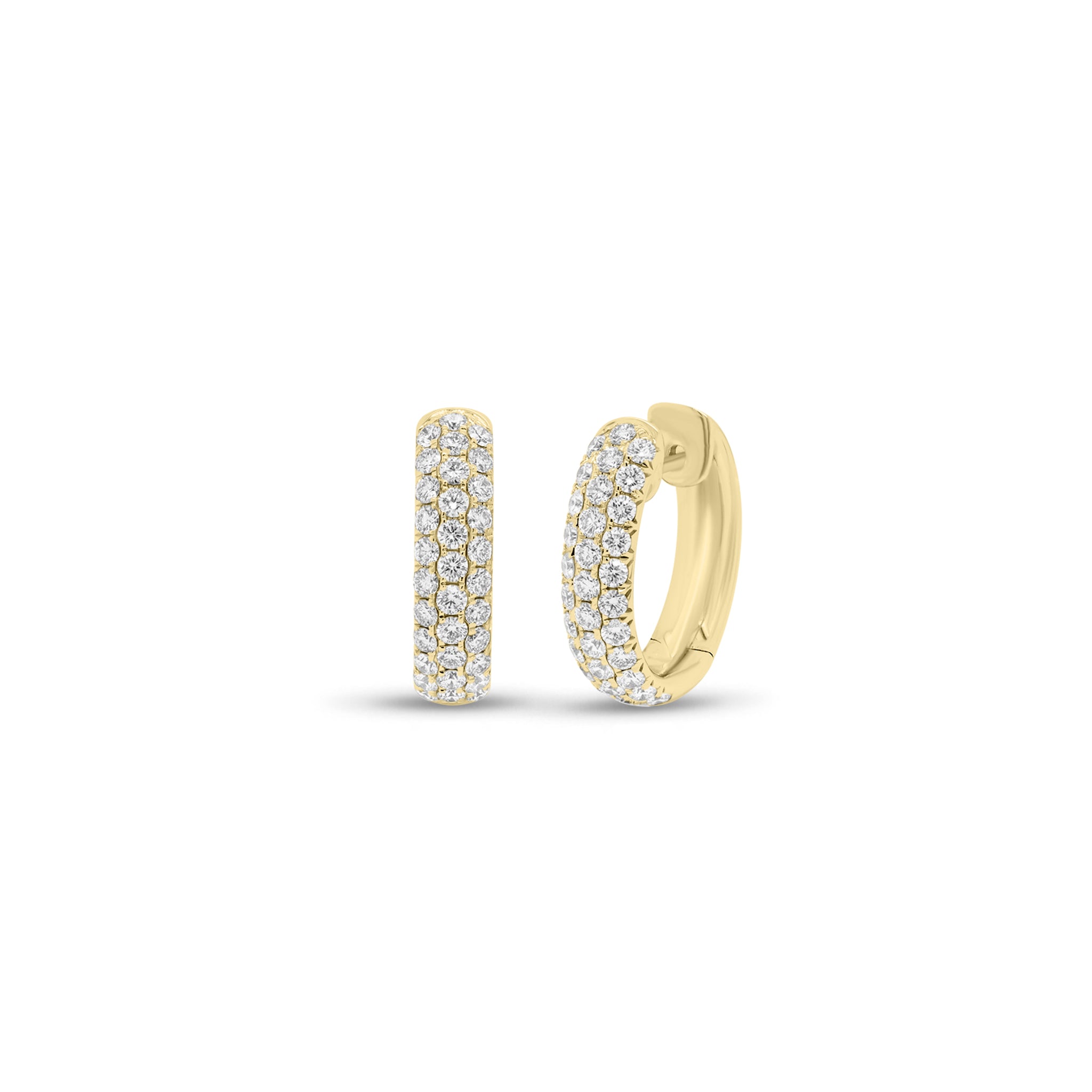 Add some sparkle to your styles with these dainty huggie earrings. Featuring three rows of twinkling diamonds in 18K gold, these delicate, miniature hoops will complement any look.