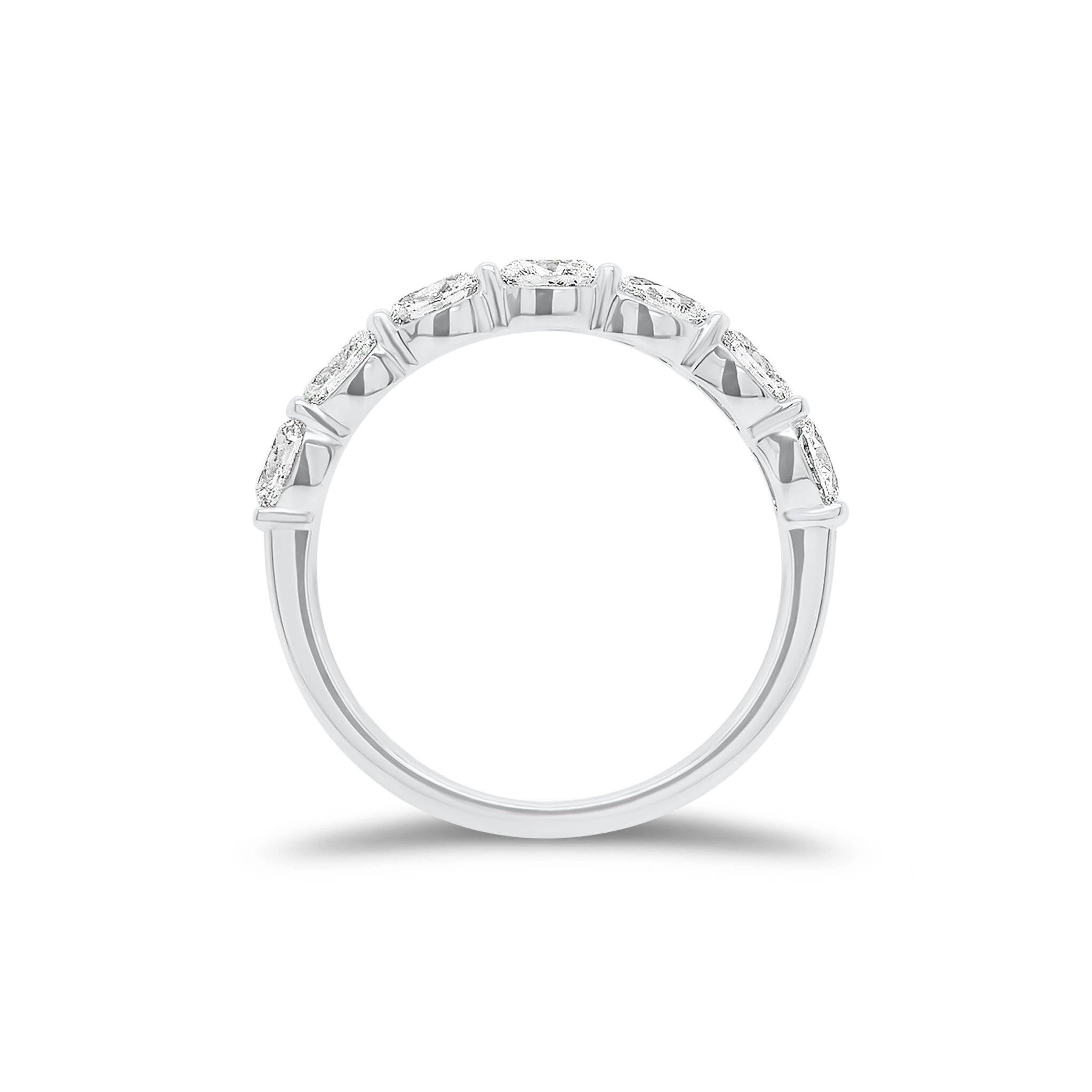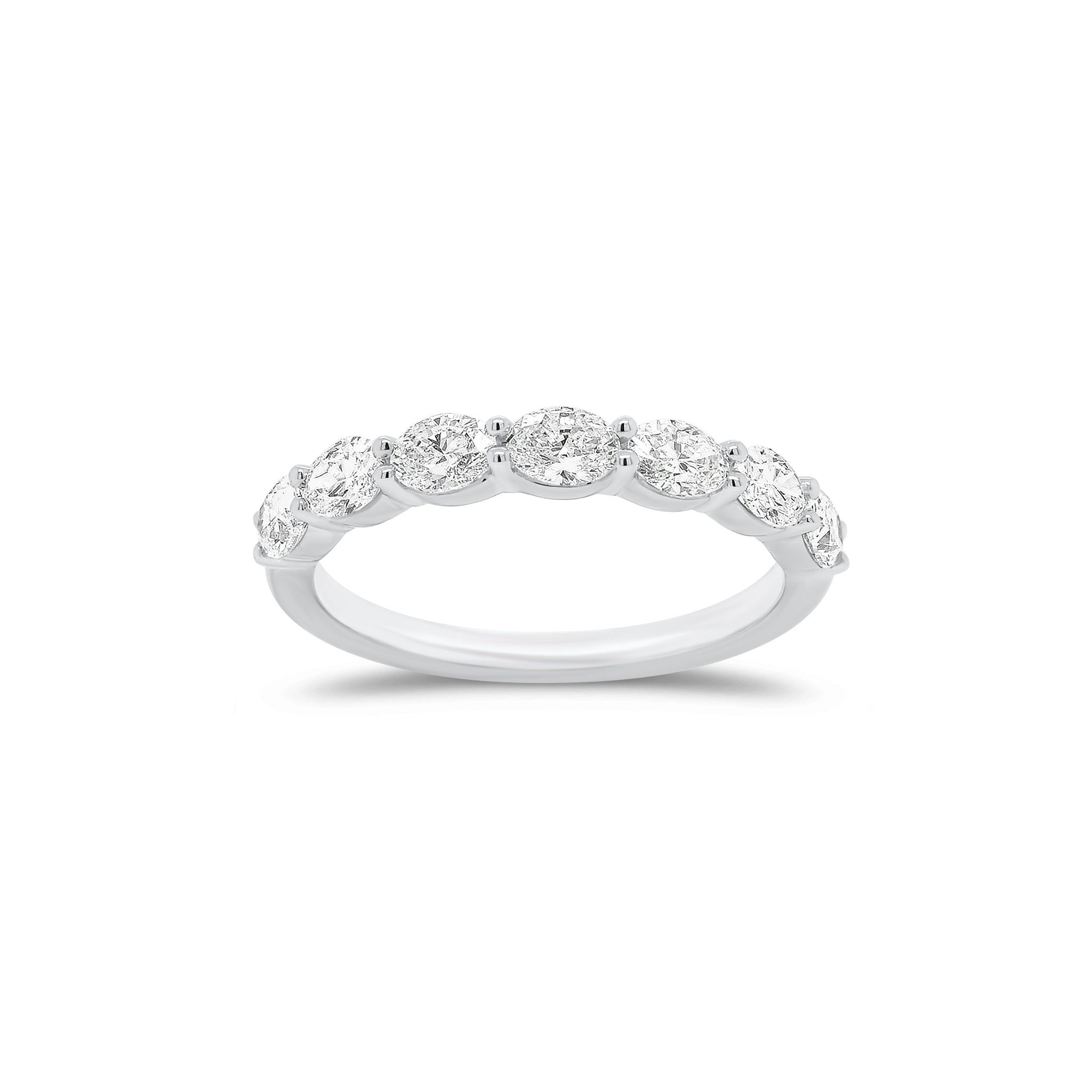 This classic 18K gold wedding band showcases seven oval-shaped diamonds. The unique cut of the oval diamonds flatters all stone shapes, making this band an effortless complement to your engagement ring.