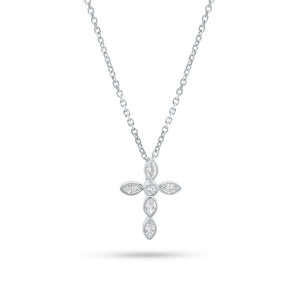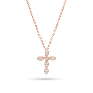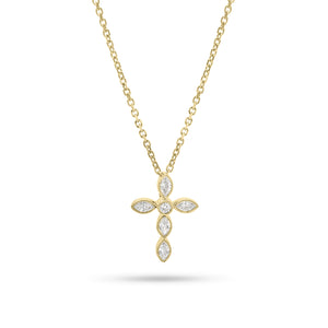 Express your spirituality with this beautiful and unique cross pendant. Featuring five marquise-shaped diamonds and a round diamond center set in 18K gold with milgrain detail, this piece was designed to be cherished for a lifetime.
