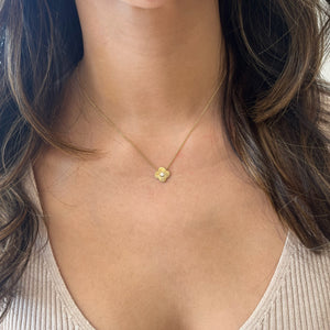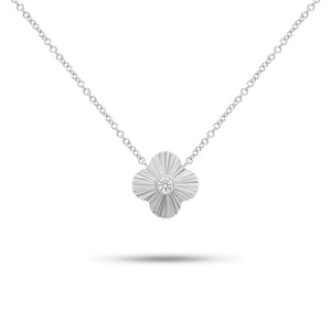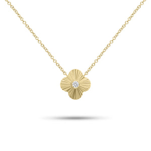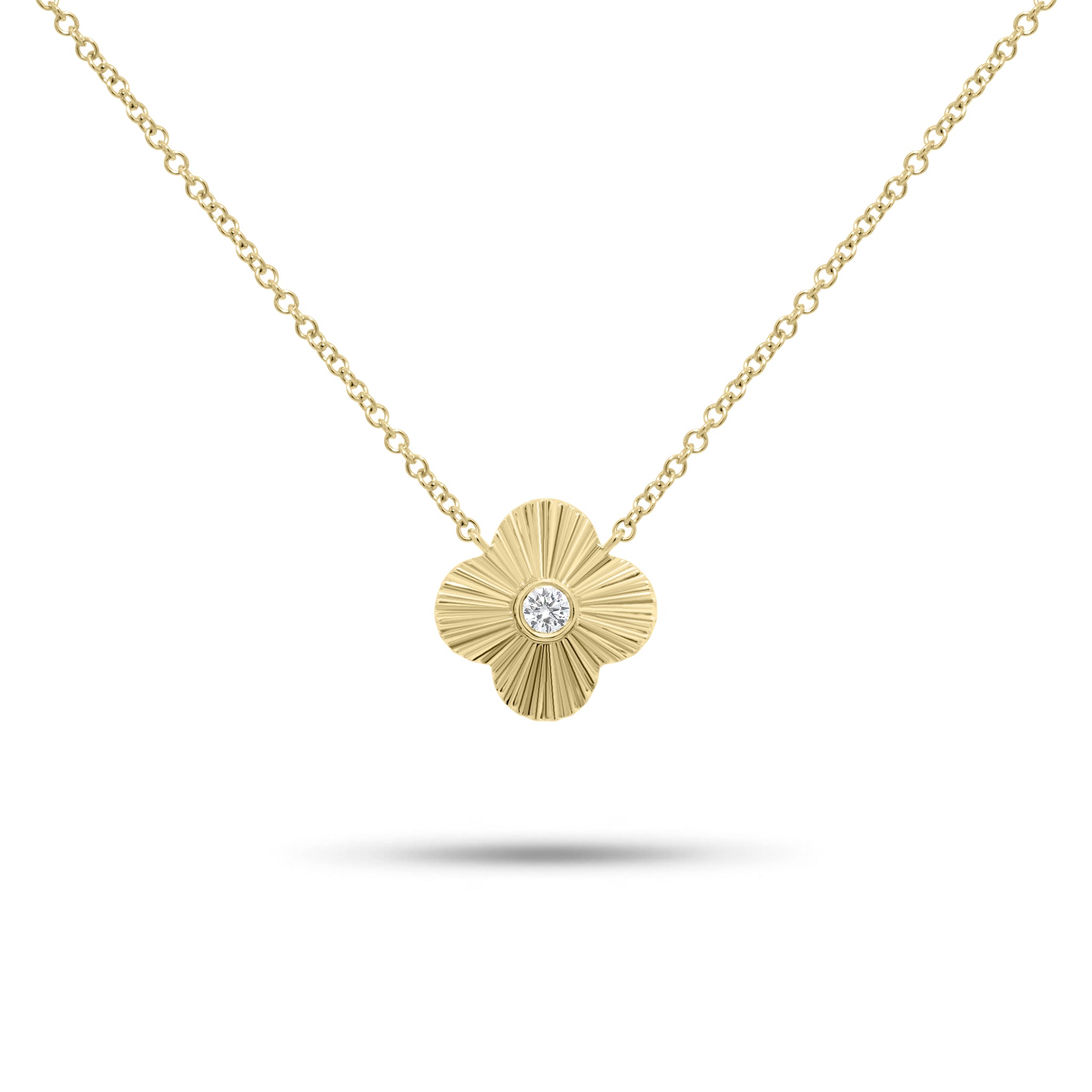 Simply stunning, this clover pendant features a bezel-set diamond and ridged gold detail. Placed along a delicate 14K gold cable chain, this dainty piece will effortlessly elevate your everyday looks.