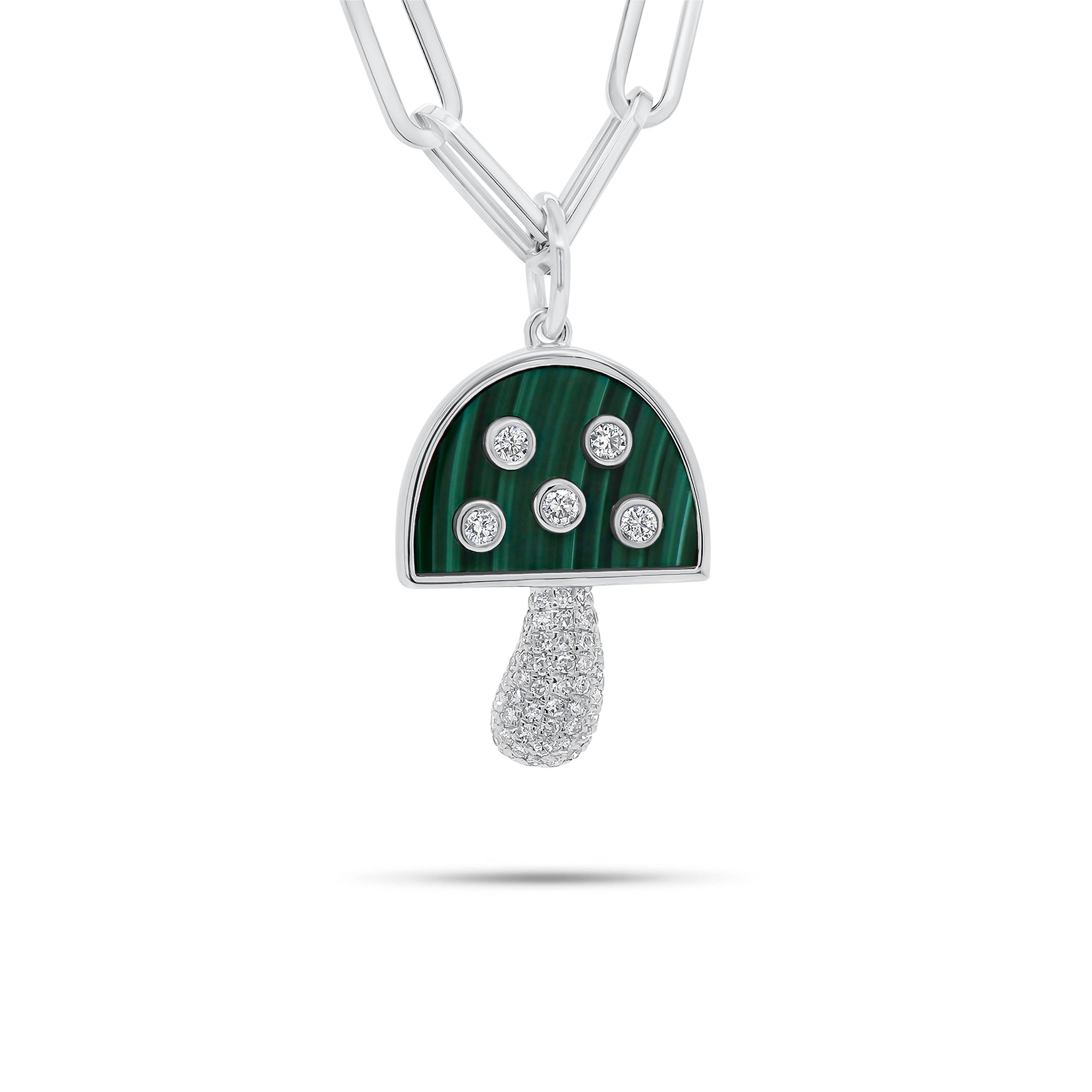 A perfect gift for the unique gal with cool & quirky style, this 14K gold mushroom pendant dazzles with sparkling round diamonds and a vibrant malachite inlay. Pair it with a sleek paperclip chain for a bold and modern look.