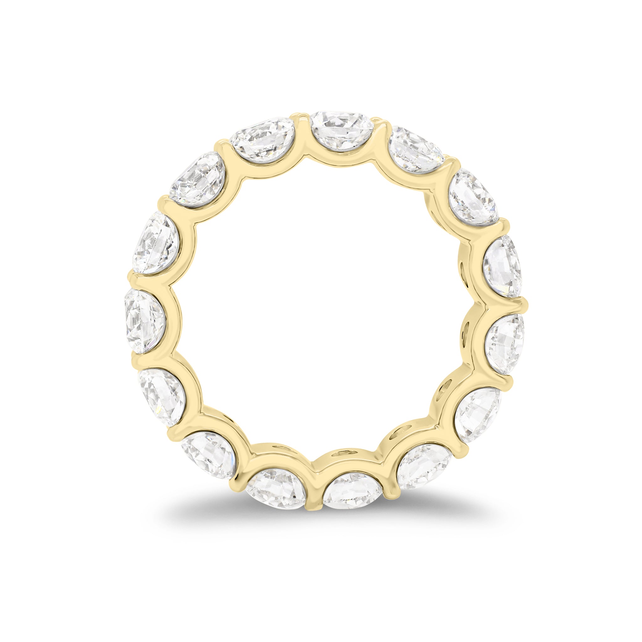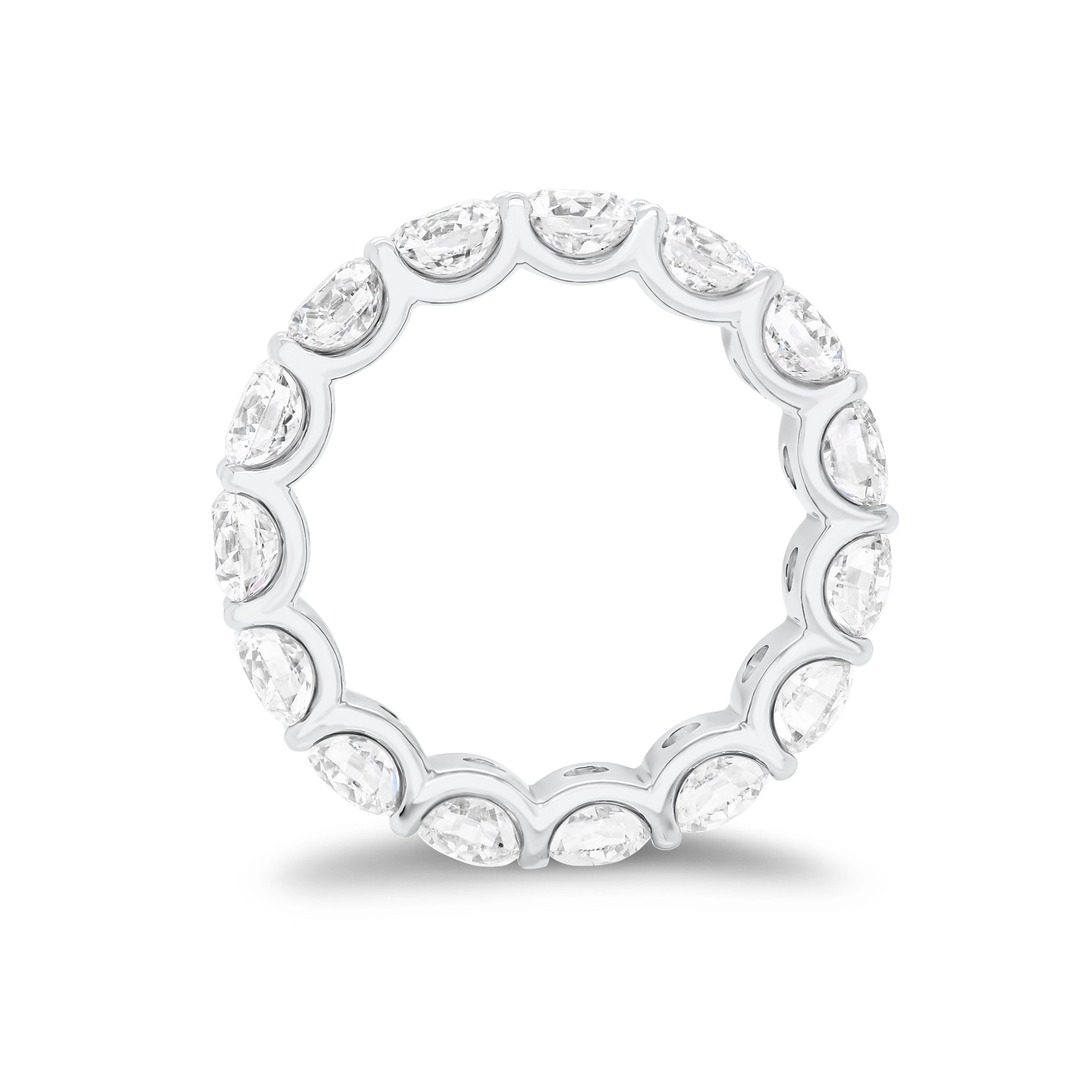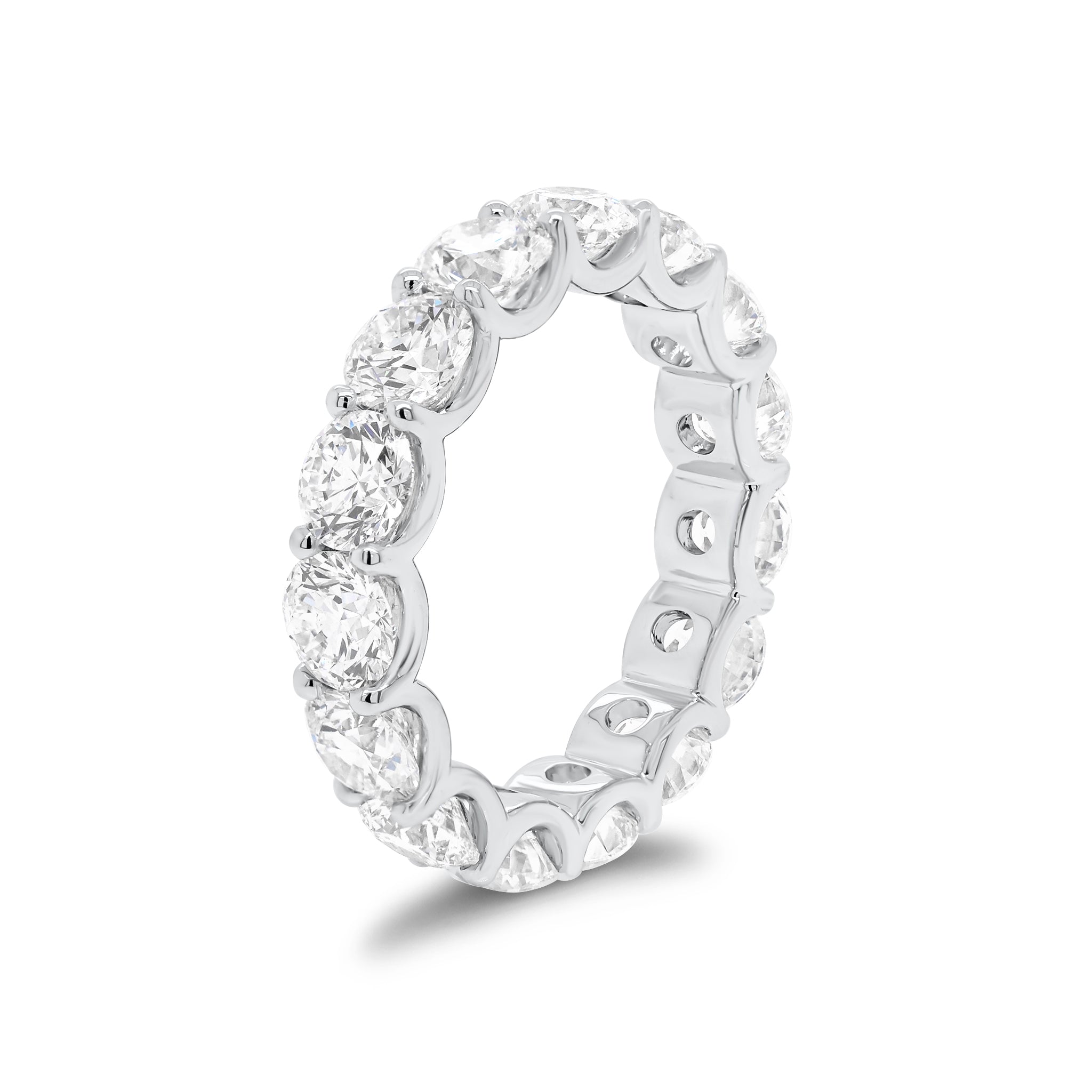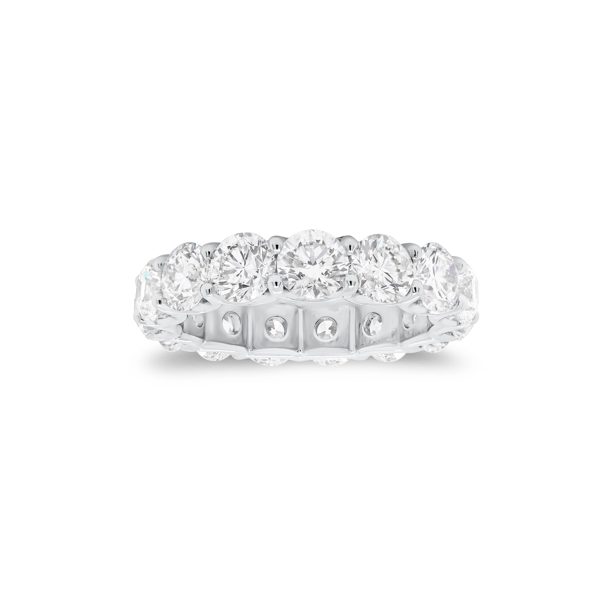 Let your love shine forever with this stunning eternity band. Featuring 16 round brilliant-cut diamonds weighing nearly four carats in a shared prong u-shaped gallery setting, this stunning ring is classic and timeless perfection.