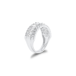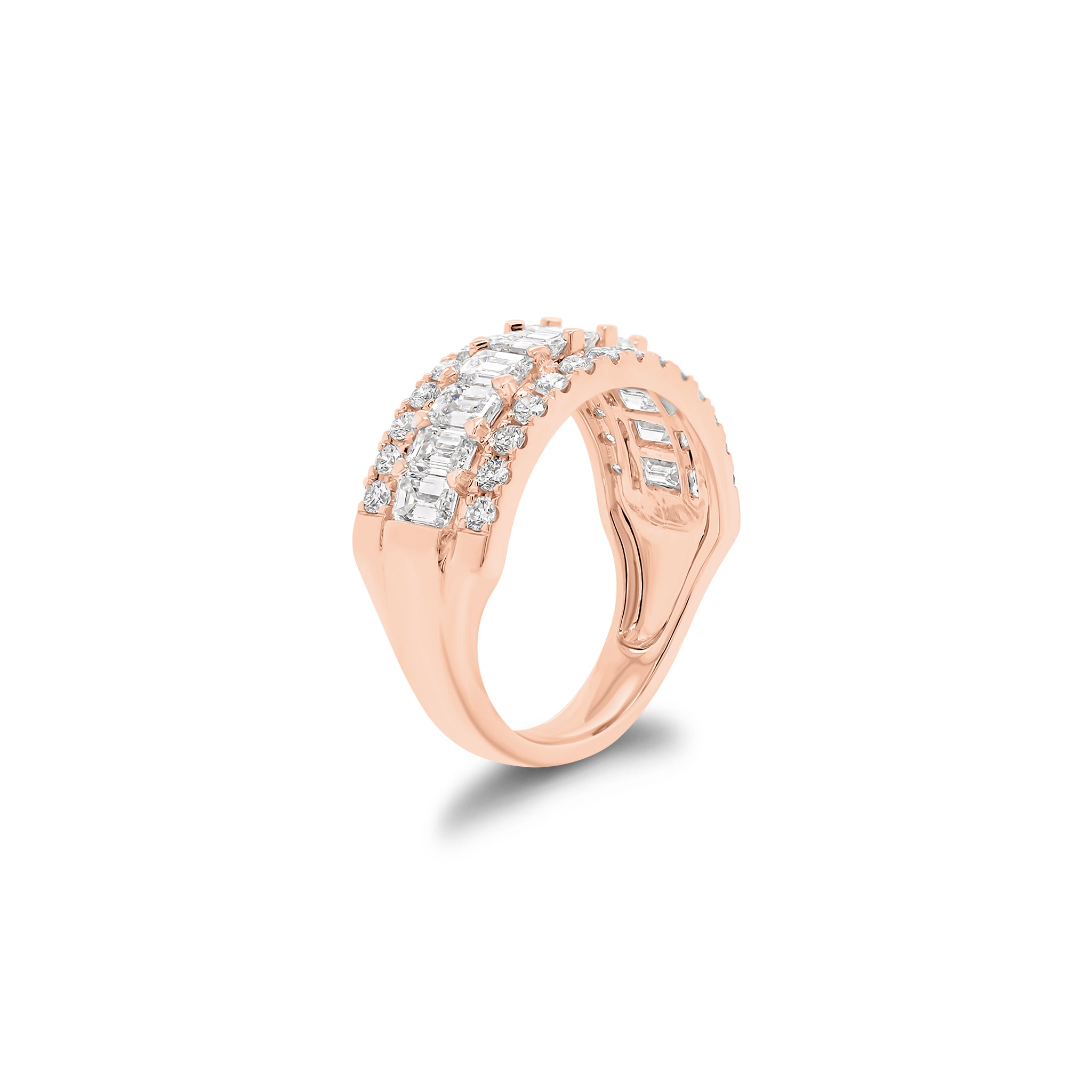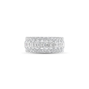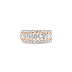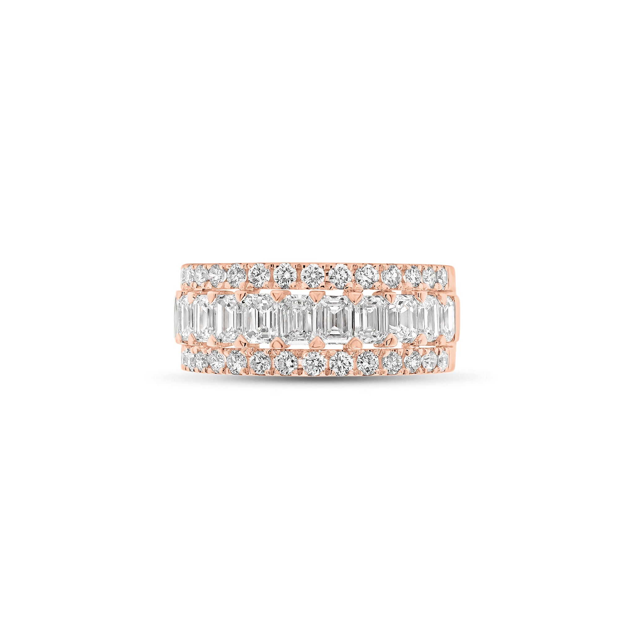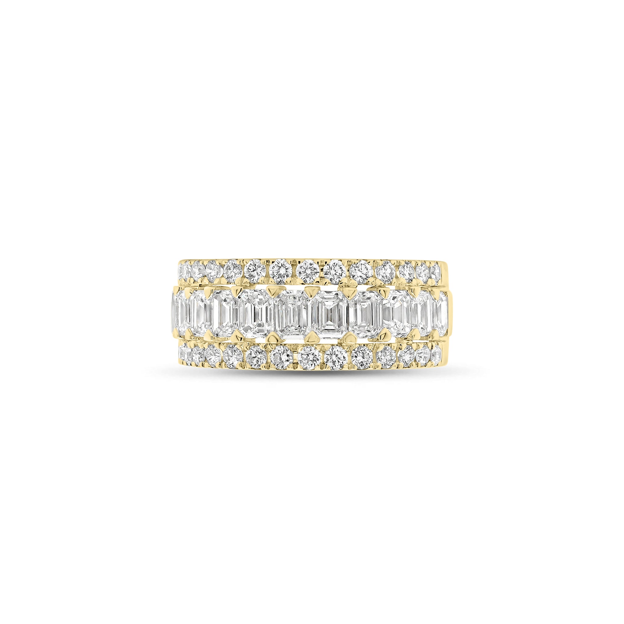 Enhance the glam factor of your engagement ring with this dazzling wedding band. Featuring a row of striking emerald-cut diamonds bordered on either side by shimmering rounds, this piece showcases a multi-dimensional sparkle. You may also consider wearing it solo on the opposite hand, as this ring shines all on its own.