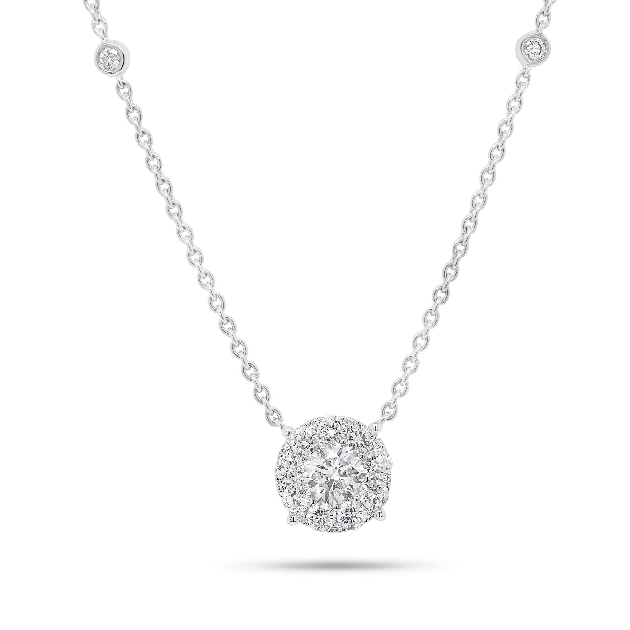 This classic necklace features a round diamond pendant enhanced by a glittering halo. Petite diamonds set along its delicate 18K gold cable chain complete the intricate design.