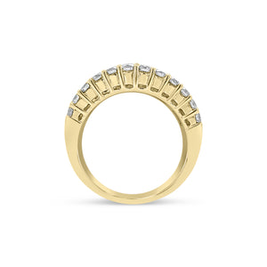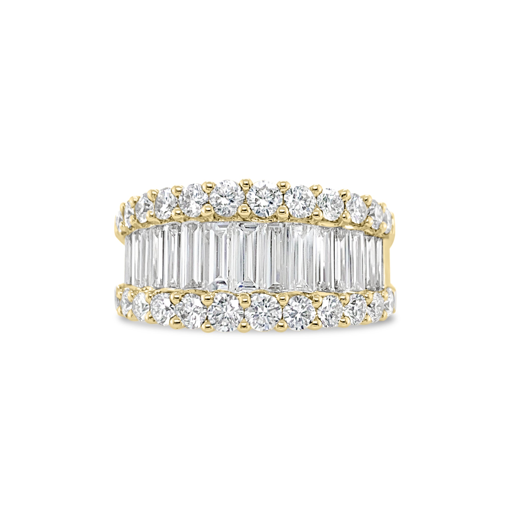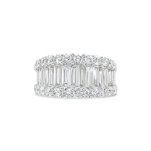 Featuring a row of straight baguettes bordered by bands of shimmering round diamonds, this ring gives off major sparkle.