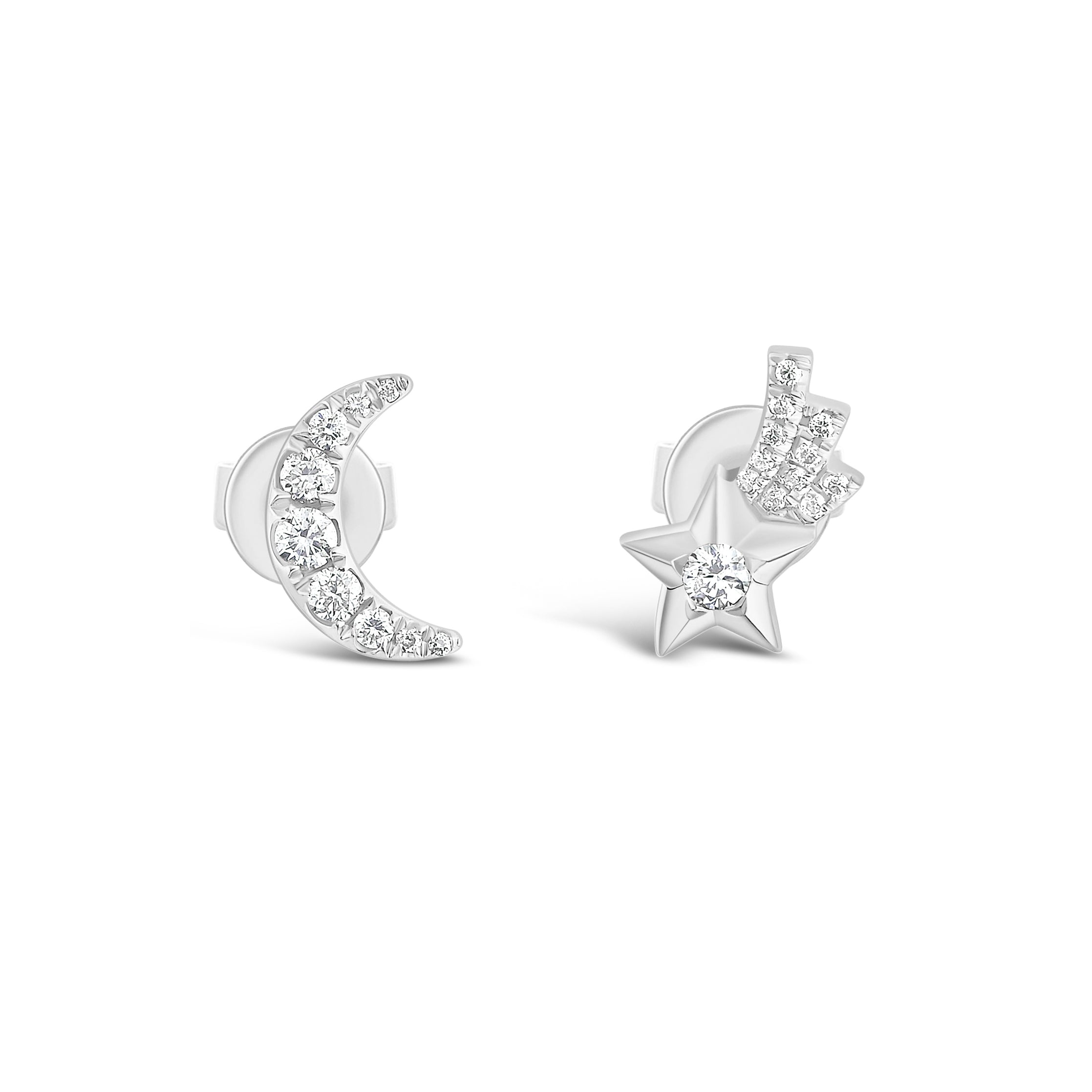 Shine with these unique out of this world studs, one diamond moon and one diamond shooting star, in your choice of 14k gold.