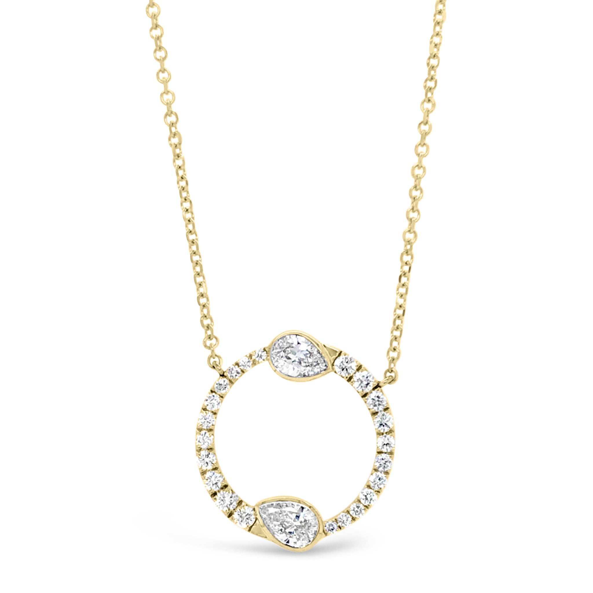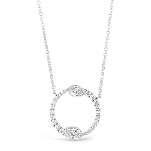 This stunning circular pendant is composed of beautiful round diamonds with an artful addition of two pear-shaped diamonds.