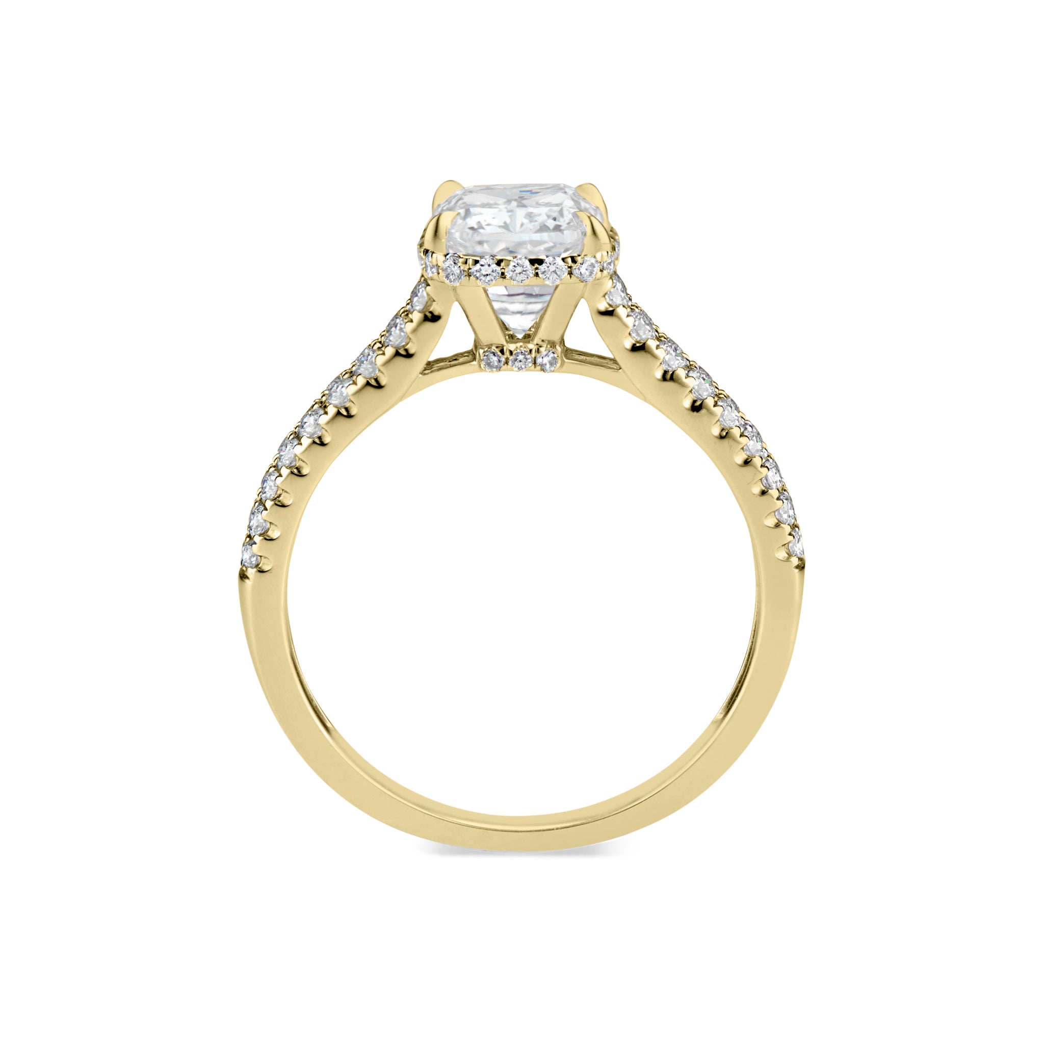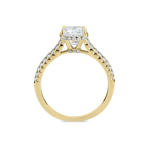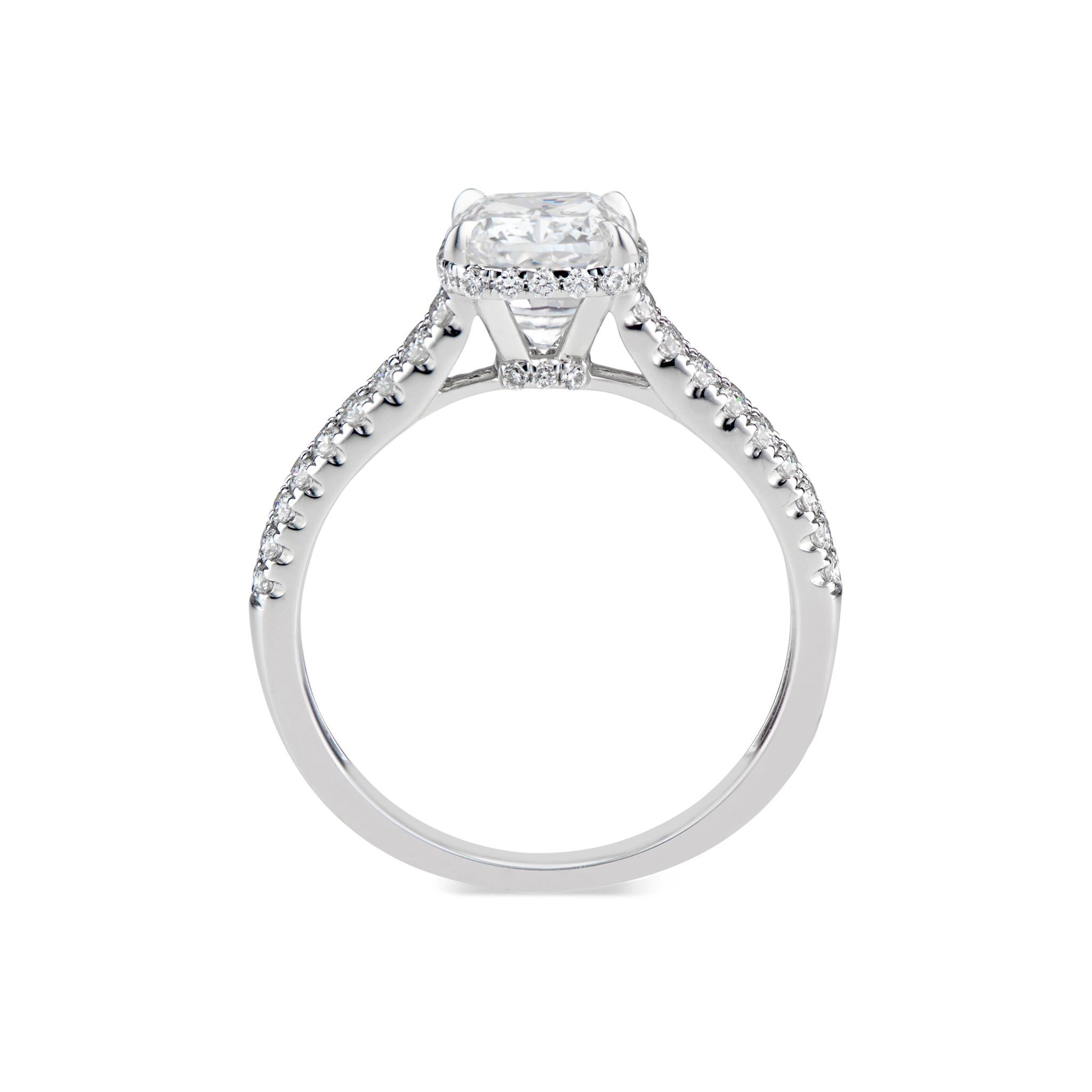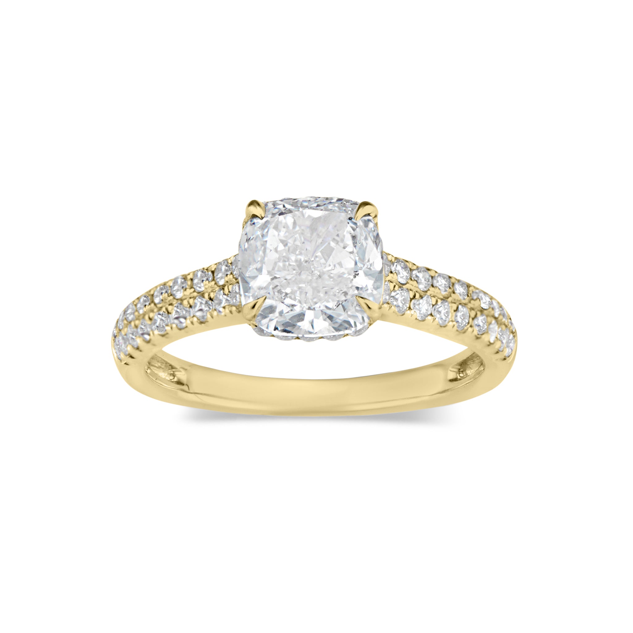 A cushion brilliant-cut diamond is set front and center in this stunning engagement ring. Details like a pave diamond shank, hidden halo, and diamond bridge make it a special piece she’ll love wearing for the rest of her life.