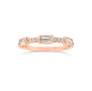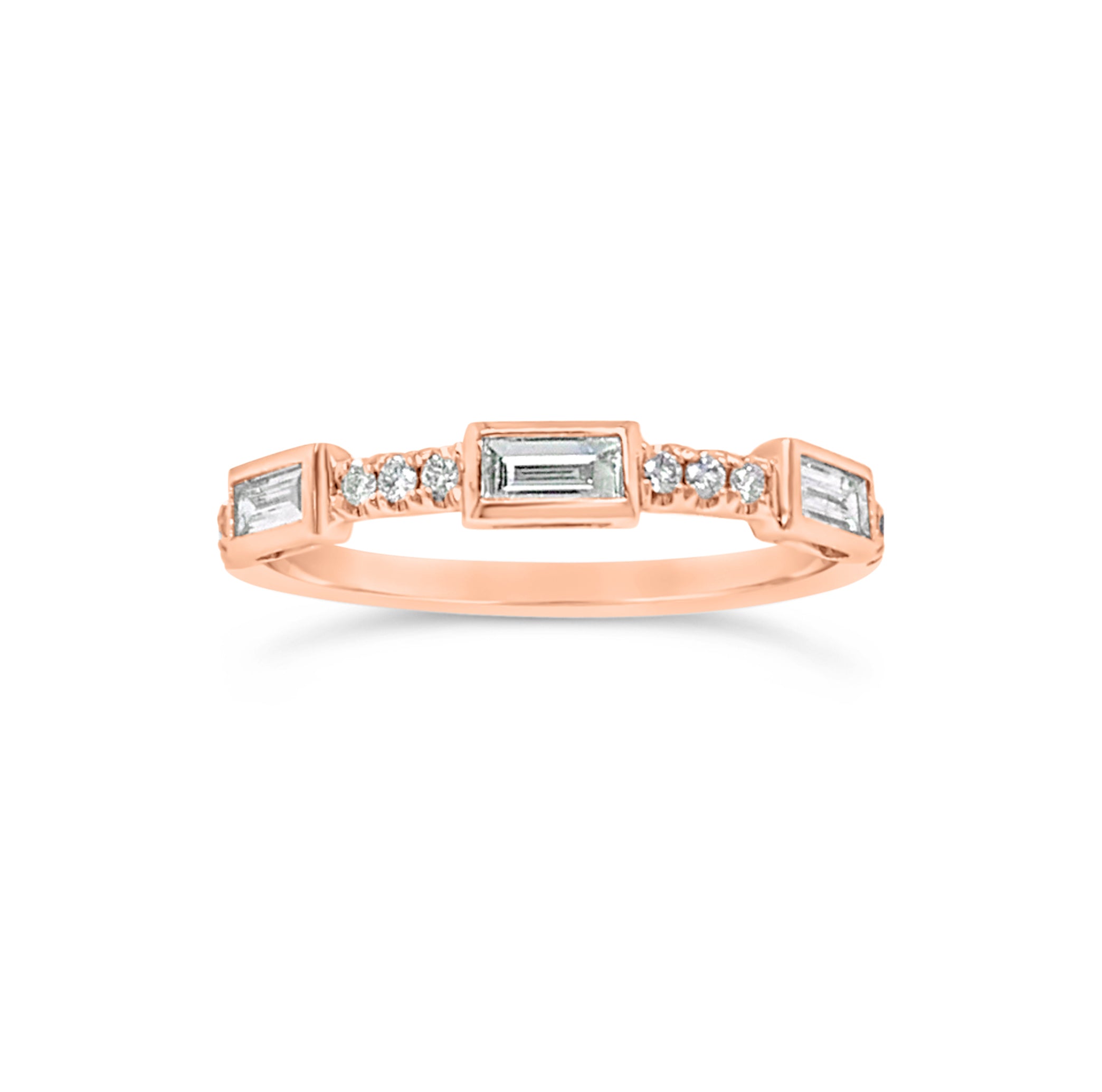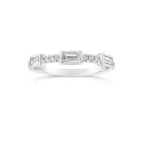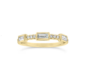 This elegant diamond wedding band is unique in a subtle way. It features three glistening diamond baguettes, interspersed with round-cut diamonds in intricate prong settings.