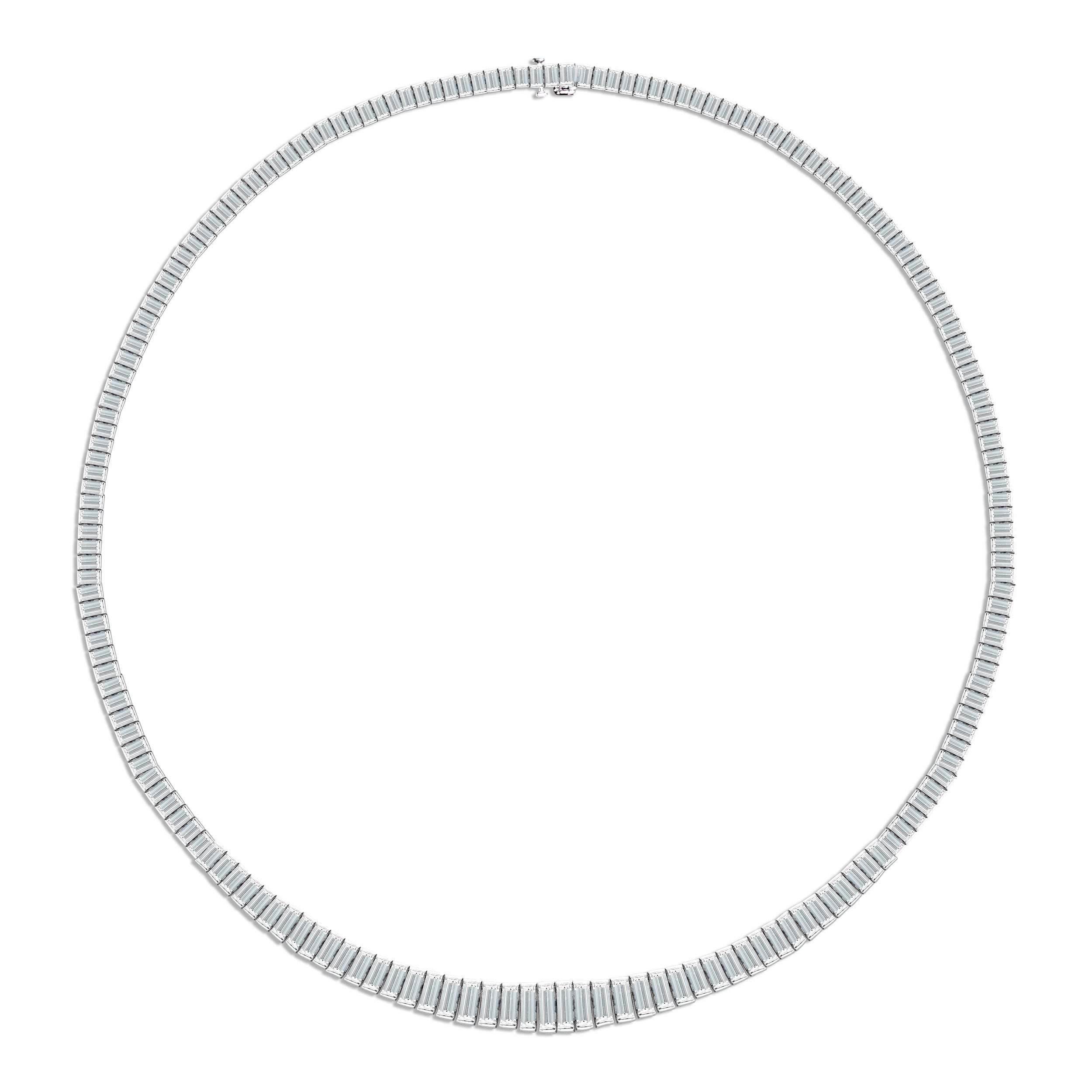This sleek tennis necklace features a remarkable 26.55 carats of shimmering diamond baguettes. It is a fantastic gift to commemorate any milestone.