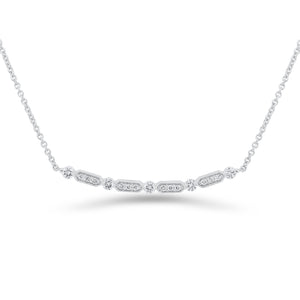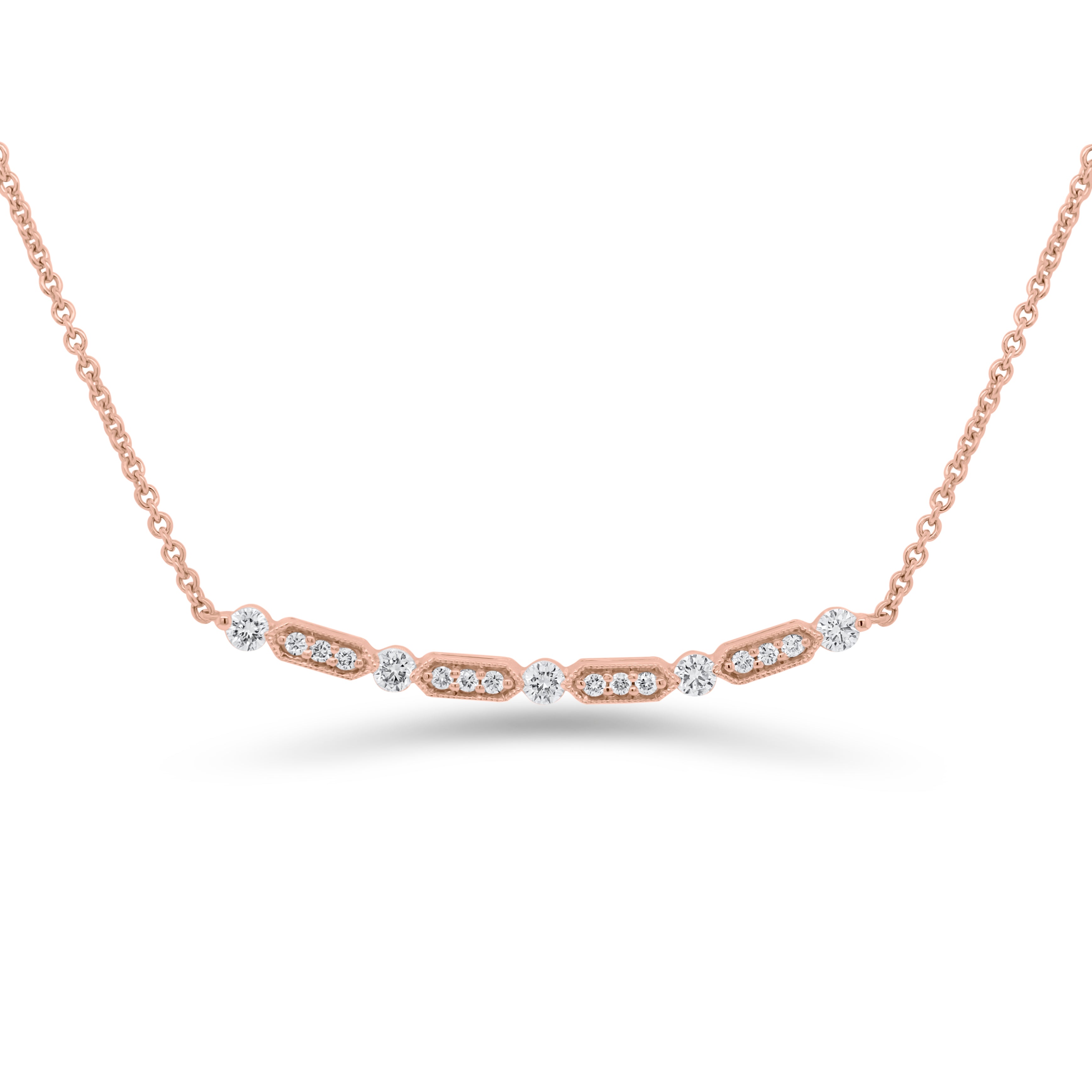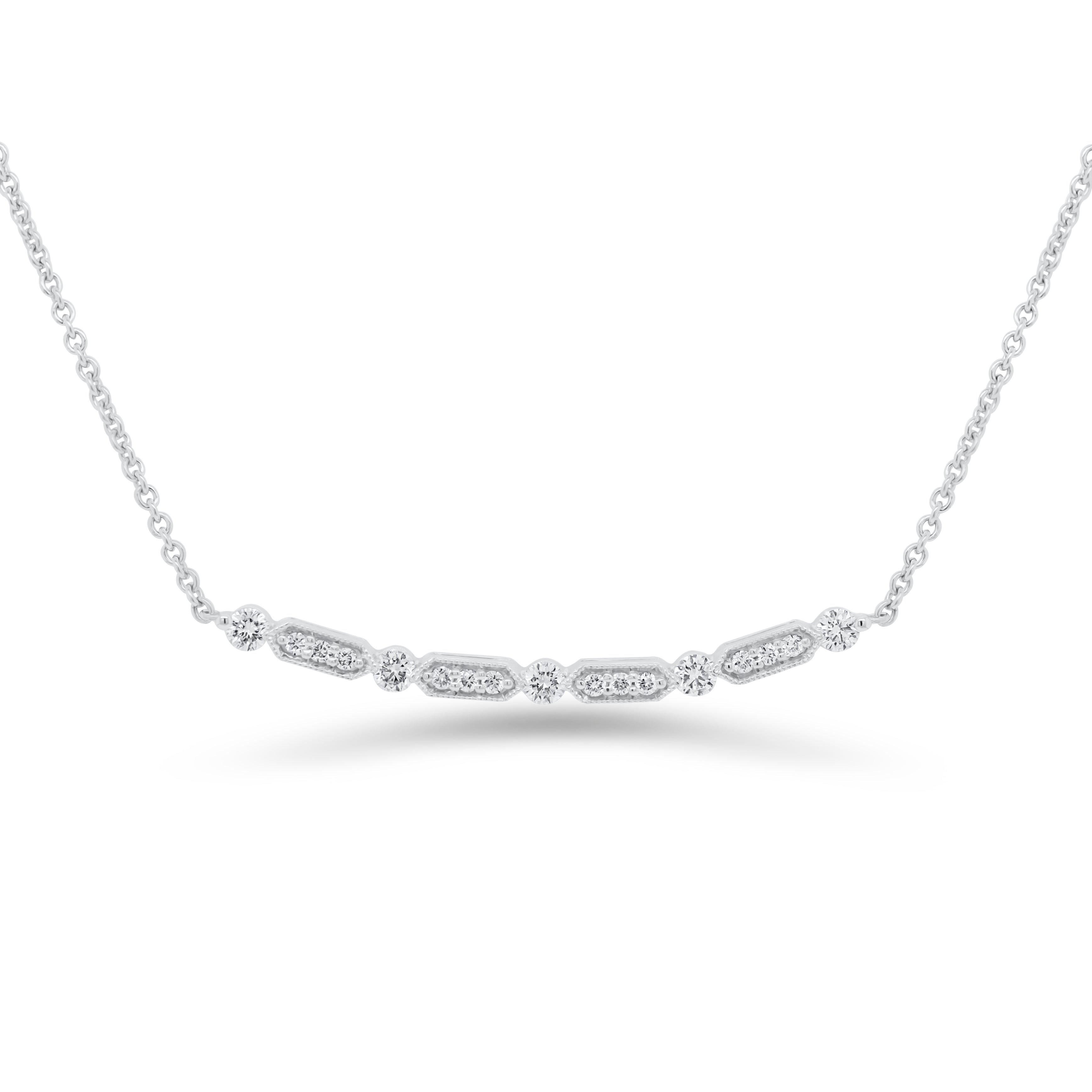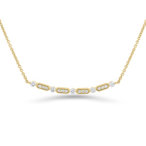 This chic 18K gold necklace features intricate bar stations dotted with diamonds, with round brilliants set in between. It’s an easy way to introduce a dose of sparkle to your everyday looks.