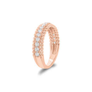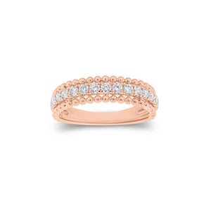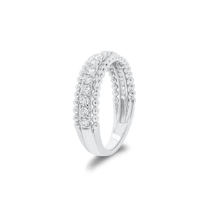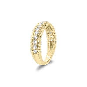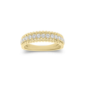 Add an intricate layer of sparkle to your finger with this elaborate fashion ring. Featuring a row of diamonds bordered on either side by lustrous beaded gold, this piece looks chic worn solo or layered. It could also be worn as a wedding band to complement a simple engagement ring.