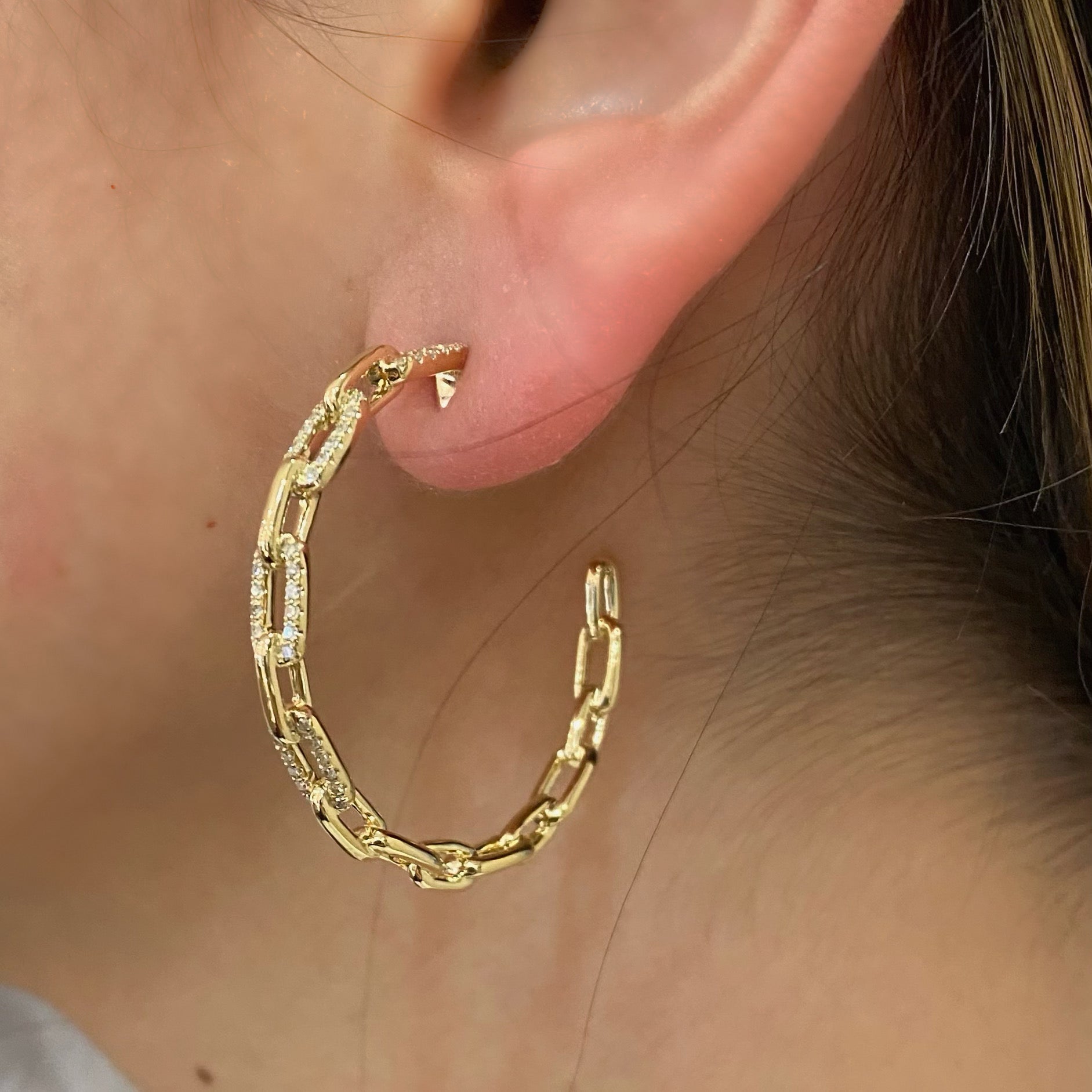 Why not upgrade your standard gold hoops to something a little more unique? Featuring a pattern of 14K gold and pave diamond links, these open hoop earrings are modern, cool, and chic.