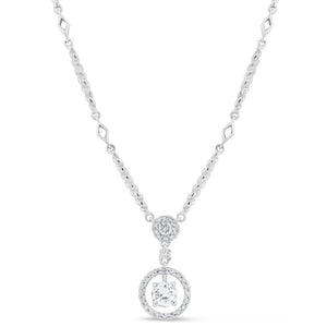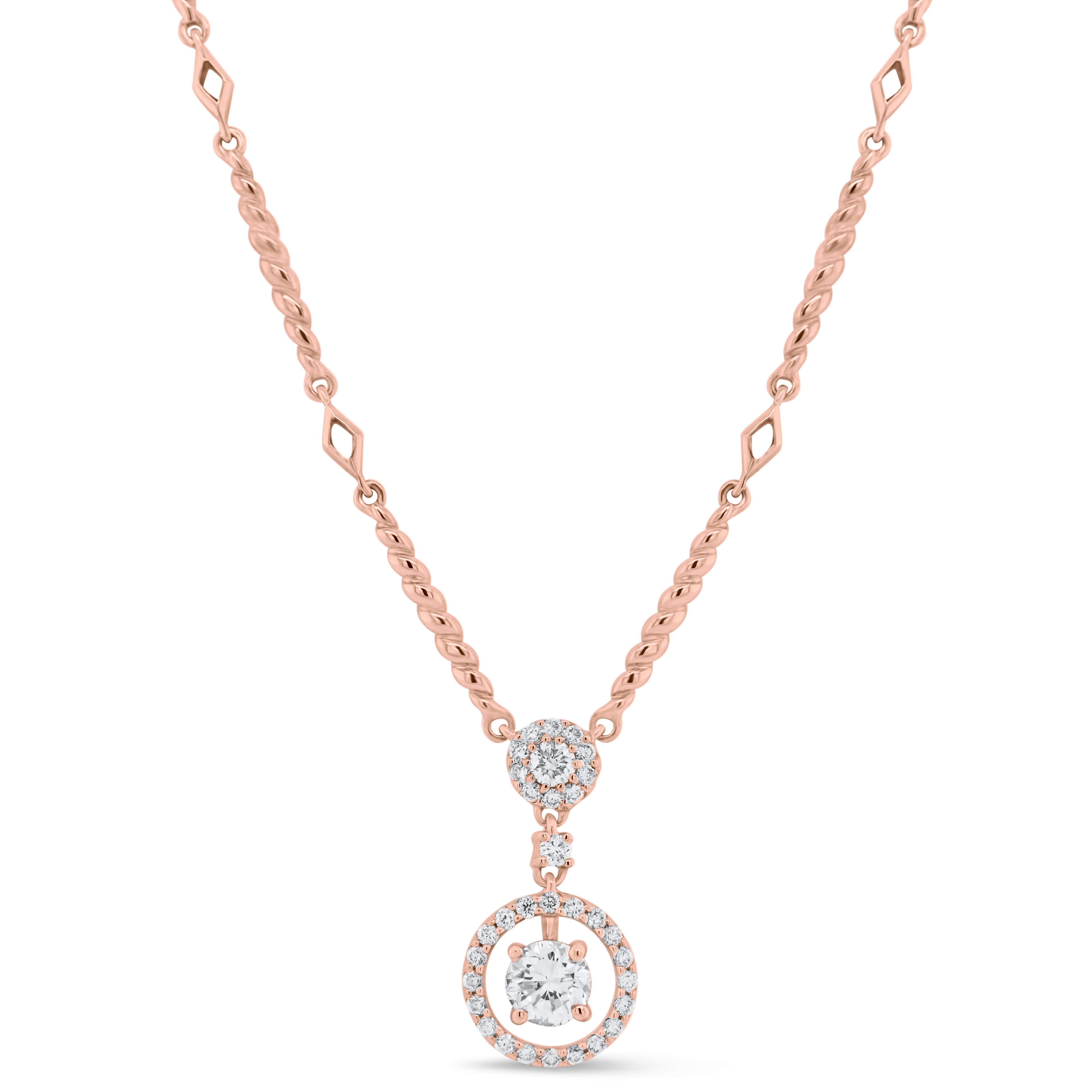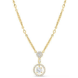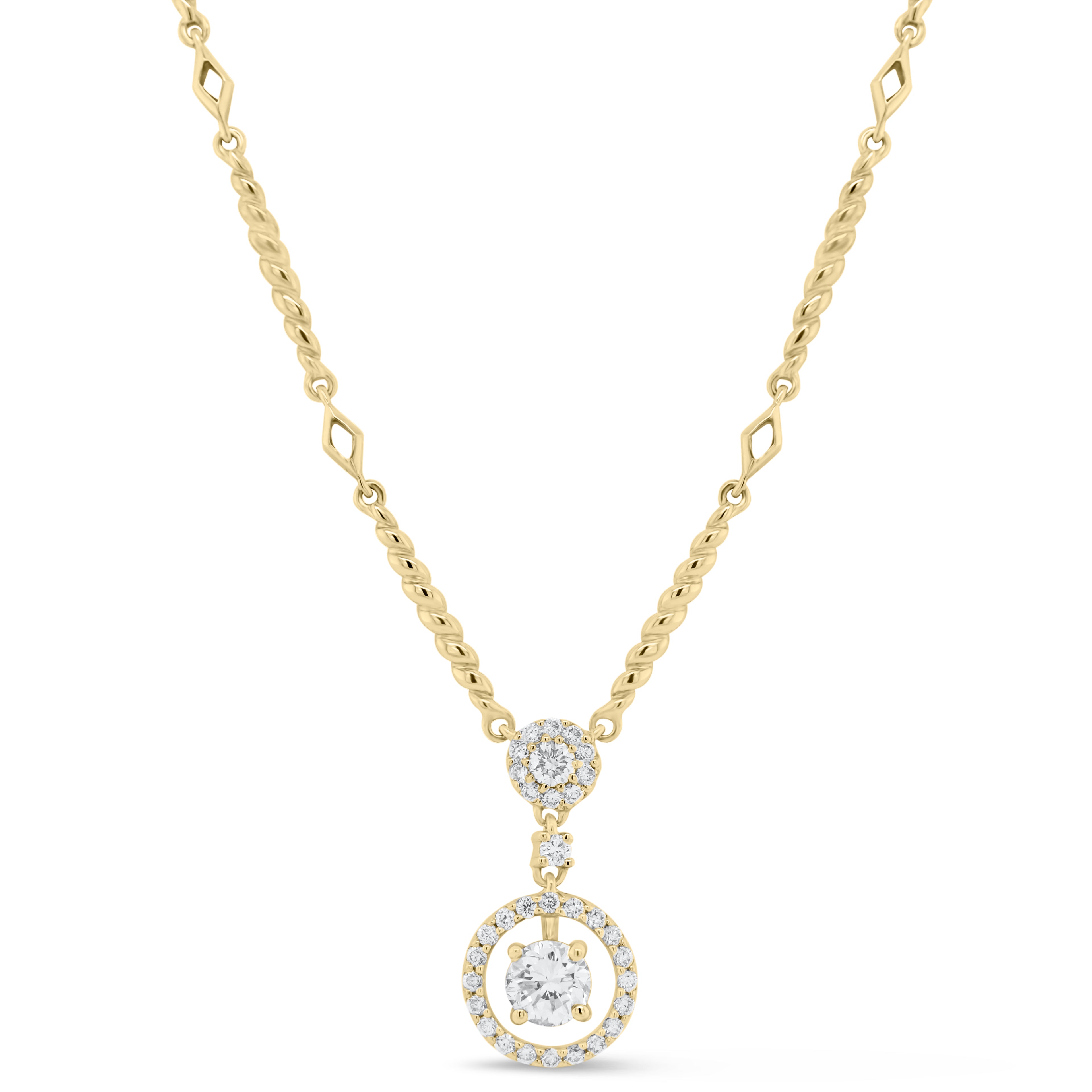A classic, with a twist – this stunning necklace features a 0.45 ct diamond surrounded by a sparkling halo and suspended from a diamond drop. Diamond-shaped stations accent its chain of shining 18K gold spirals.